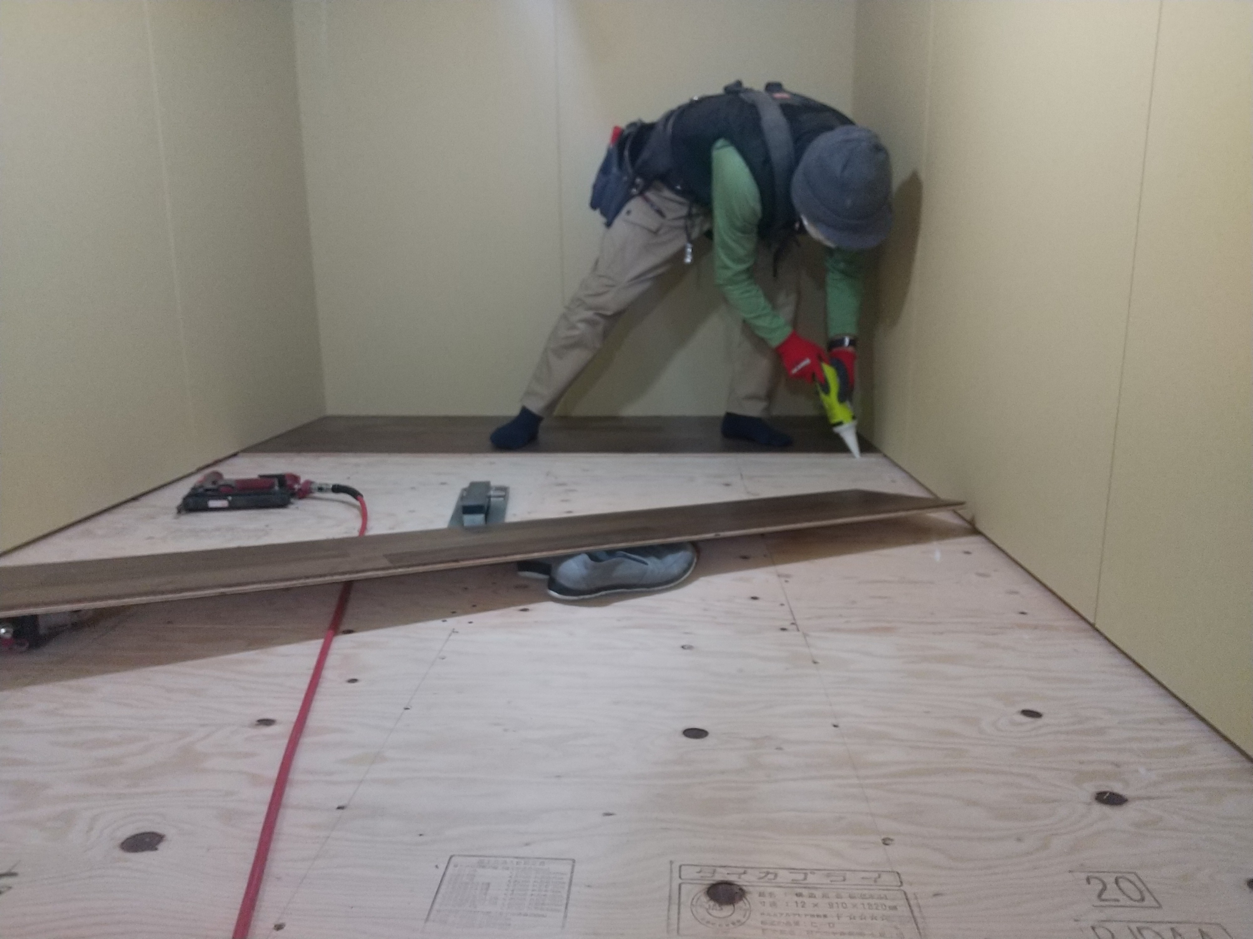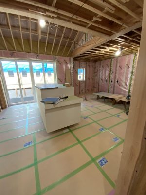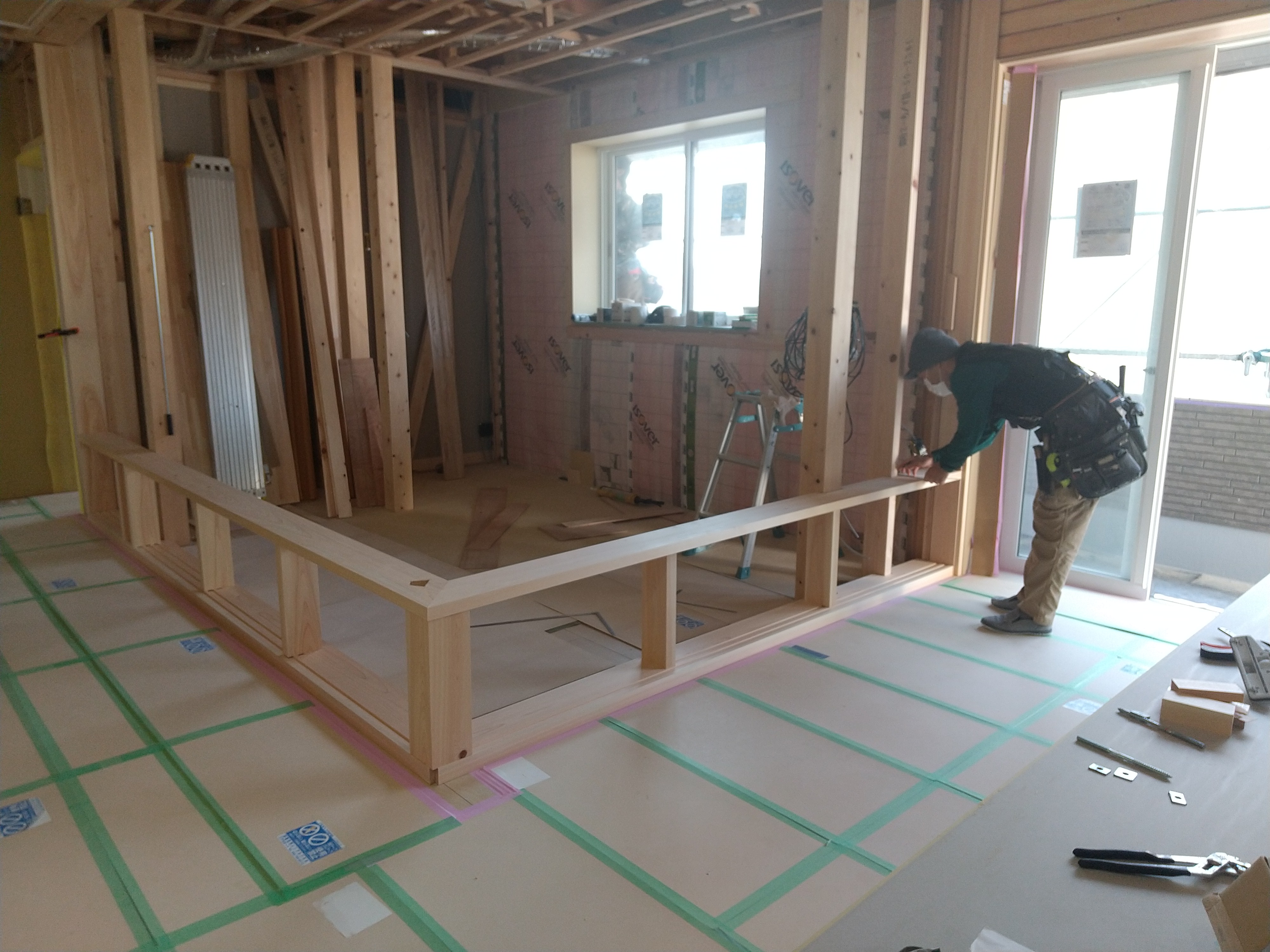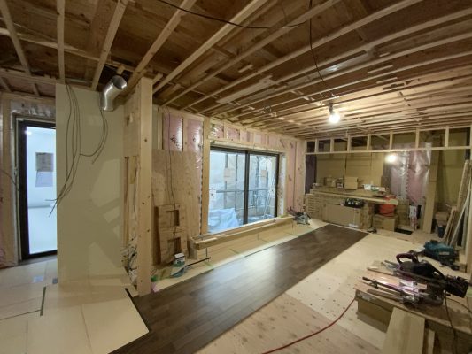 1階は、間仕切り壁、天井の下地が組み終わり、床材を張り始めています。PanasonicのベリティスWハードコートのウォールナット色。お手持ちのアンティーク調の家具に合わせて、インテリアを決められました。こちらのフロアーは、無垢材ではありませんが、突板が貼ってありシートの合板フロアにはない自然の木目を楽しんでいただけます。