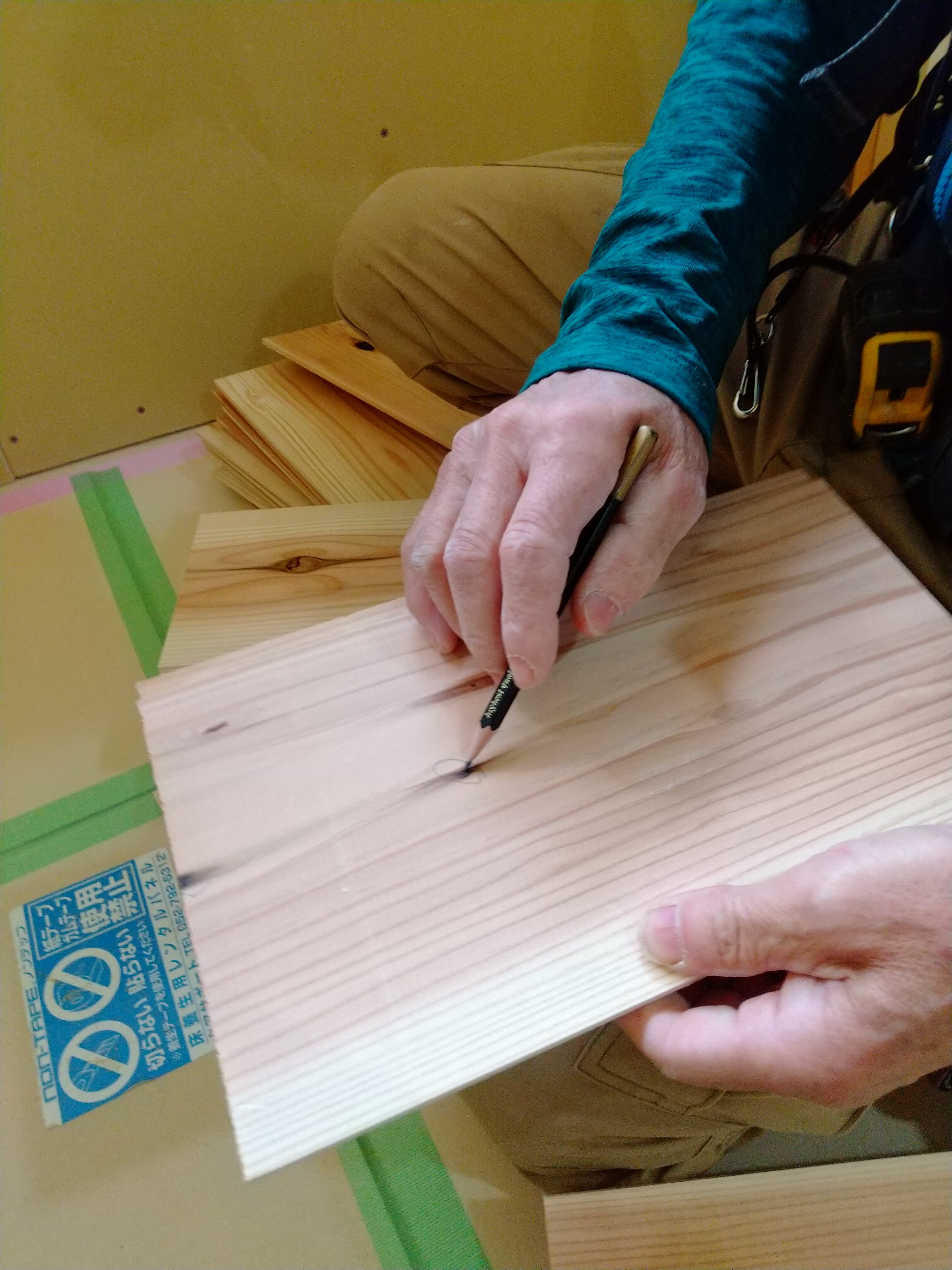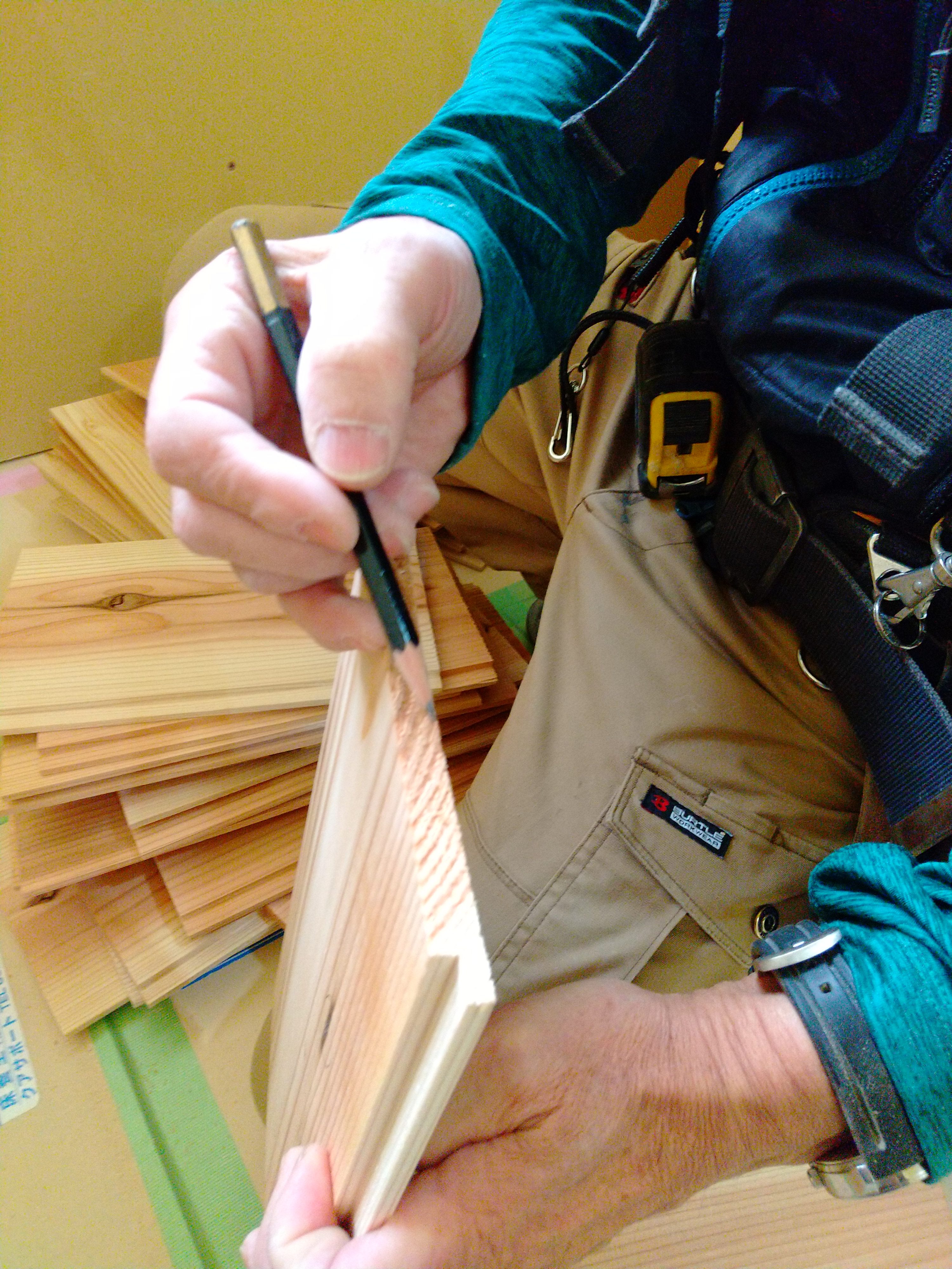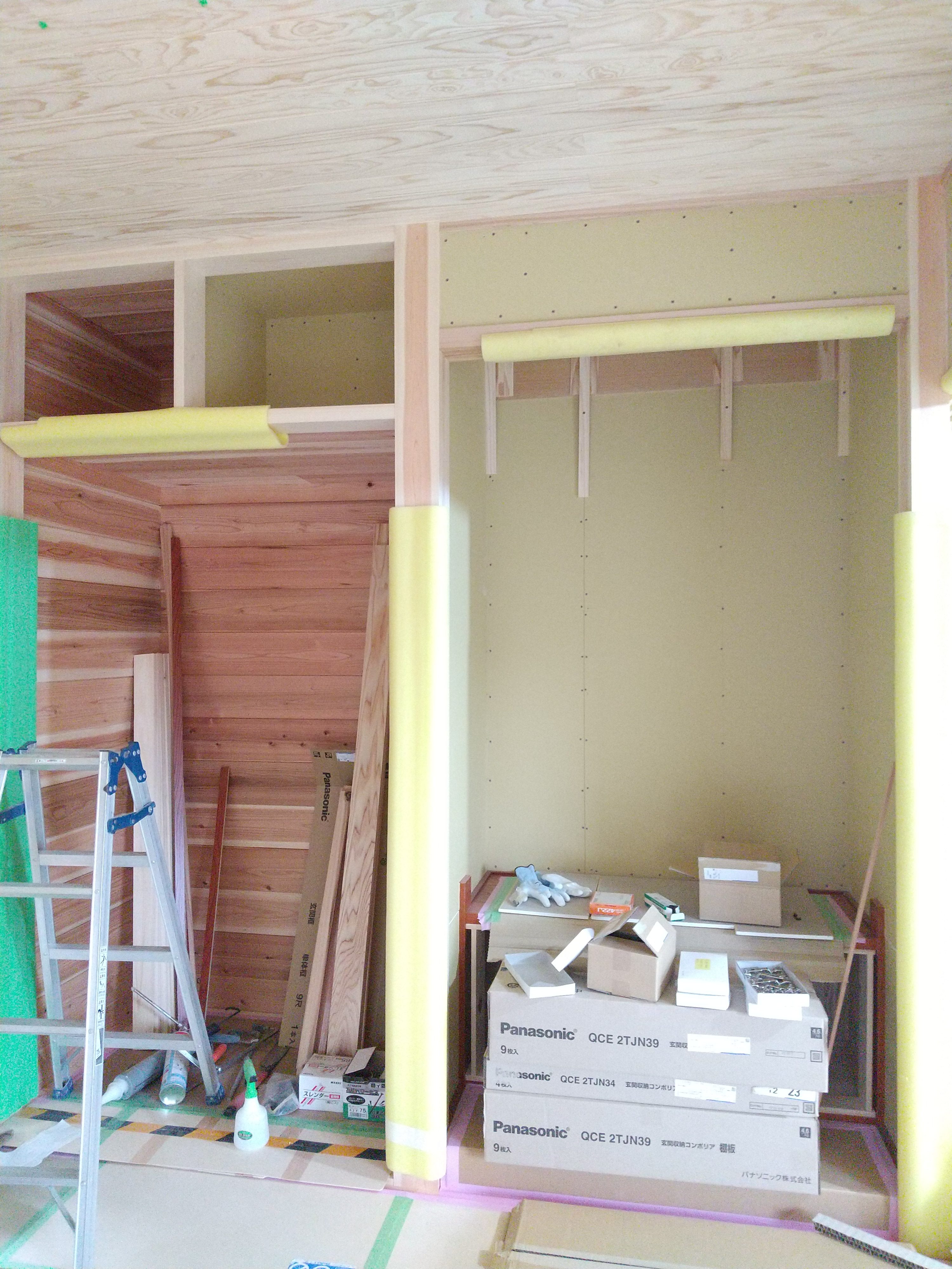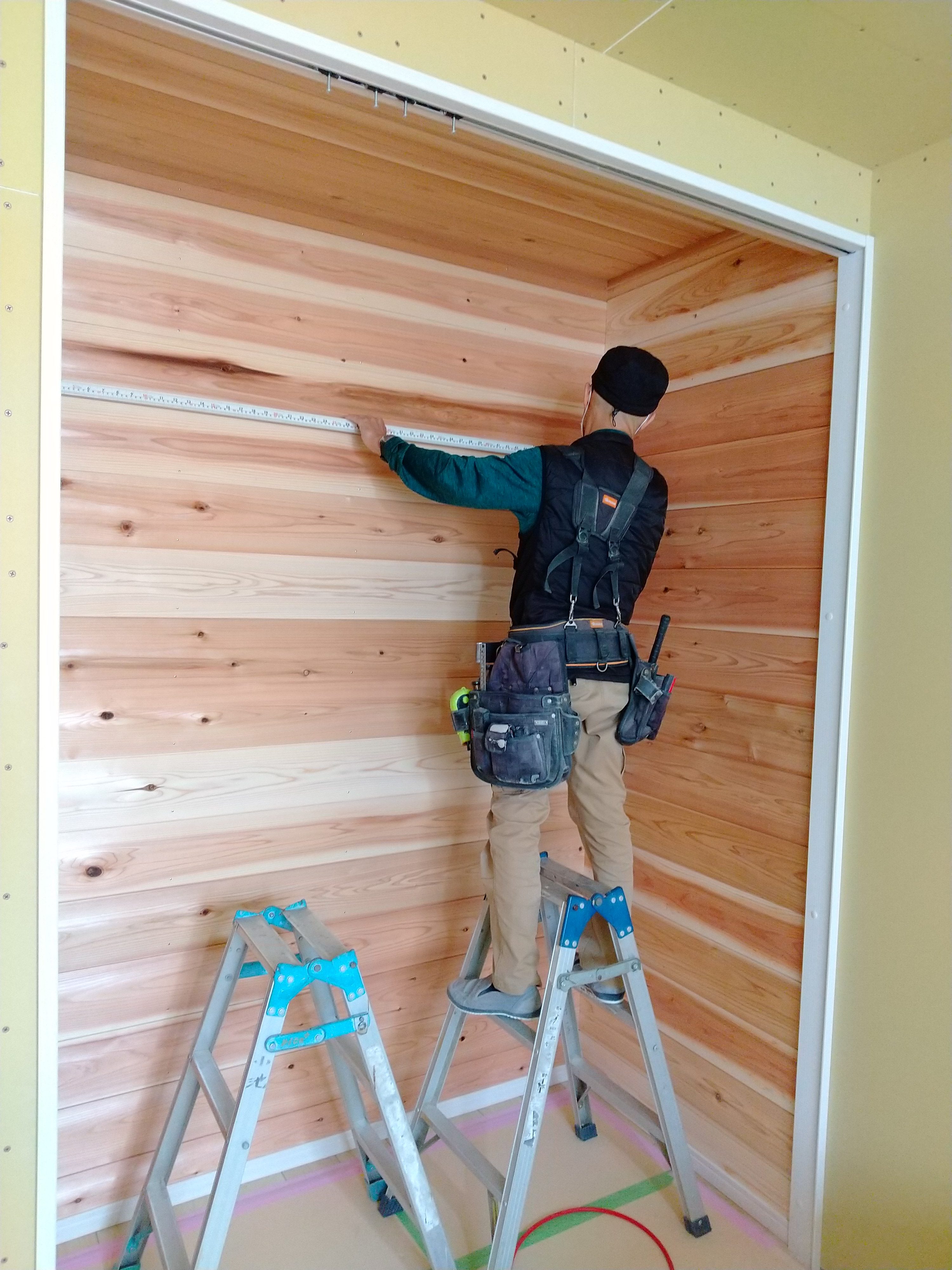 k池大工さんは、クローゼット内の造作を行っています。h典棟梁曰く、杉板を張る仕事はt木君の仕事だったのになぁ~久しぶりで大変だわ~とぼやいていたそうです。と言いつつも、仕事はきっちり。節が抜けている物や水割れははじいて、k池チェックに合格した板だけが張られています。