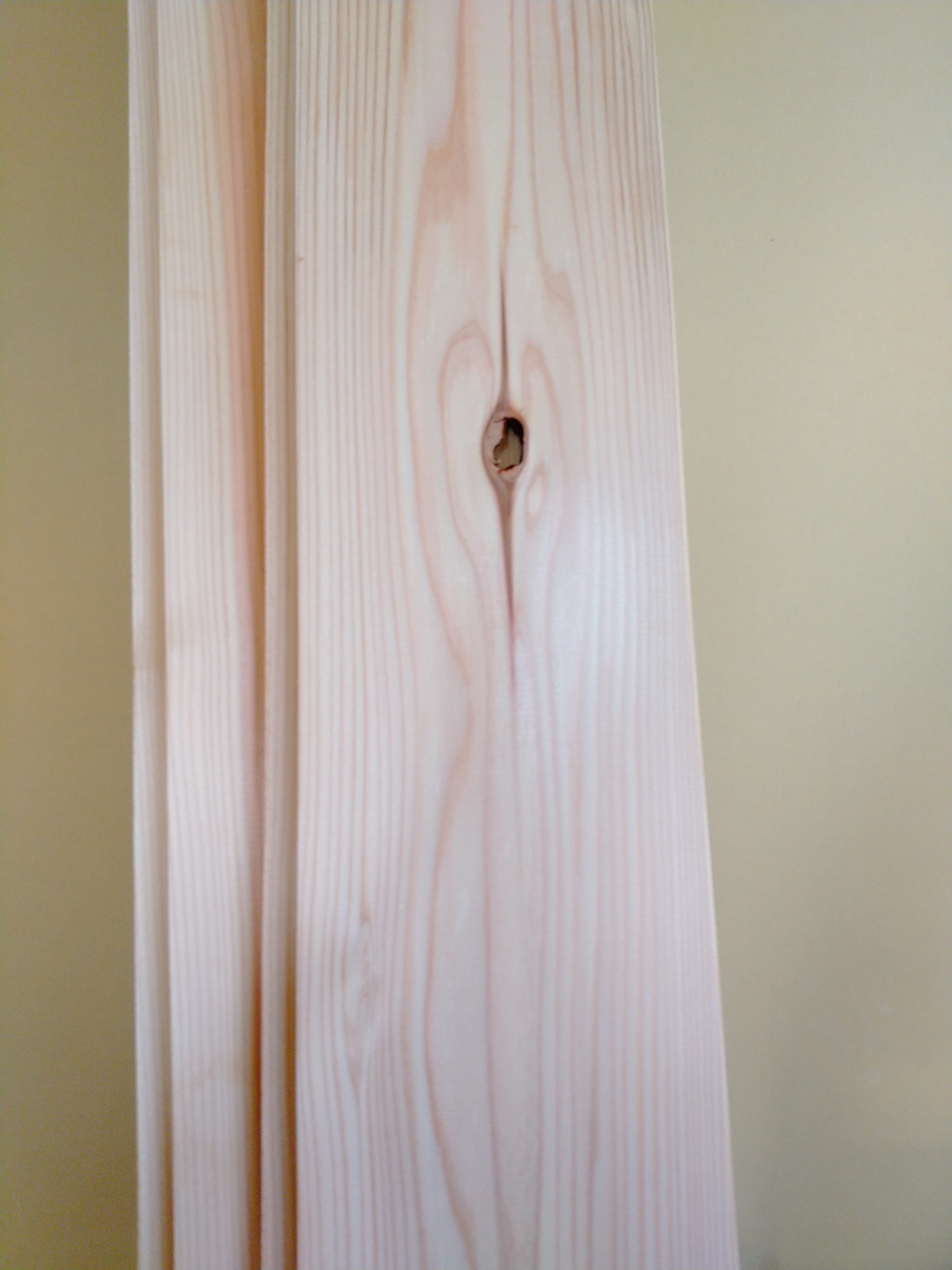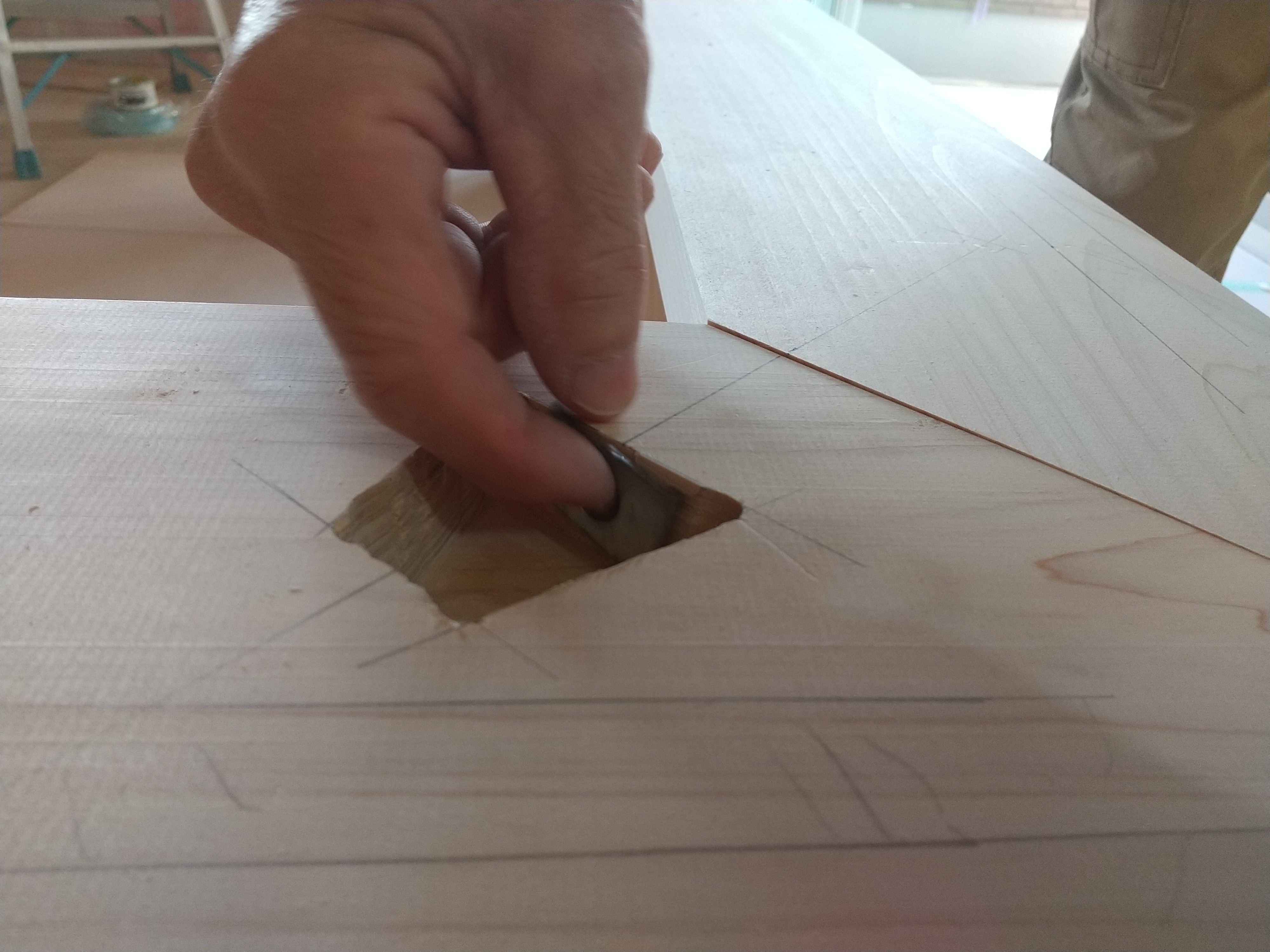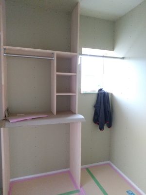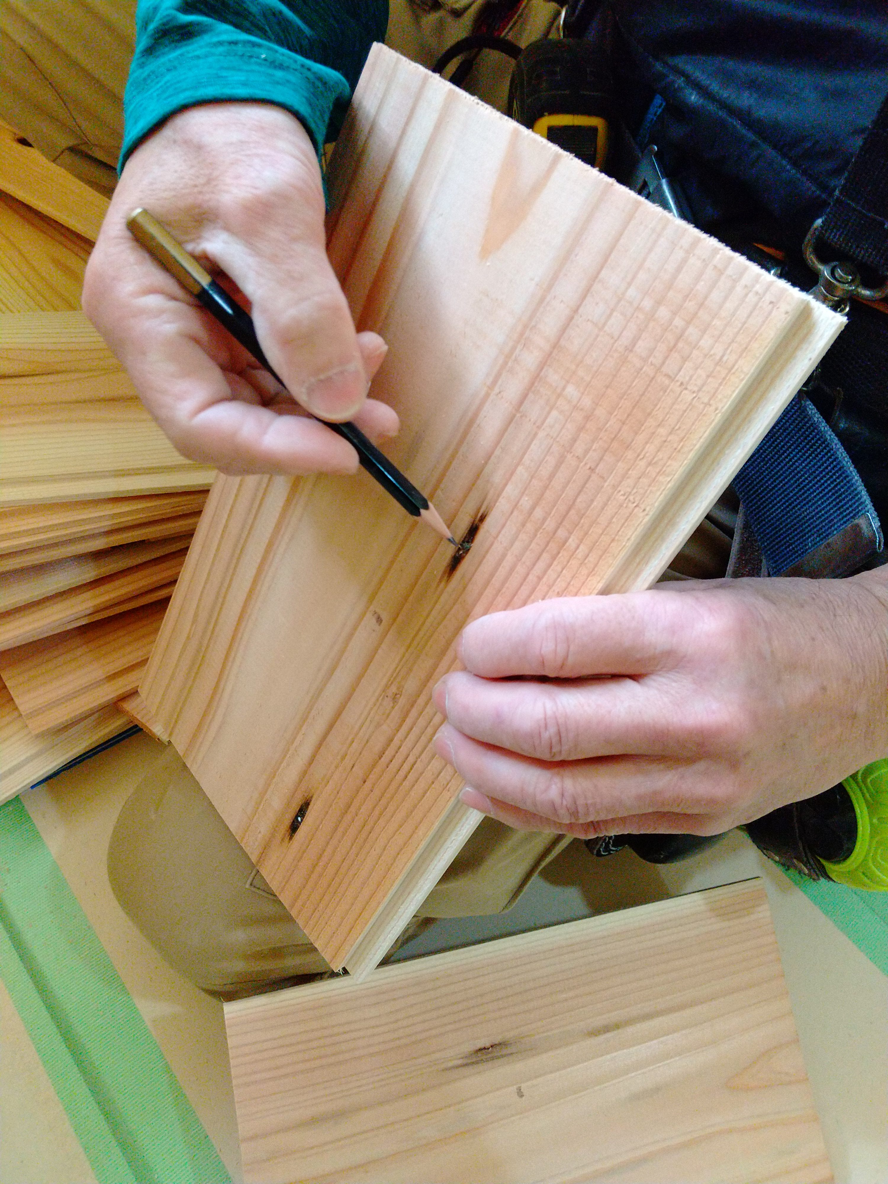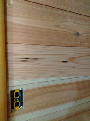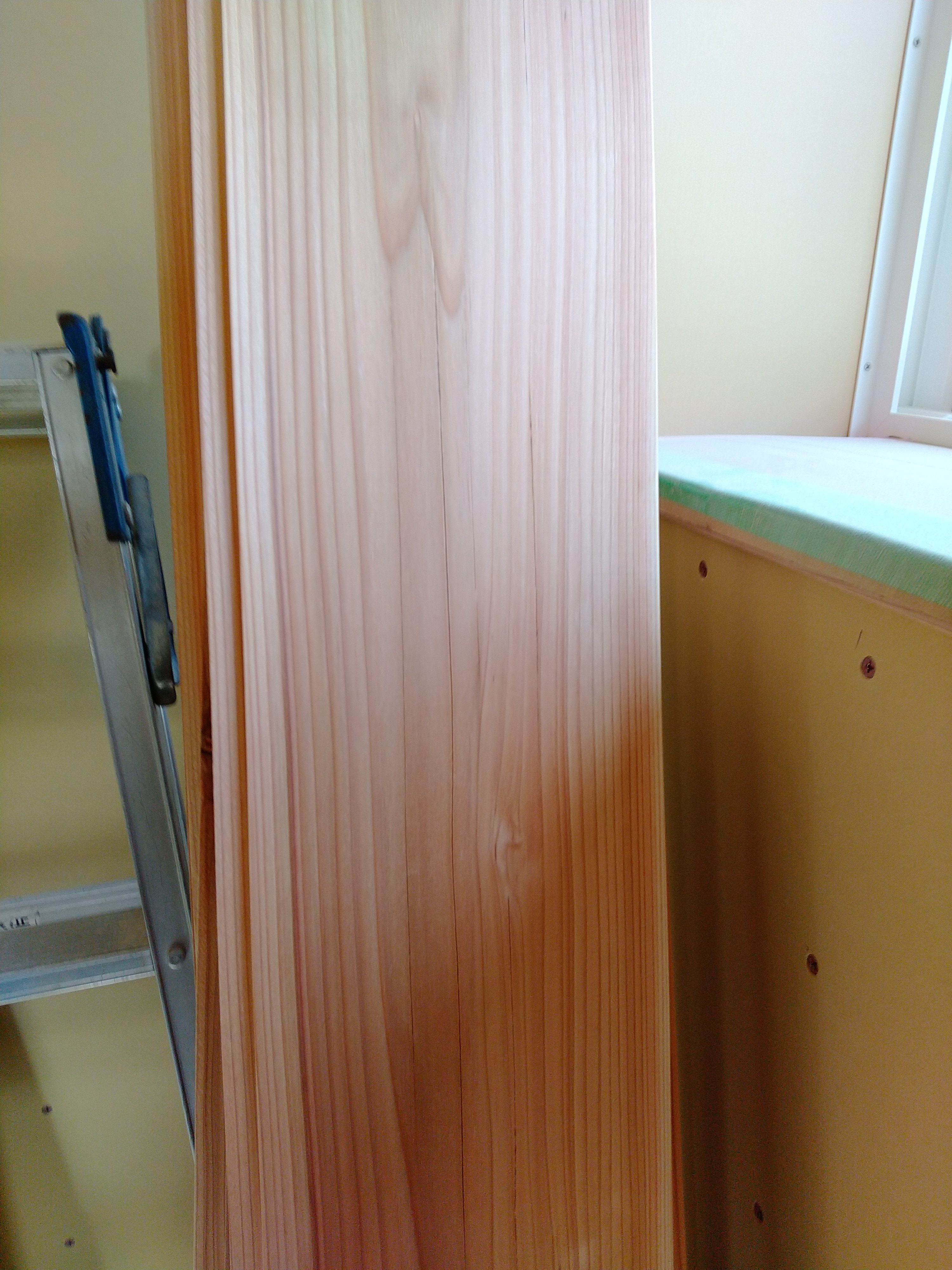 k池大工さんは、クローゼット内の造作を行っています。h典棟梁曰く、杉板を張る仕事はt木君の仕事だったのになぁ~久しぶりで大変だわ~とぼやいていたそうです。と言いつつも、仕事はきっちり。節が抜けている物や水割れははじいて、k池チェックに合格した板だけが張られています。