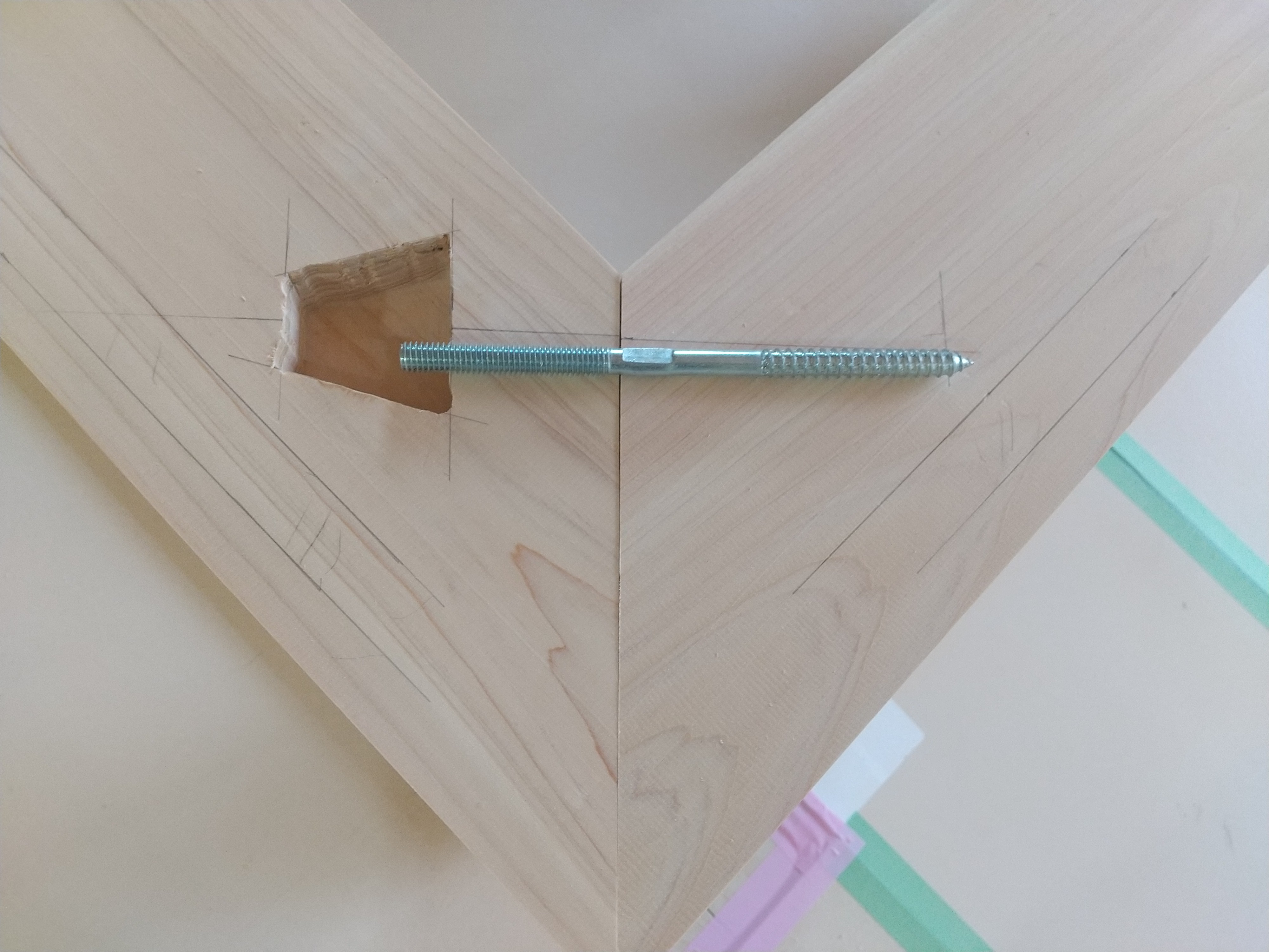 今日は、2階のタタミコーナーを施工中。鴨居のトメの部分は、上端の見えない部分でこの様にボルトを仕込みナットで締めています。