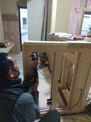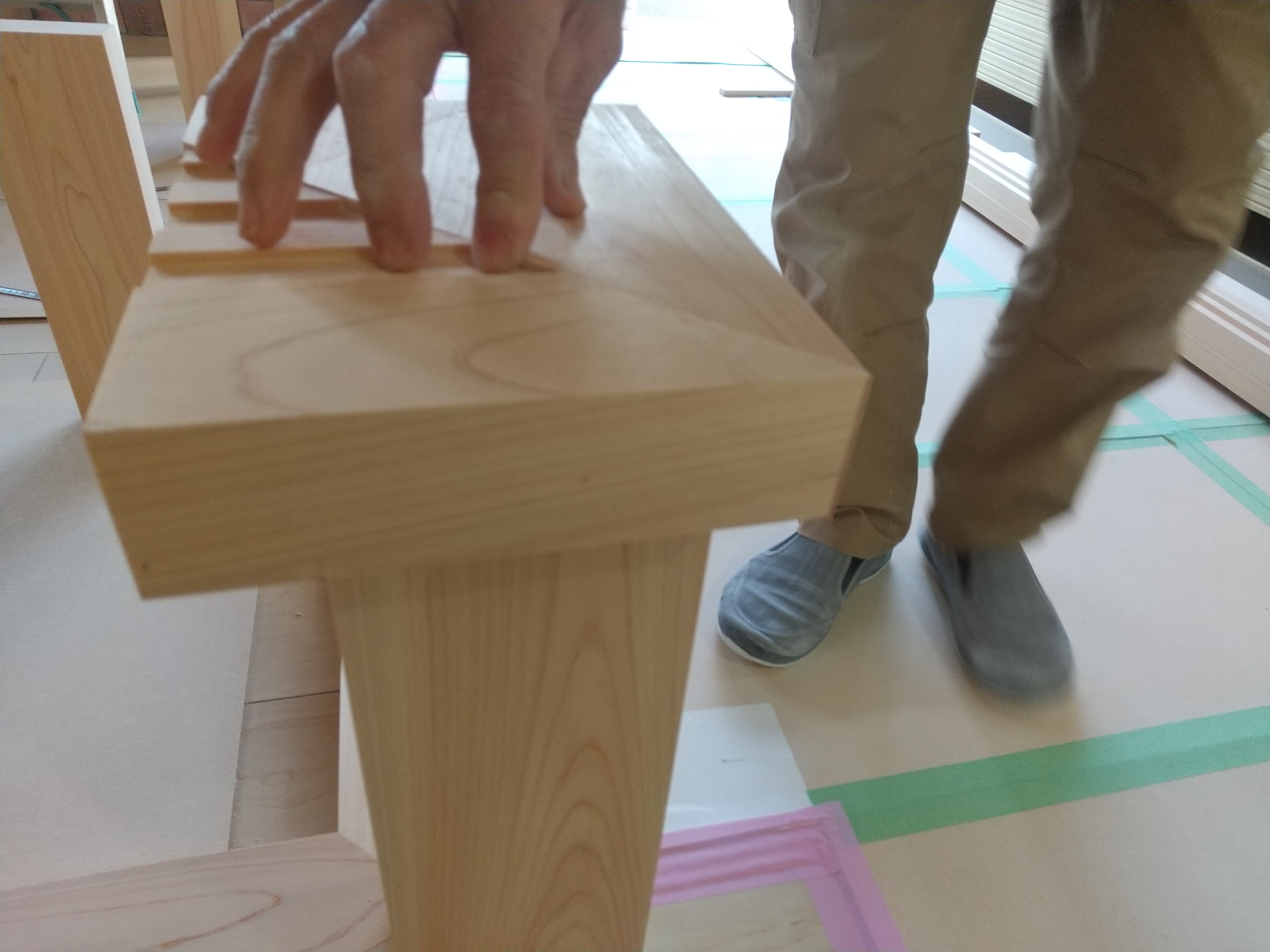巨匠は段取り名人です。今日は、一気に鴨居を取り付けています。一人でどうやって鴨居を取り付けているか見ていると、なるほどね~って感じです。「若い人は、片手で支えながら取り付けれるけどね」って、頭いい。動きに無駄がなくて、スマート。だから早いんですね。