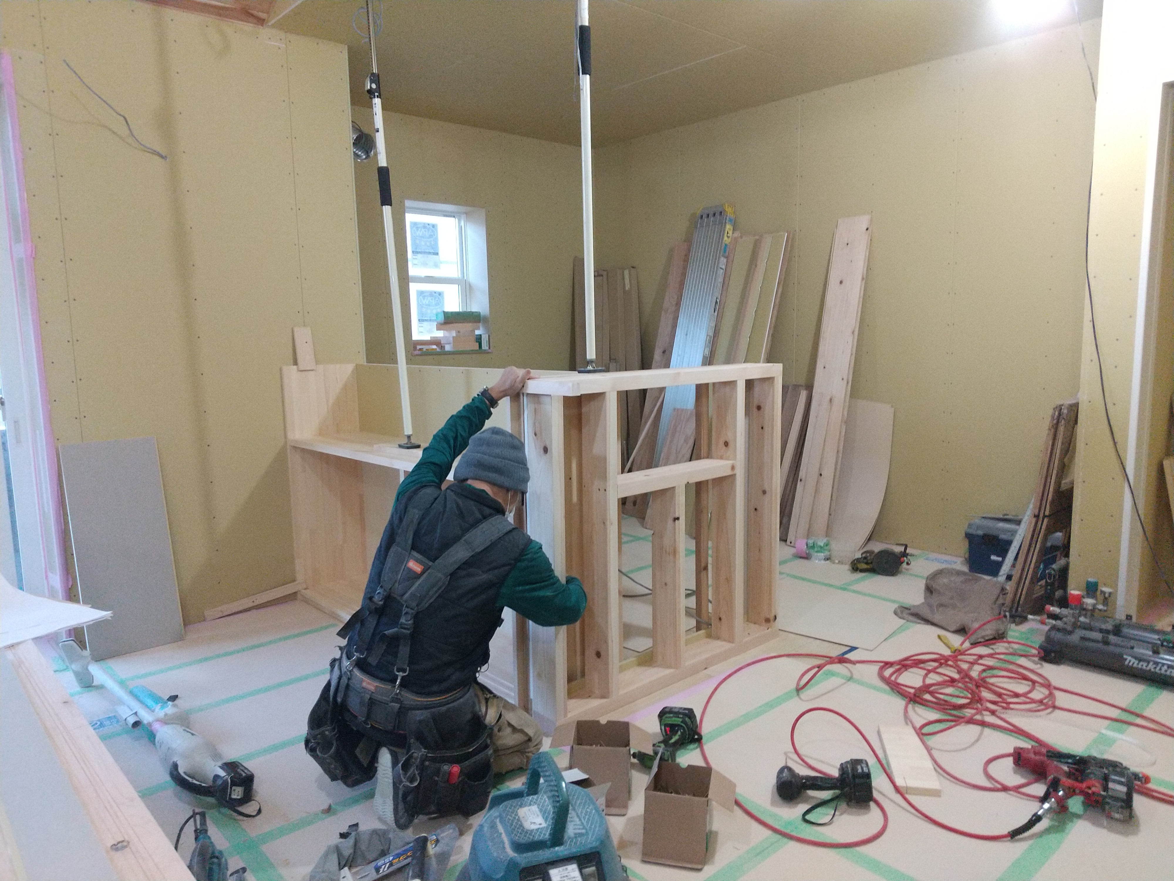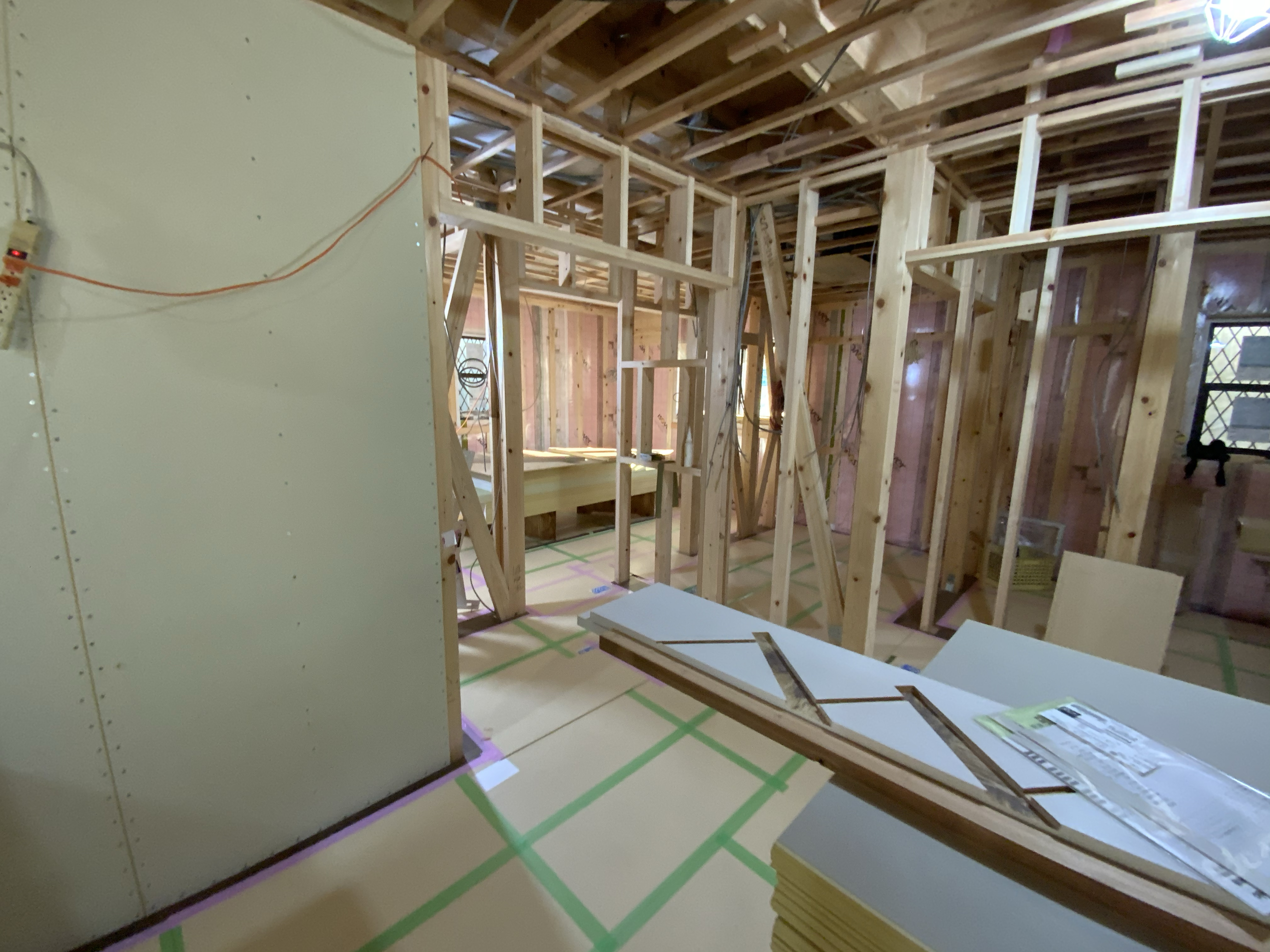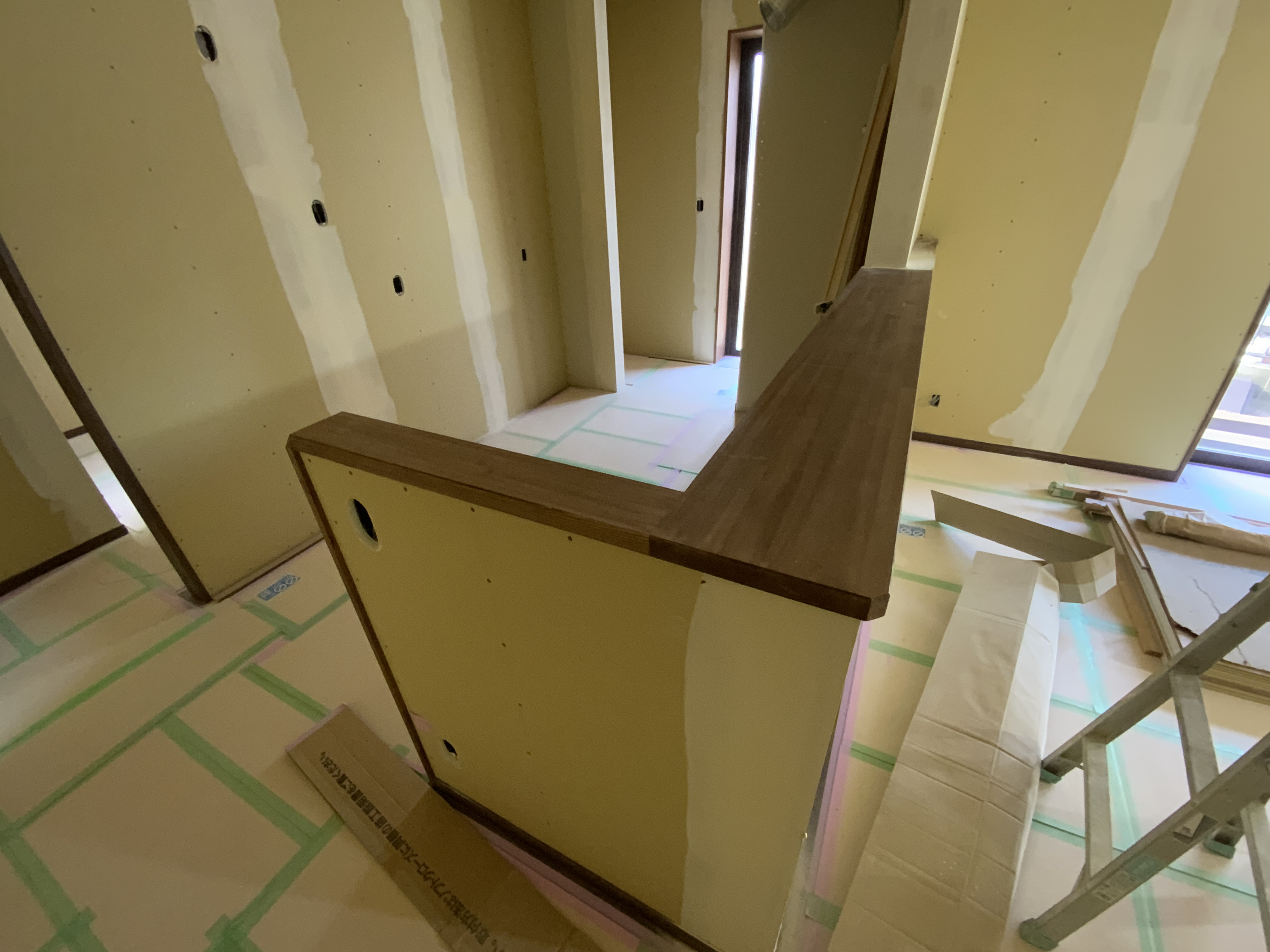 f電気のh場さんもキッチン周りの配線をしに来てくれました。キッチン手元灯のスイッチの位置を真ん中に計画していましたが、端の方がキッチンから回り込まなくても付けやすいんじゃない?とアドバイスをもらい、変更してもらいました。現場に来ると職人さん達から、何かとアドバイスをいただけるので、ありがたいです。次に活かせるようにしたいと思います。