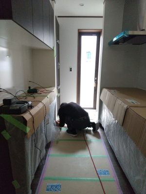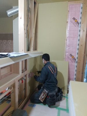 おや?誰かと思ったら、h典棟梁。木工事後に取り付けられた設備機器(キッチンや洗面)周辺の造作部材(巾木や廻り縁)や、タイル工事の取り合いで取付できなかった建具などを納めに来てくれました。a朗監督もTVボードの扉や、物干し金物などを取り付けたり、不要になった養生を撤去したり。現場はにぎやか。