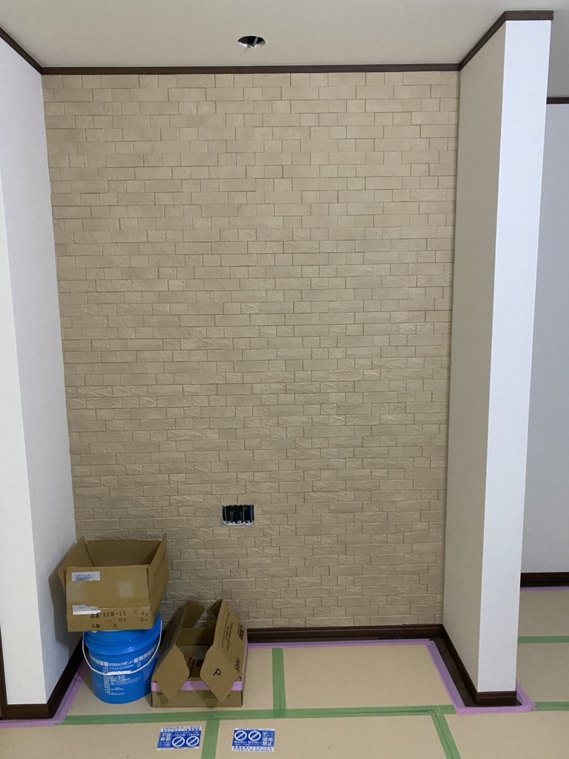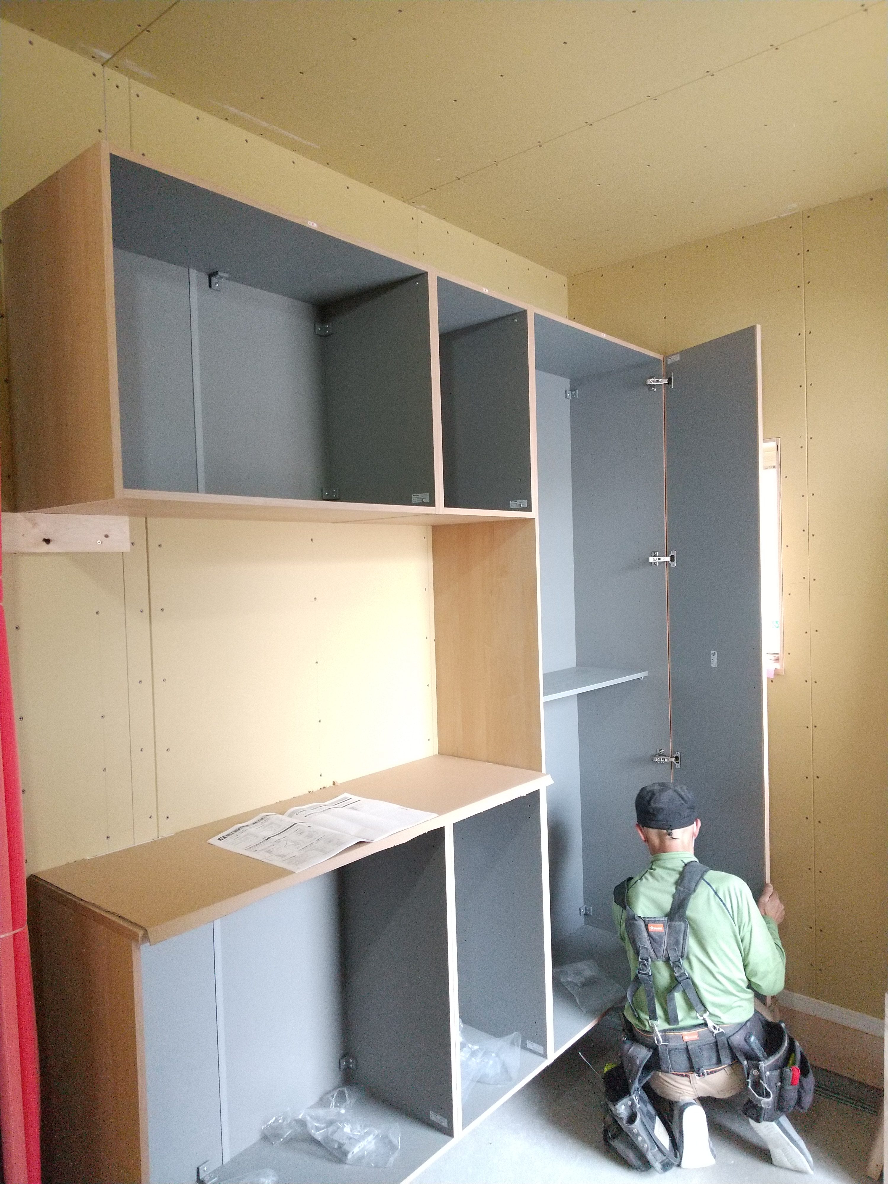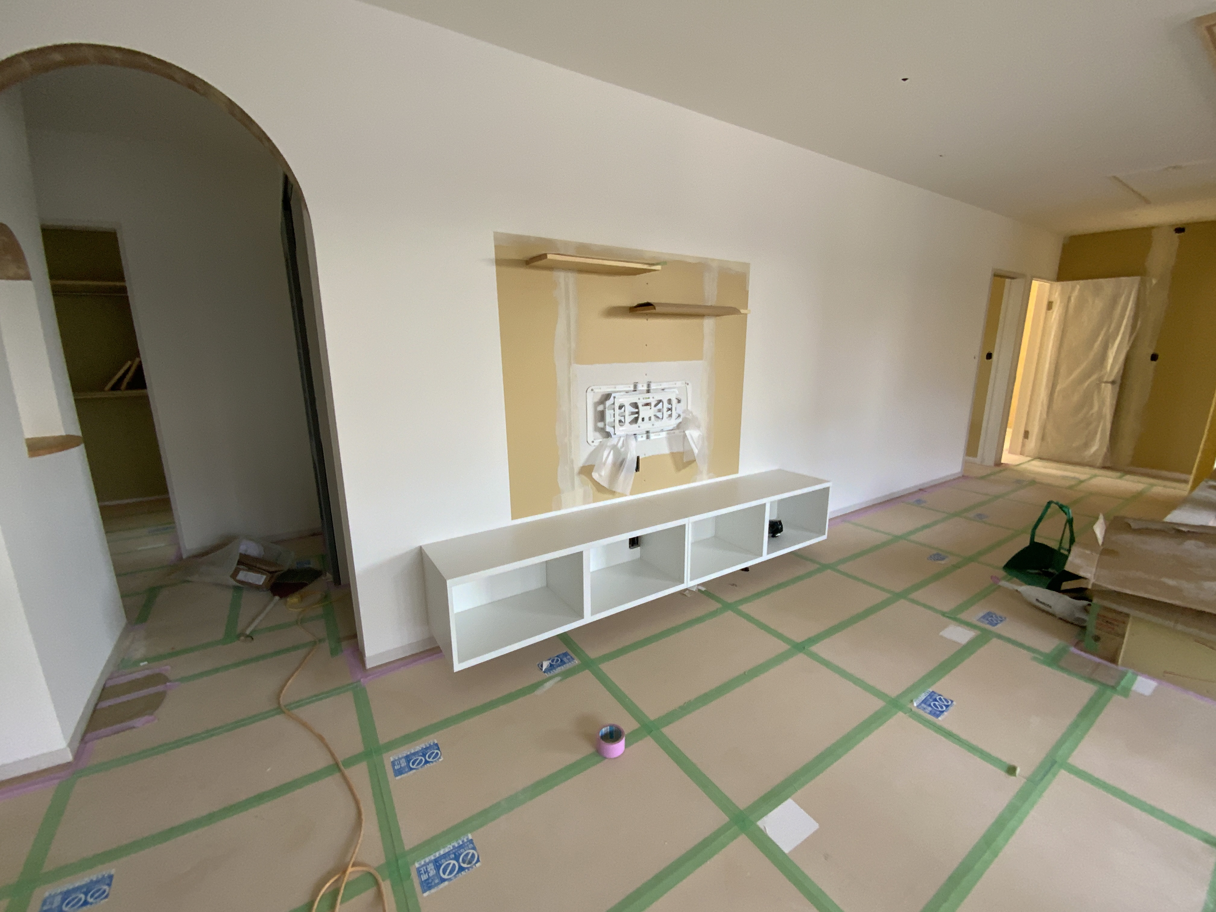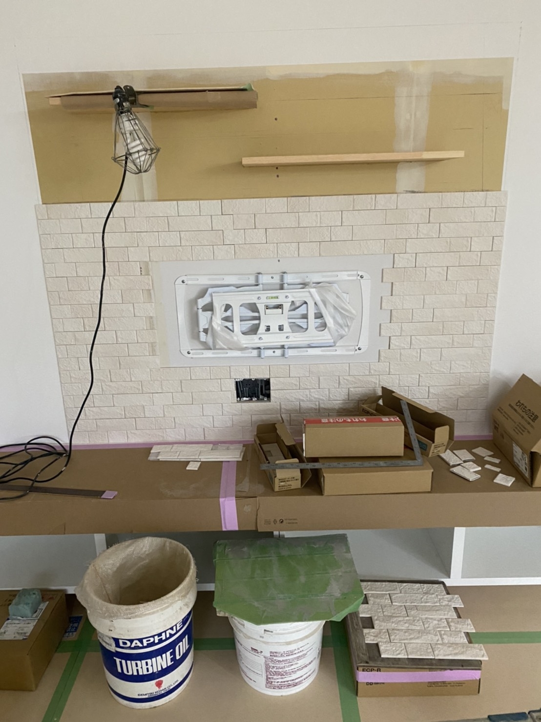 2階もベースのクロスが貼られ、IKEAのTVボードの組み立てと取付けを行いました。クロスが貼られていない部分はエコカラットを貼ります。y香さんのイメージ通りになりますように。
