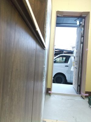 昨日の様子です。k池巨匠が待っていたダクト工事が終わり、天井のブラスターボードを張り終えています。建具の枠付けを終え、壁のプラスターボード張りに入りました。