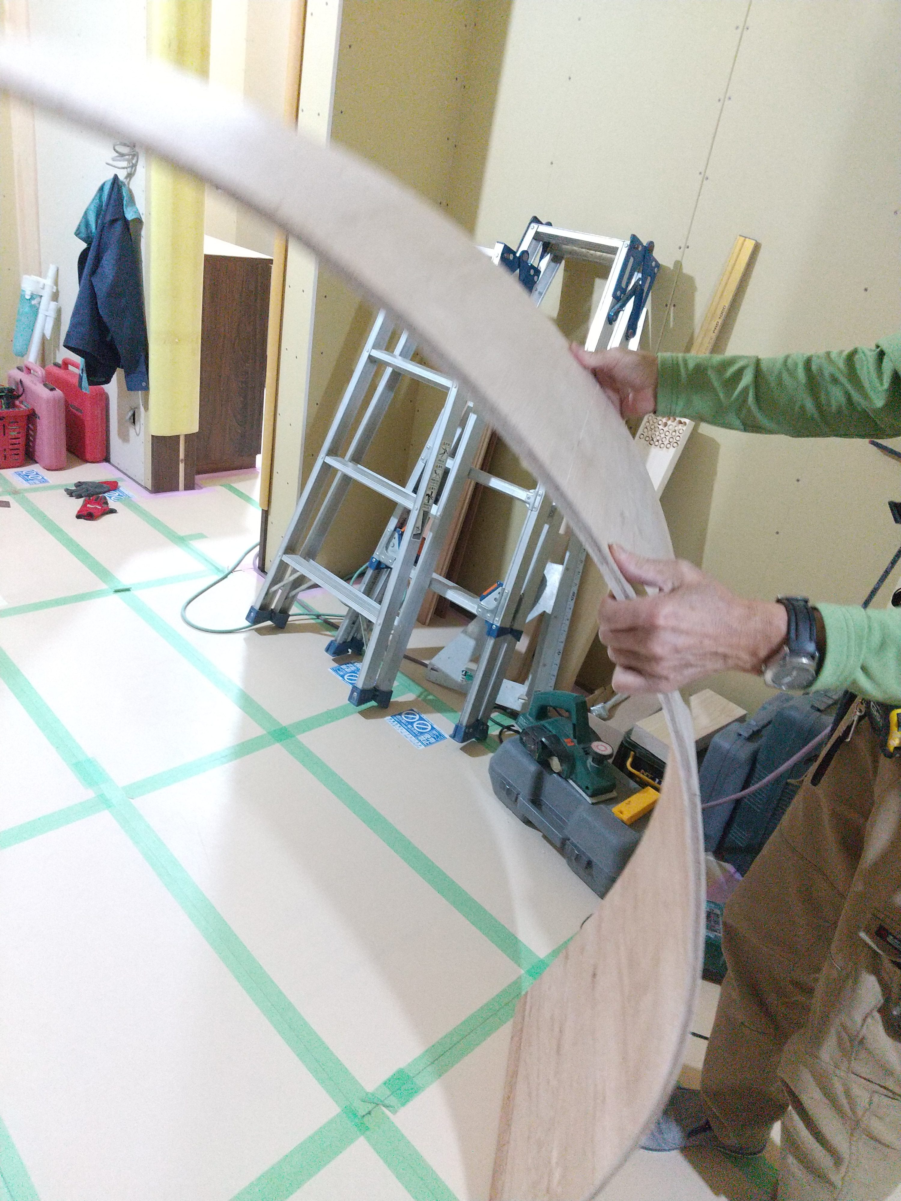 今日は残材もほぼ片付いてきている中、曲げ合板(通称:こんにゃくベニヤ←k池さんだけ?)を見せてもらいました。現場に行った時には、アールの開口やニッチが出来上がっていましたので、どんなものか見れませんでしたが、こんな感じでクニャクニャ曲がります。普通の合板はベニヤを繊維方向をクロスさせて強度を出すのですが、この曲げ合板は繊維方向を揃えているんです。本当にクニャクニャ。