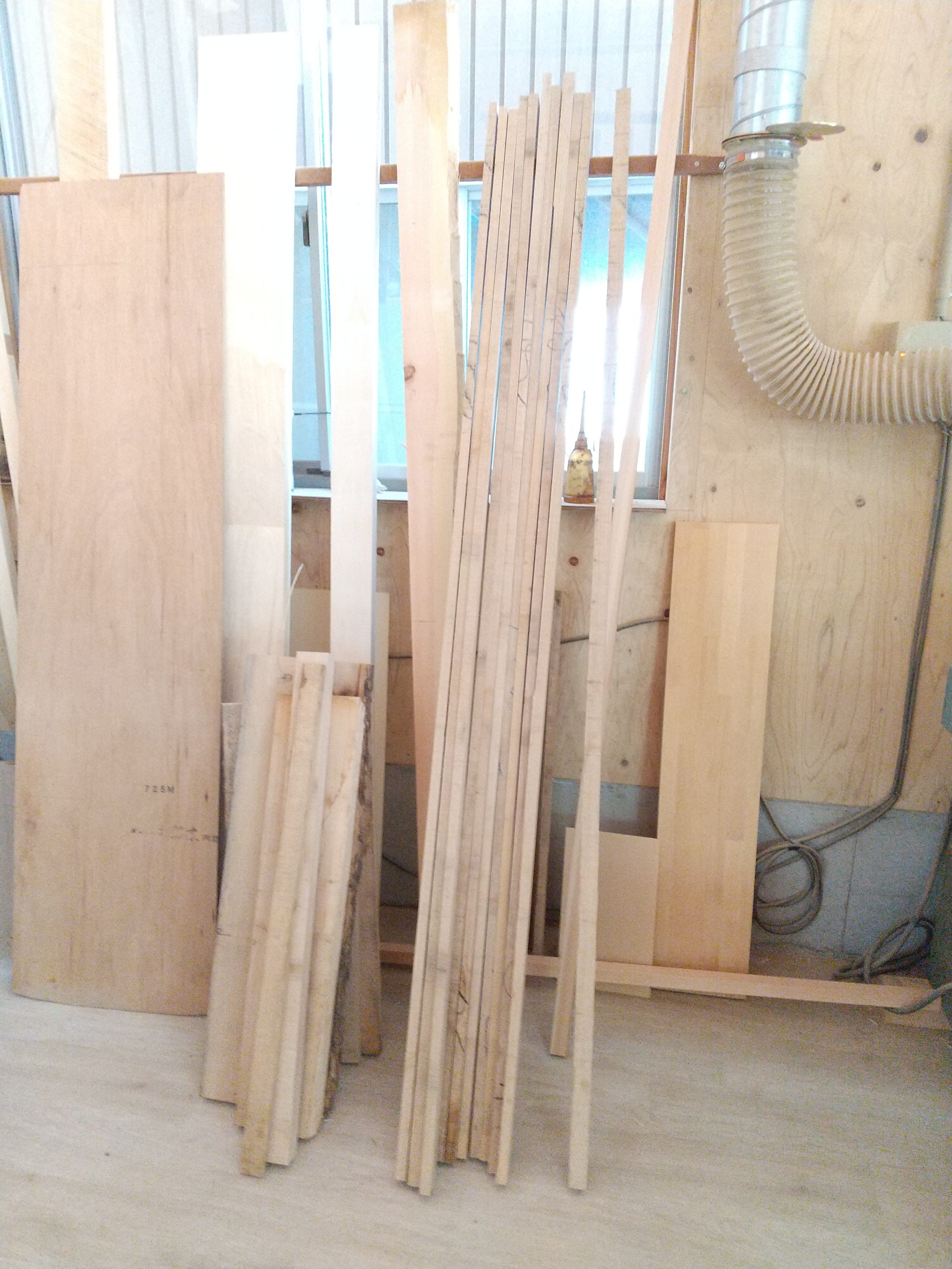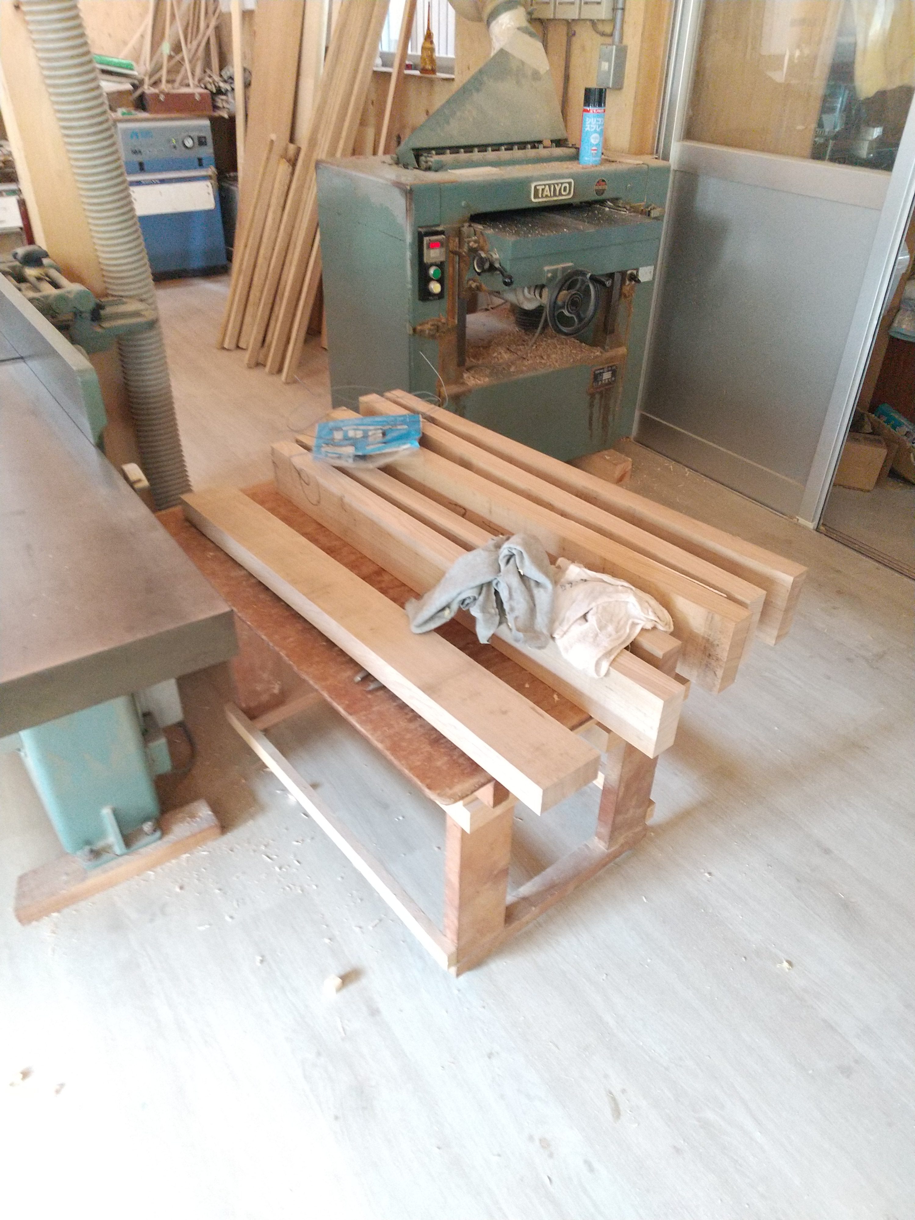 今日は本社会議の帰りに、引手のサンプルを返しにf田建具さんにお邪魔し、製作中の建具はどんな状況か、少し見せていただきました。こちらは1階のLDKと和室の間に納めるタモの框戸の材料です。無垢の板を引き割ったばかりで、乾燥させています。