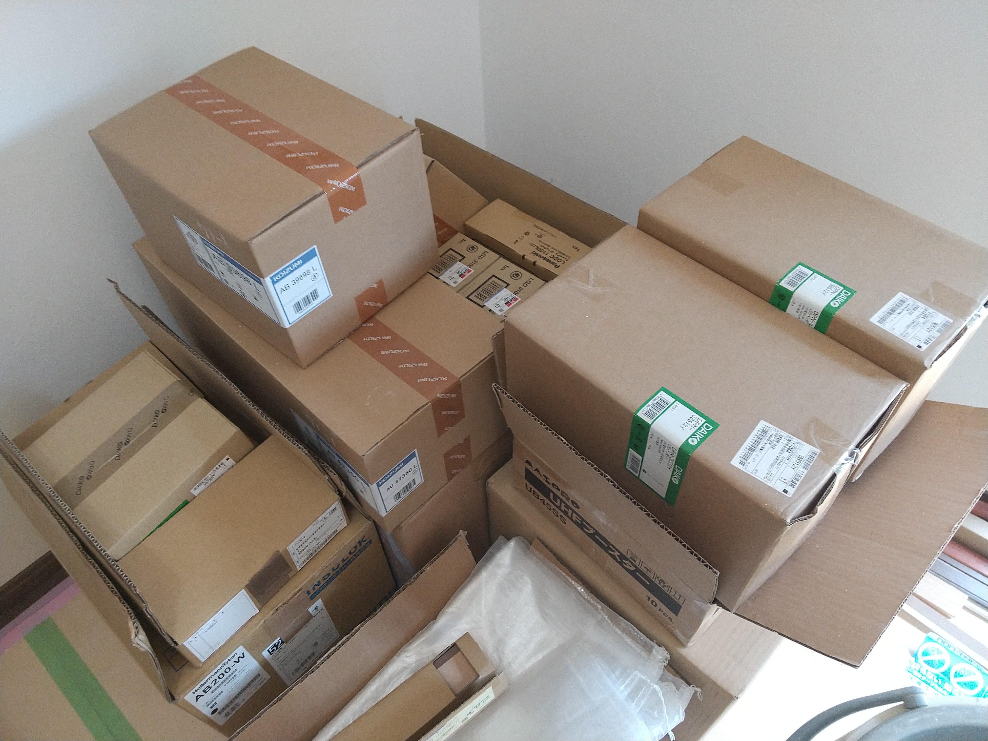 照明器具達も搬入され、f井電気のh場さんに取り付けられるのを待っています。