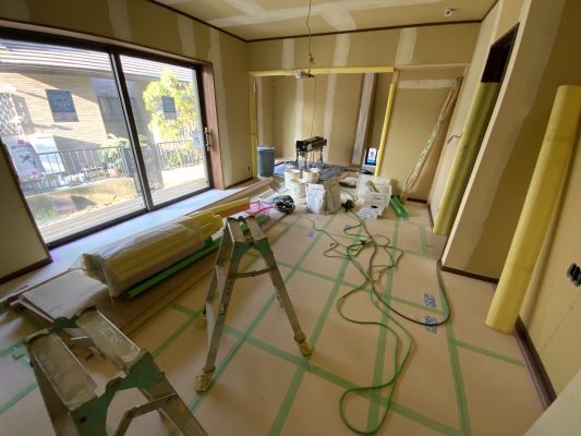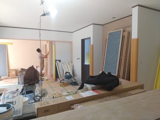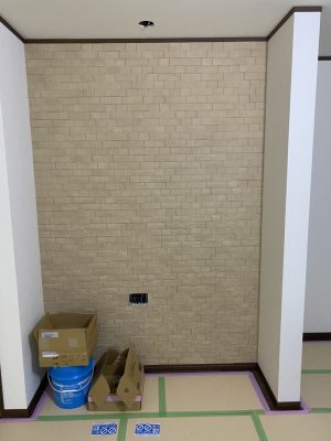 クロス工事が進んでいます。プラスターボードの色から、一気に明るくなり部屋らしくなってきました。