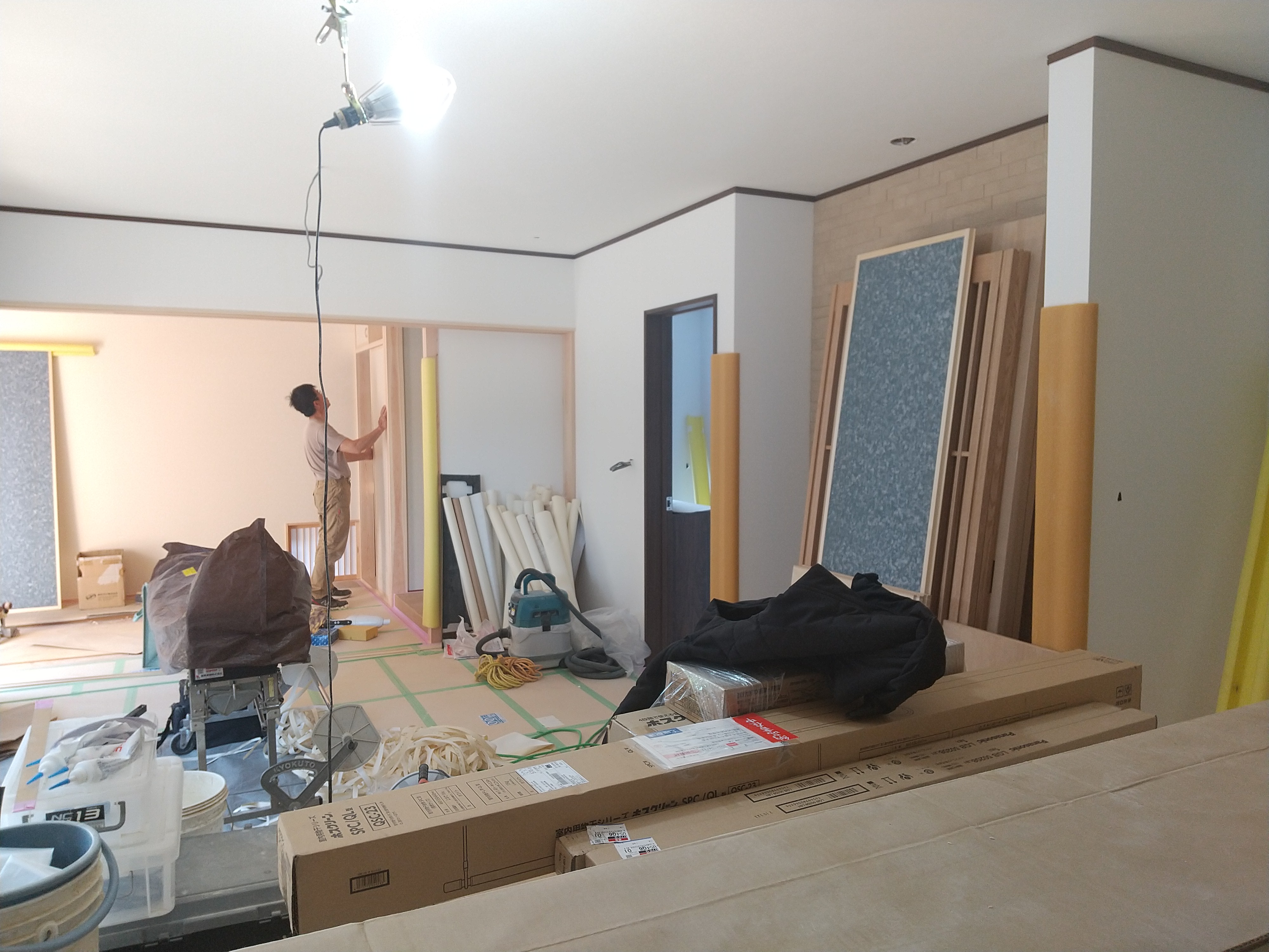 さて木工事もほとんど終わり、これからは塗装、クロス、タイル工事などの仕上げ工事に入っていきます。