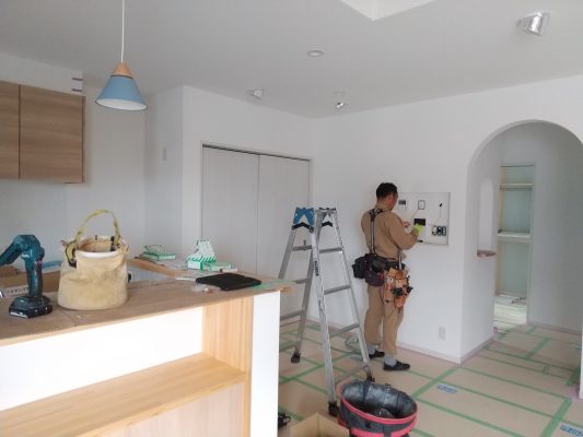 工事もほぼ終盤。今日は、f電気さんのh場さんが助っ人を連れてコンセントやスイッチ、リモコンなどを取付にやって来ました。