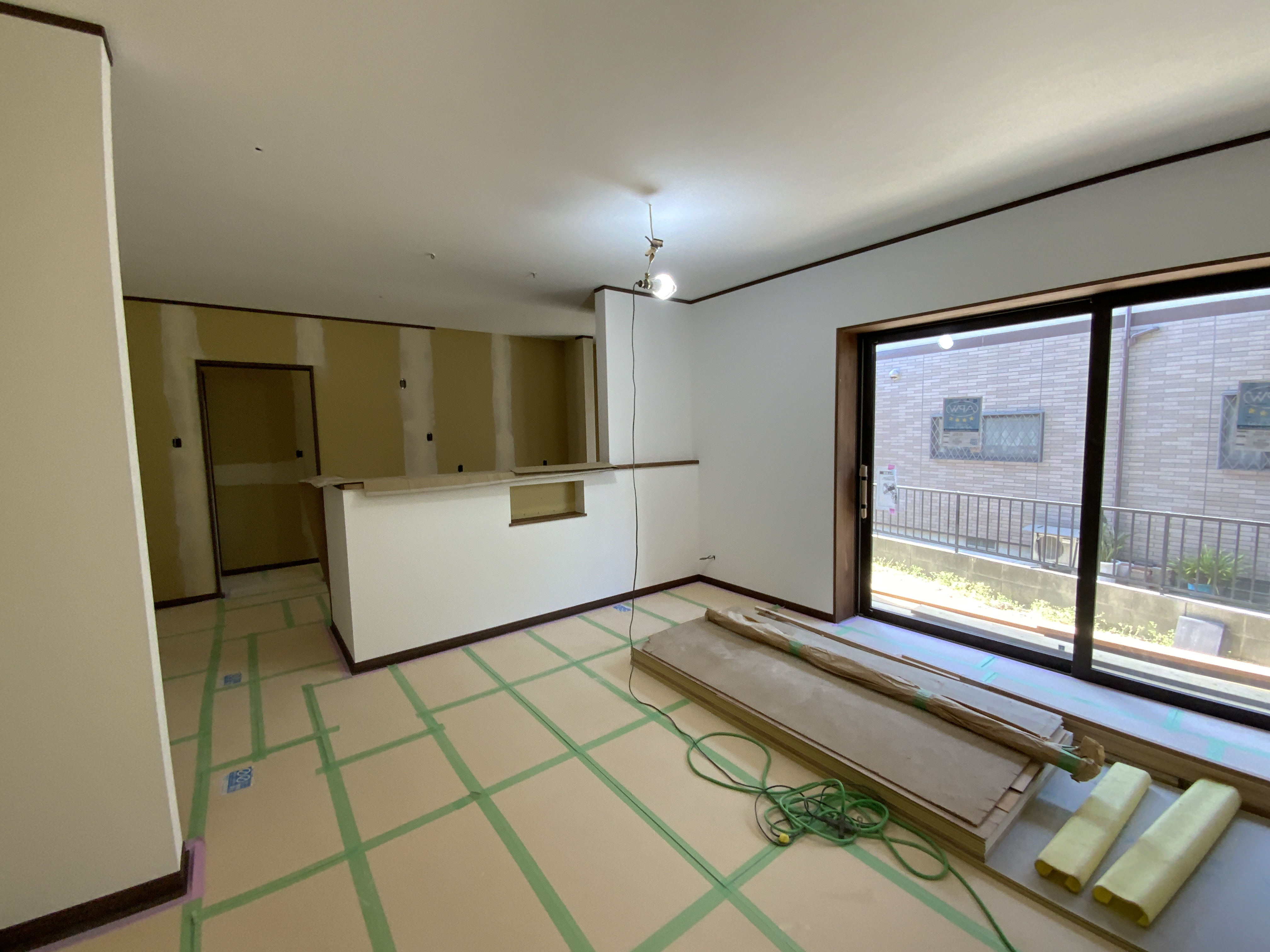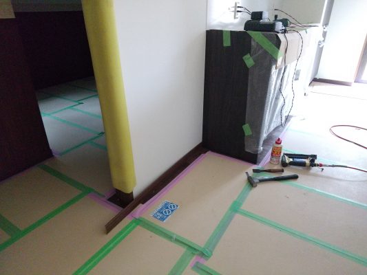 クロス工事の前には、大工さんが埃が立たない仕事をしている傍らで、今回は床や建具の色に合わせて、塗装屋さんが窓枠やカウンター材を塗りに来ました。クロスを貼る前に塗りますので、はみ出してもOK。豪快に?塗る事ができます。無垢材や、積層材を使っていますので、木目を生かした塗装にしています。
