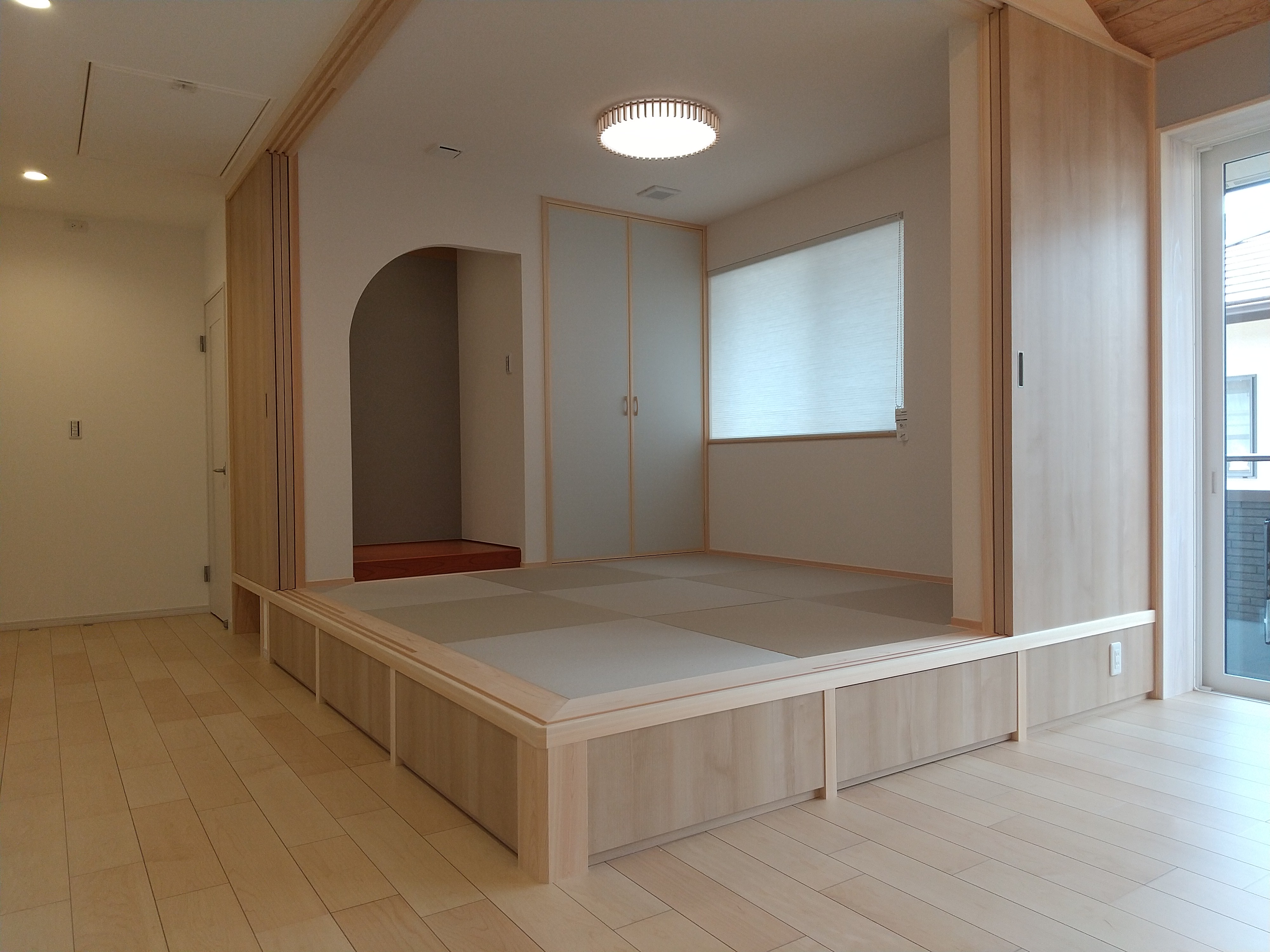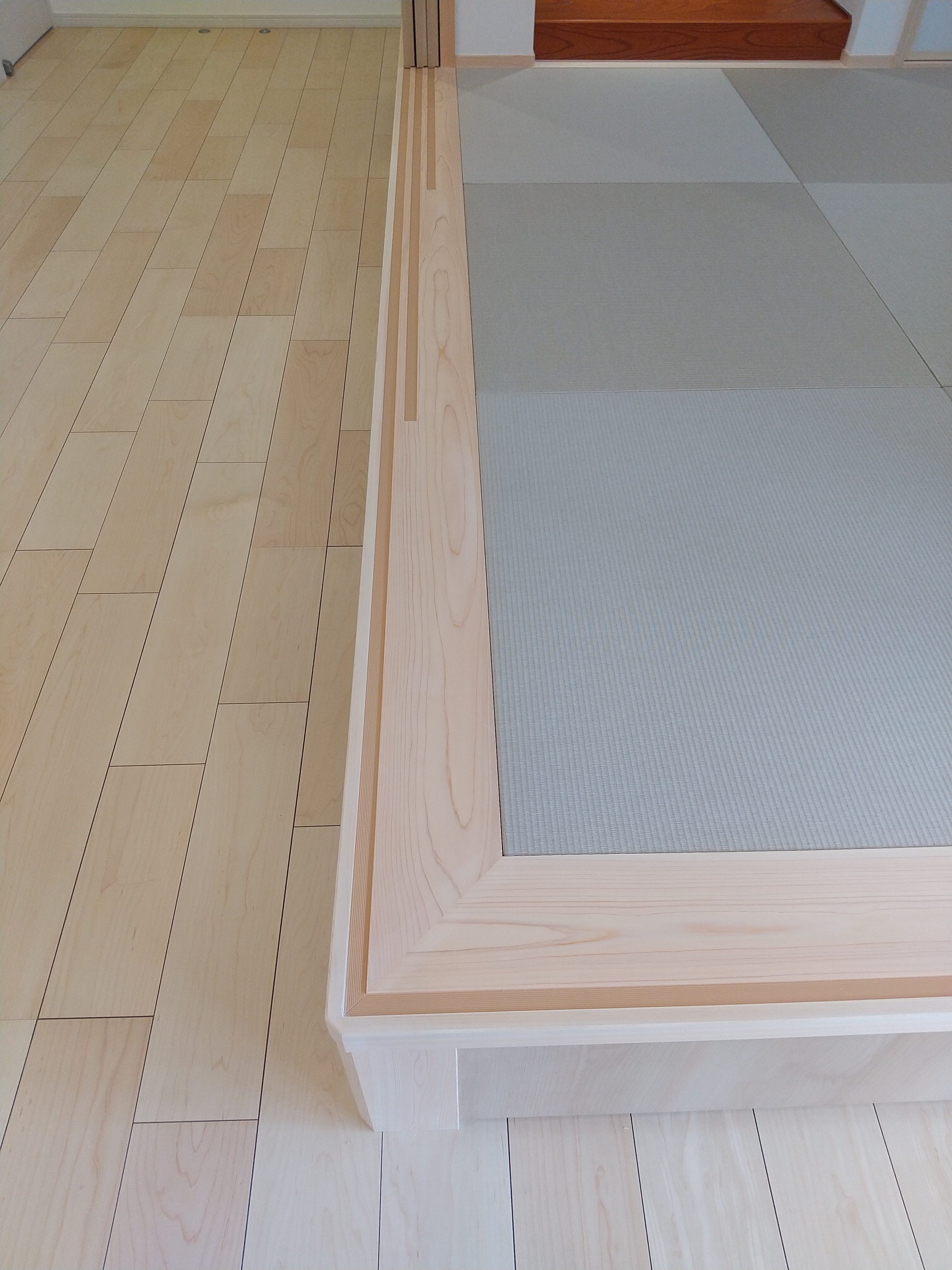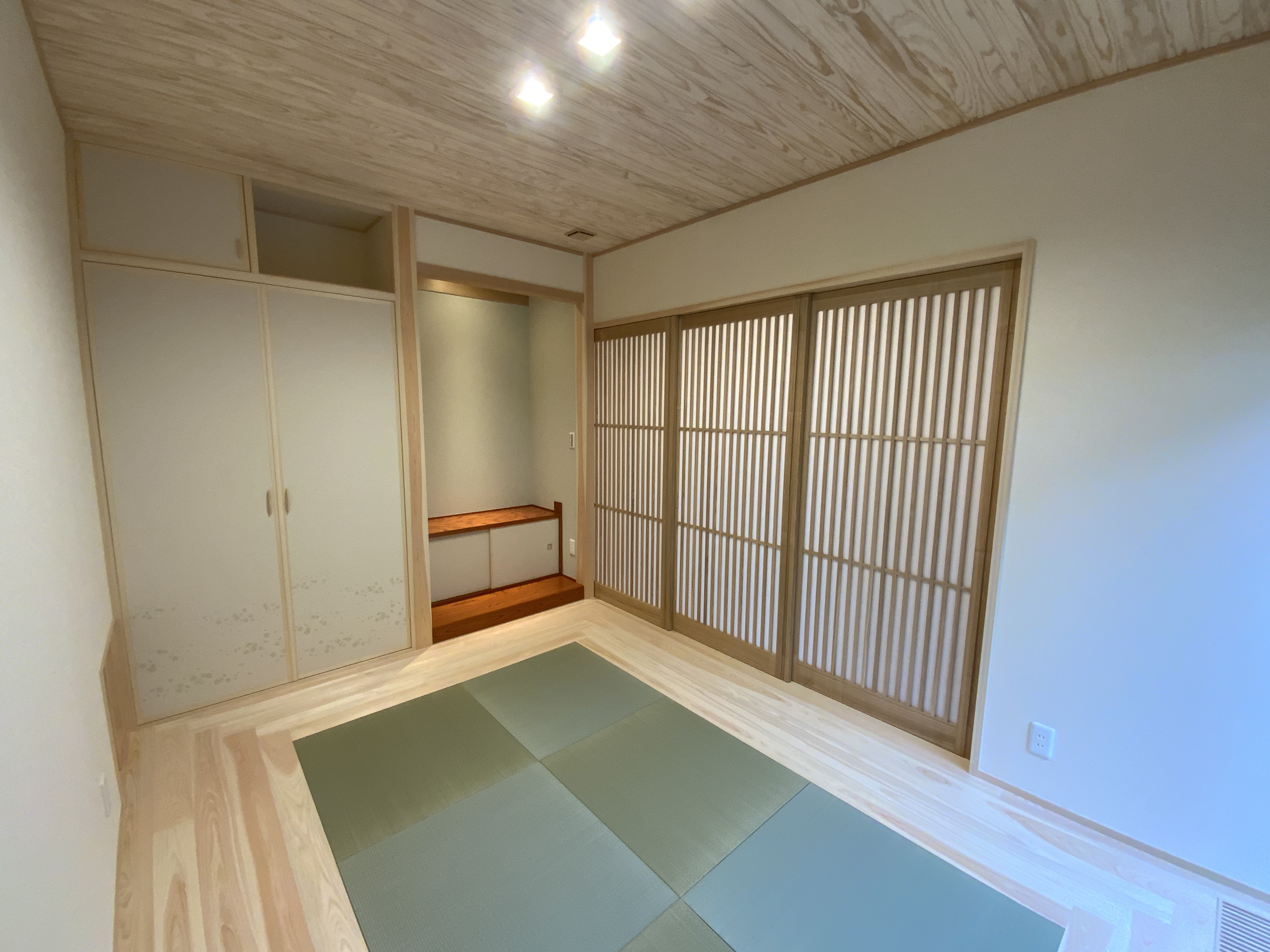 最後にちょっこと、私のこだわりも。2階の小上がりのタタミコーナーは、2面がOPENになる計画でしたので、小上がり下の引き出しの無い部分も引き出しがあるかの様に同じ面材で貼ってもらう事にしました。こうすると、ぱっと見は引き出しが無い又は全部引出し?みたいな感じになり、柄が揃うのでスッキリするのではないかと思います。またh典棟梁にお願いし、間仕切り引き戸は全て突き止めにしています。溝がいっぱいあると、なんだかうるさい感じになりますし、敷居の溝は何本もあると掃除もめんどうですもんね。1階の和室の引き戸の引手は洋室に合わせるとブラックになり、引手が目立ってしまうので、h美さんに了解をいただき引手は溝を掘ってもらう事にしました。引手によっても建具の印象が変わるので、溝引手は引き手を強調したくな時に良いと思います。施主さんにとっては、どーでもいい事かも知れない事を、ついつい、あーでもないこーでもないと考えてしまいます(笑)