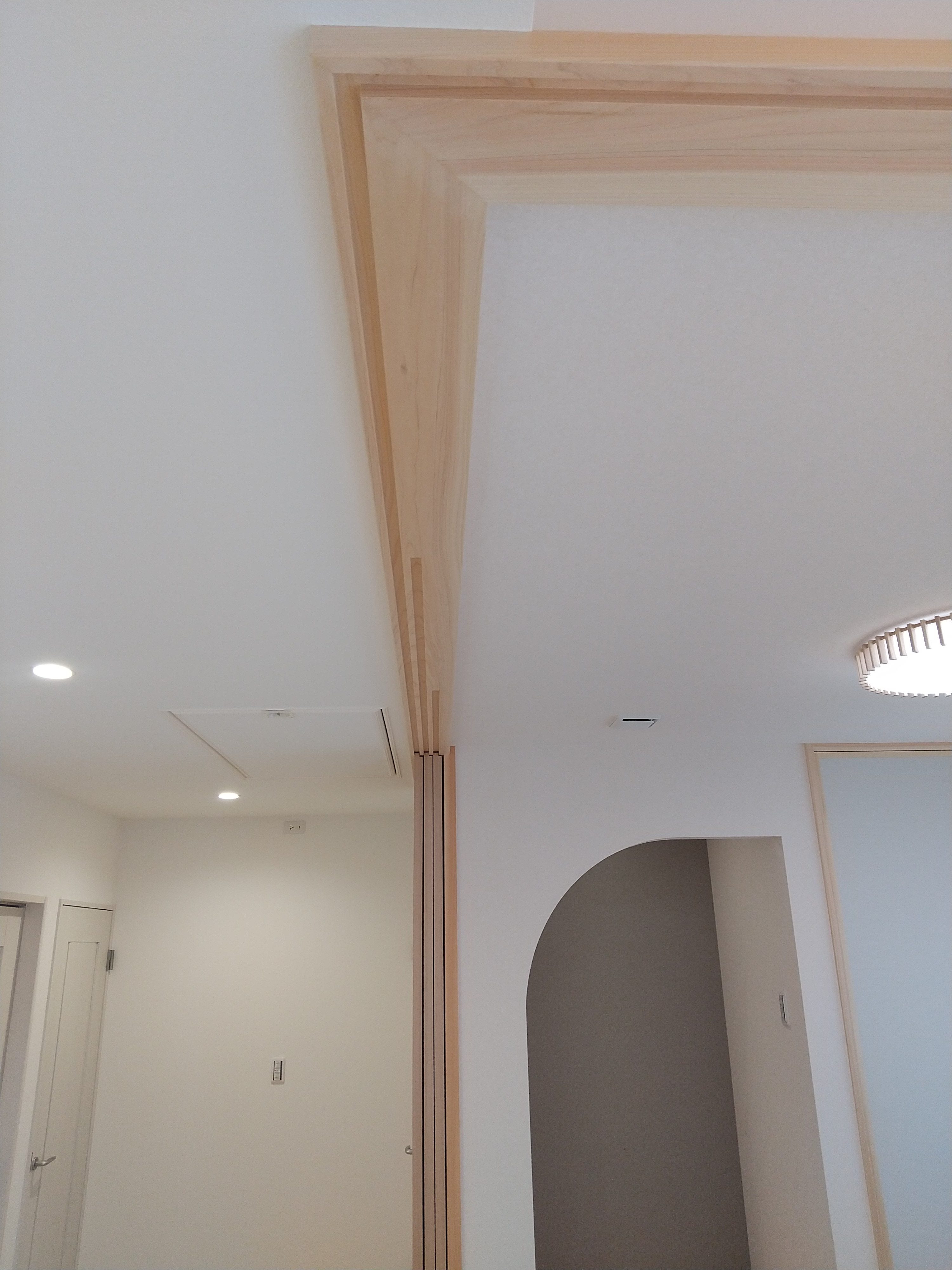 敷居の出隅部分は、面(角)を取ります。巾木と同じミノワ仕様。2枚目は面を取らなかった場合のピン角を再現。「当たったら痛いでしょ~?面を取らなくても、いろいろ当たって傷が付いて丸くなっちゃうんだけどね。」とk池さん。以前の現場で、k大工さんが「h君(←k池さん)が、いろいろと現場でいい事する度に、ミノワの標準仕様が増えていったんだよ」と話していたのを思い出しました。今回の小屋裏収納も、実は標準仕様にしたいくらいいい感じ。クロス下地のプラスターボードが仕上げなのですが、股釘を使っていて、ビスが目立たないです。k池さんは「内緒ね」って。これまた粋です。あ!バラしてしまいました💦