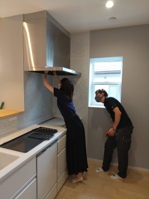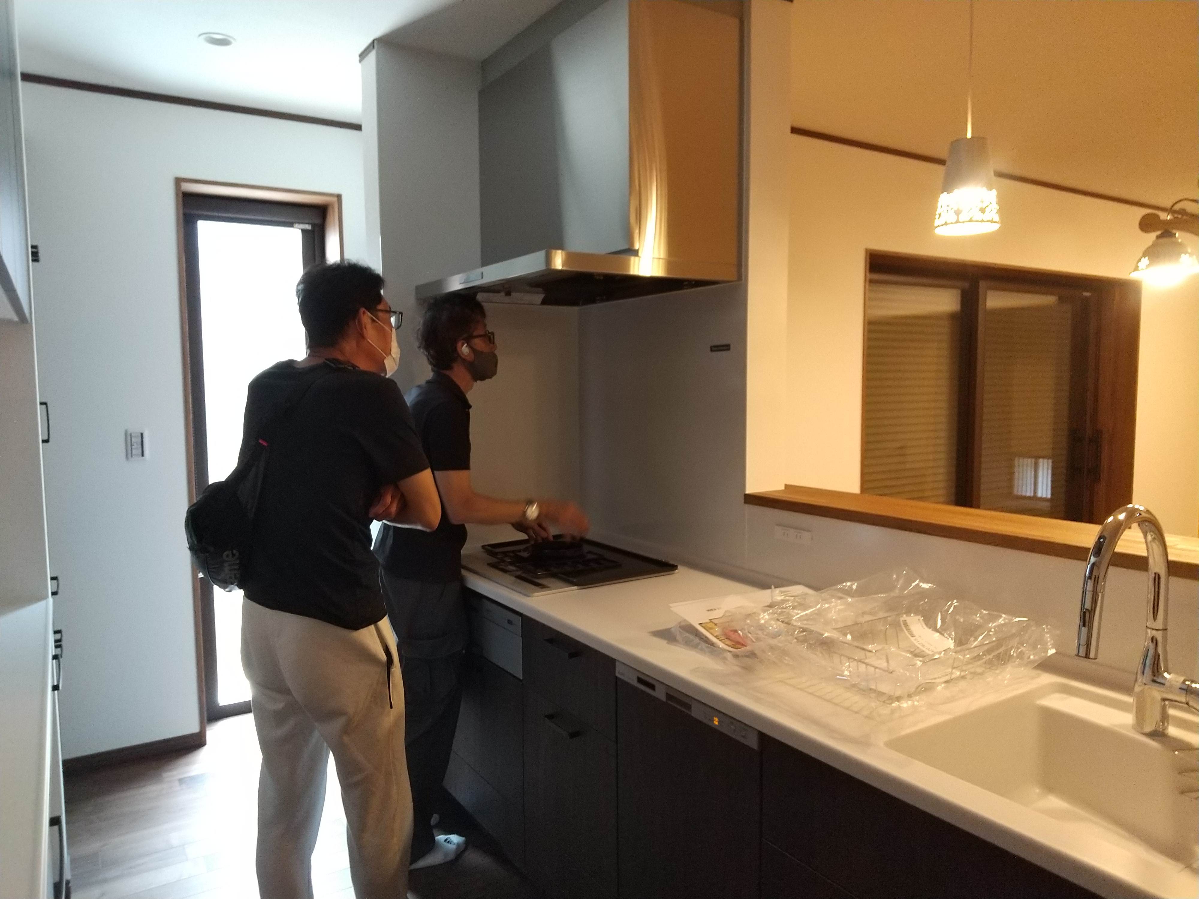 a朗監督も、ミノワに入ってもう直ぐで3年。ミノワ仕様の設備機器は何度も取り付けているので、説明もスマートです。レンジフードのお手入れは皆さん一番気になるところ。実際に触って体験していただきます。