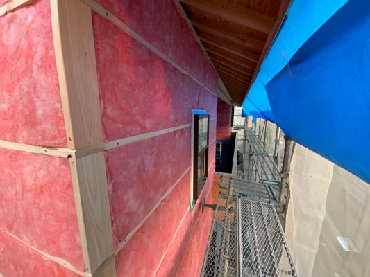 14日の外壁付加断熱の施工写真。10日はまだ構造用合板の状態だったという事は、大きなt様の家をわずか4日間で断熱用下地を取り付け、断熱材を施されたという事です。今回から、より熱橋ができない様に、付加断熱をヨコ張りしています。タテがヨコになると、窓周りの処理など何かと大変なのですが、それでもこの早さ。2人だと2倍ではなく3倍。3人だと5倍?いや、チームw辺は6倍かも。t様にいろいろ決めていただく係としては、非常に焦ります~💦