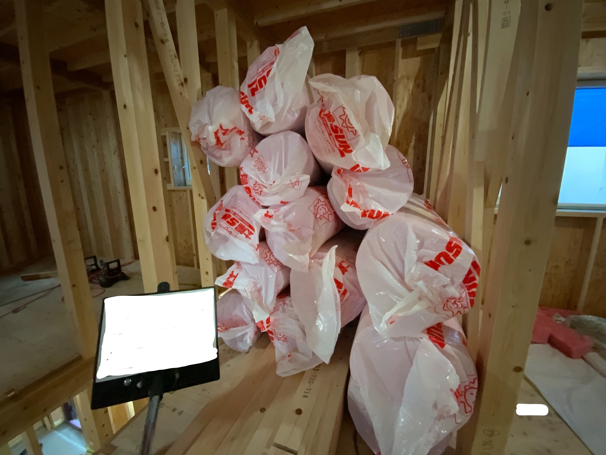 2年程前から、勾配天井の断熱には、重力でずれてこない様に、密度が高いセルロースファイバーをお勧めしています。密度も高いですが、お値段も高い💦ので、高性能グラスウールと使い分けています。そして今回は2世帯住宅の為、高気密高断熱の住宅は、外部の音は聞こえにくいのですが、内部の音は響きやすいので、気になるお部屋の下や上にも、セルロースファイバーを施しています。