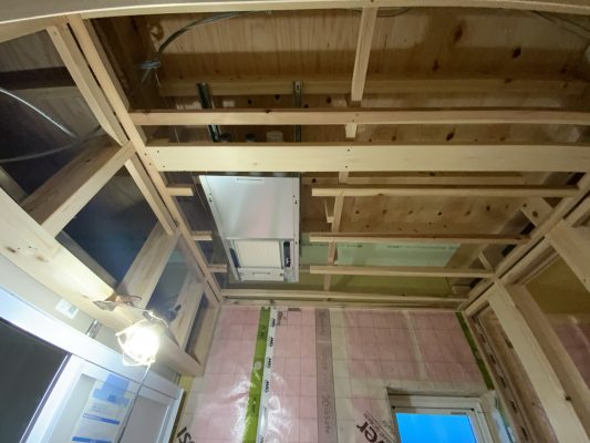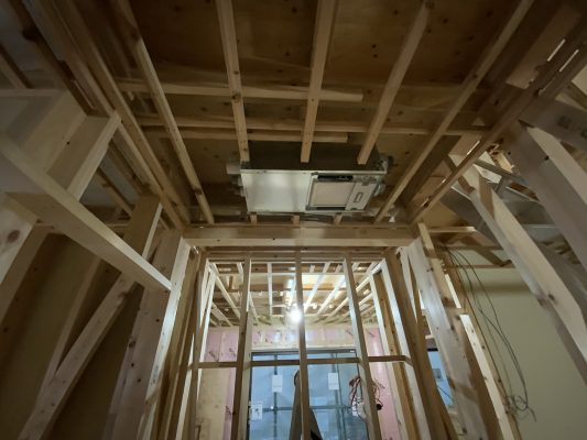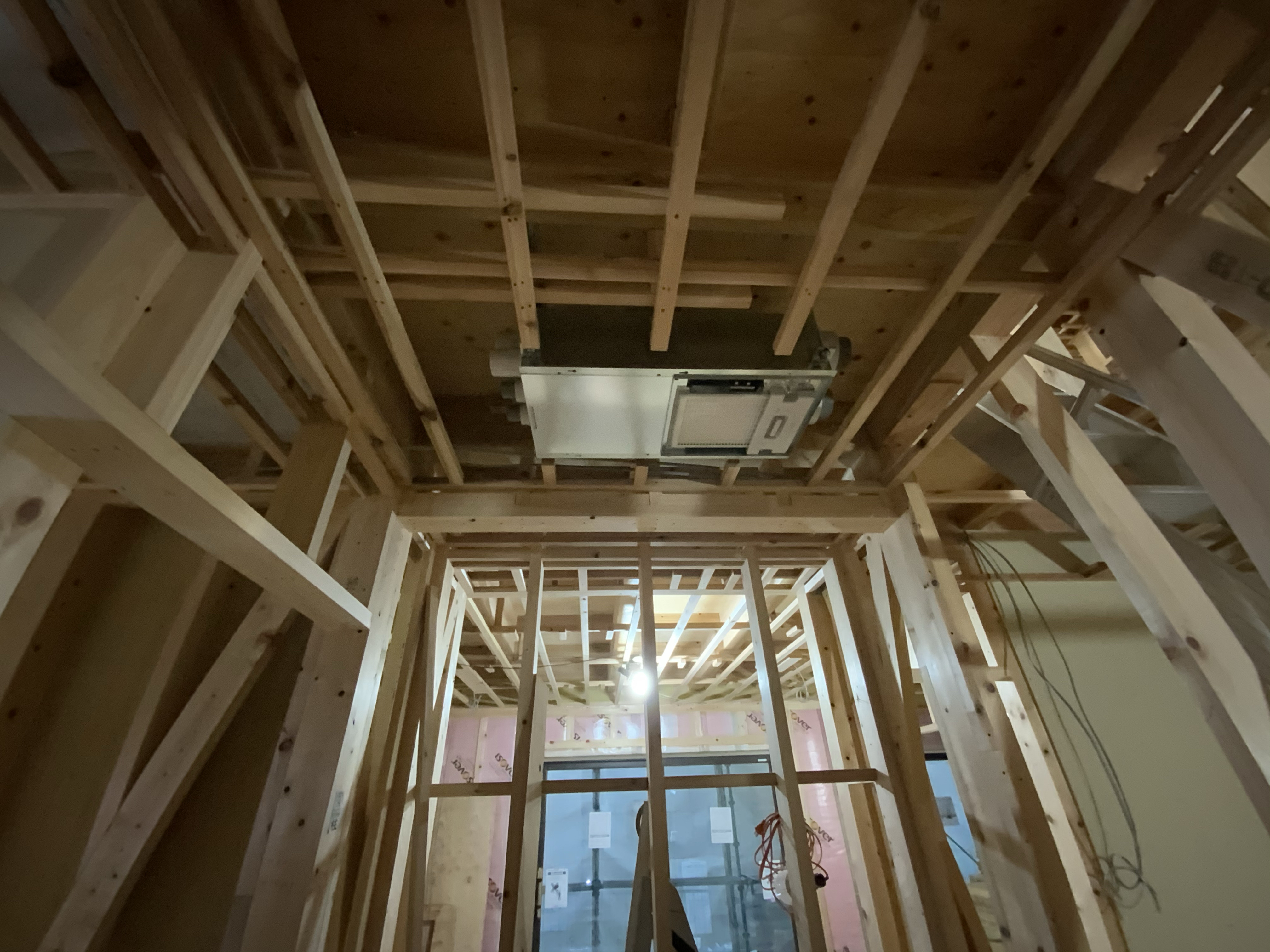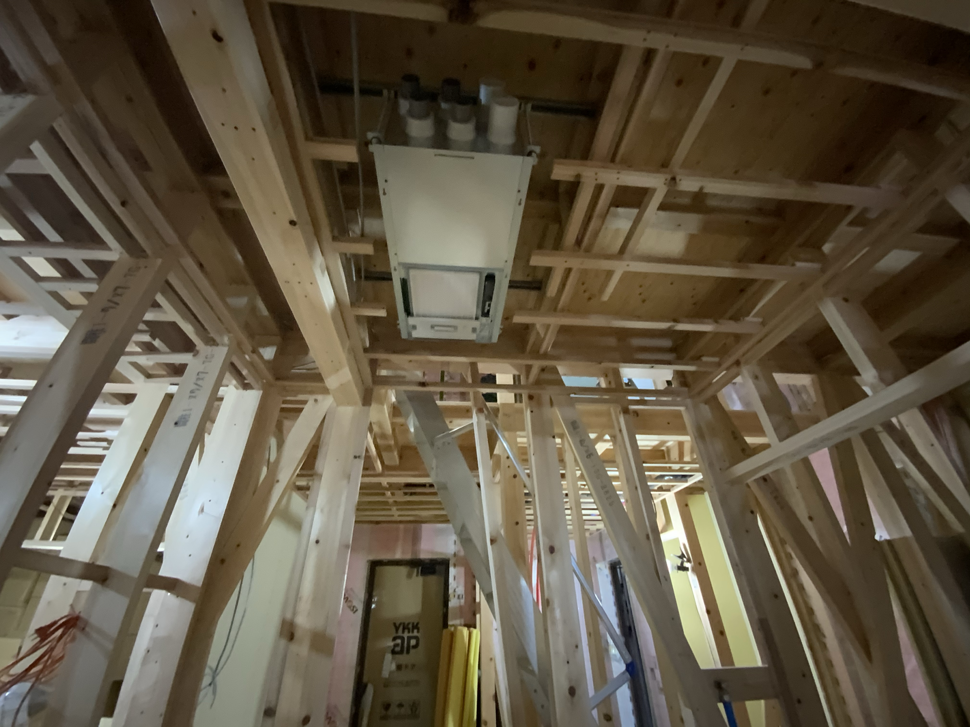 f井電気のh場さんが、室内に場所を取って大工さんの邪魔をしていました、換気扇とエアコンの取り付けにやってきました。今回は1、2階共に脱衣室に換気扇本体を計画しています。
