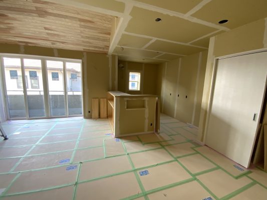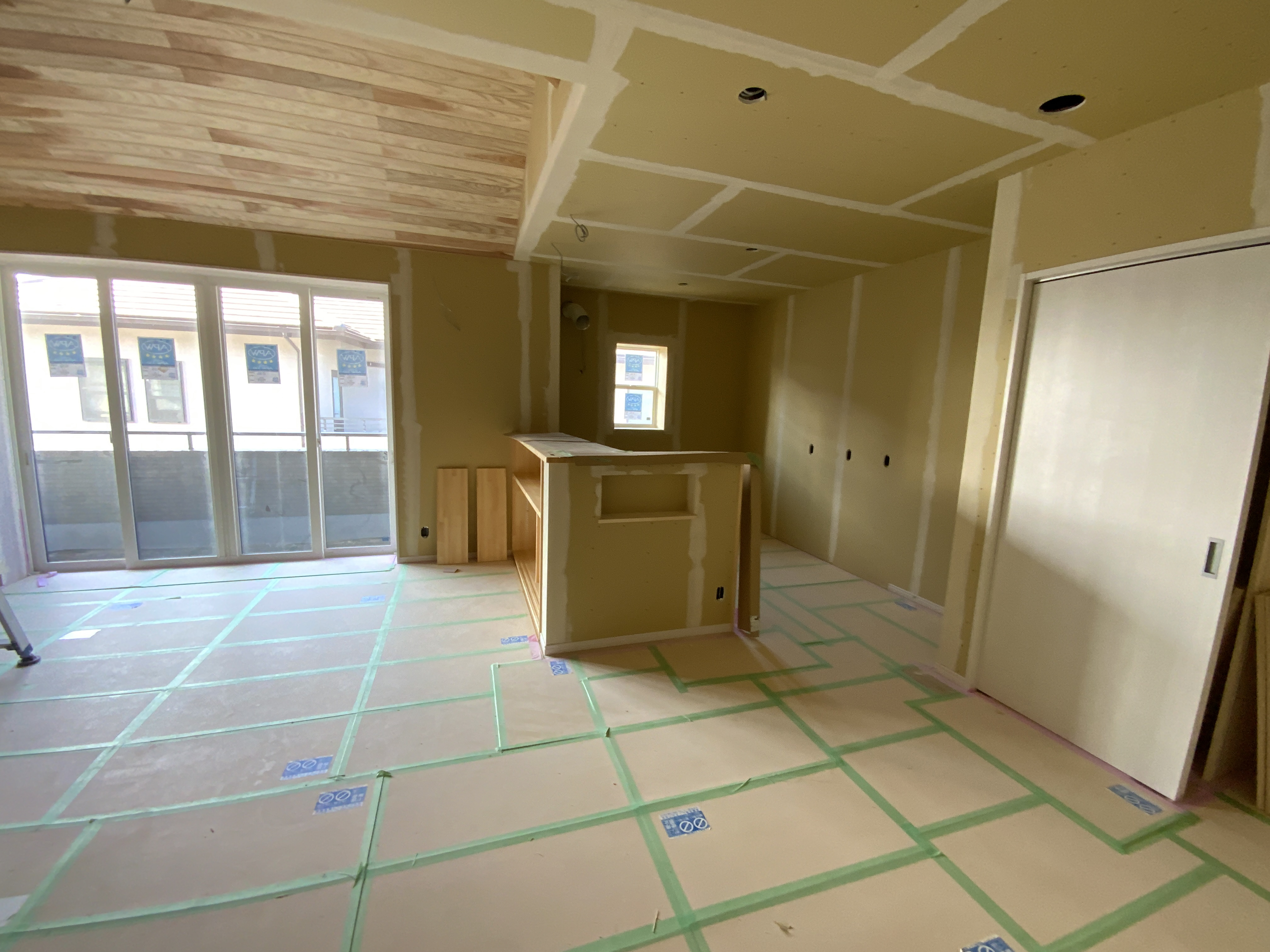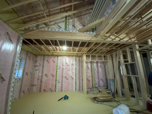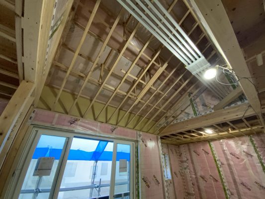 k保木君は、天井上部分のプラスターボードを張っています。準防火地域なので、外壁を防火構造とするため、屋内側被覆としてプラスターボードを梁まで張り伸ばしています。