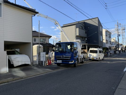 基礎工事はひとまず、終了。外壁等を終え足場を外してから、仕上げのモルタル金ゴテ仕上げを行います。