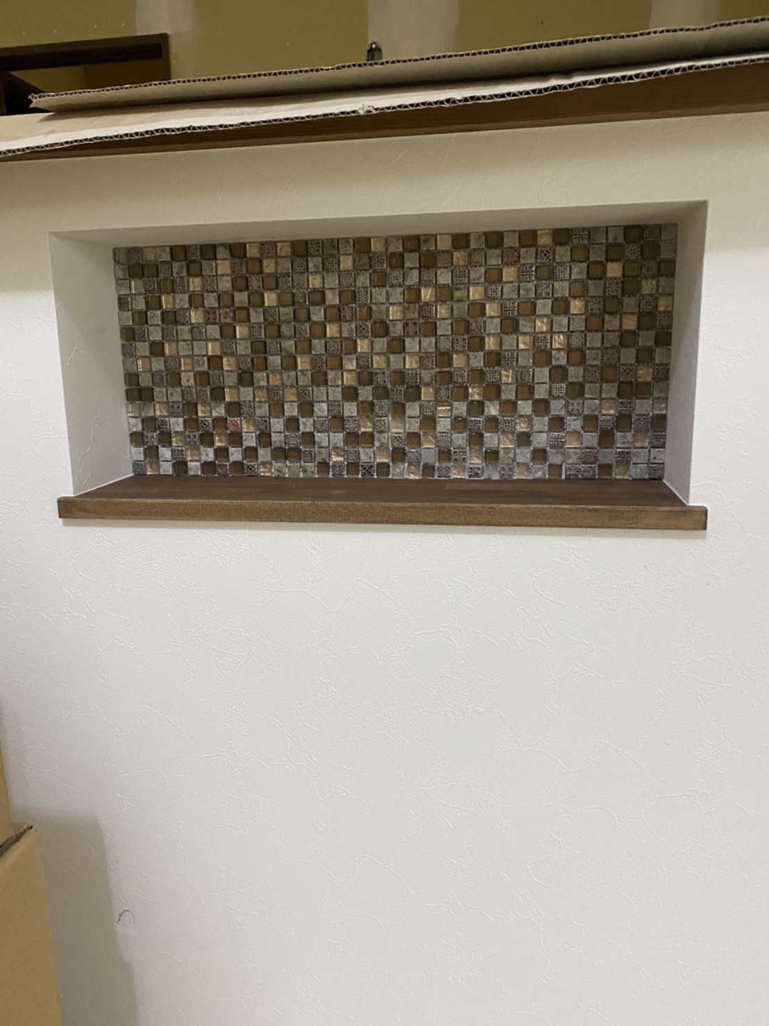 内部のタイル工事が始まりました。1階エコカラット、キッチンニッチ、2階のエコカラット貼りの様子です。ニッチの様に、タイルに合わせて大きさを決める部分は、木工事の前にタイルを決める必要がありますので、こんな感じにタイルが貼りたいわ~なんて考えてみえる方は、タイル選びも早めにご検討いただくと良いと思います。タイルをカットすることなく、空間にぴったり収める事ができます。