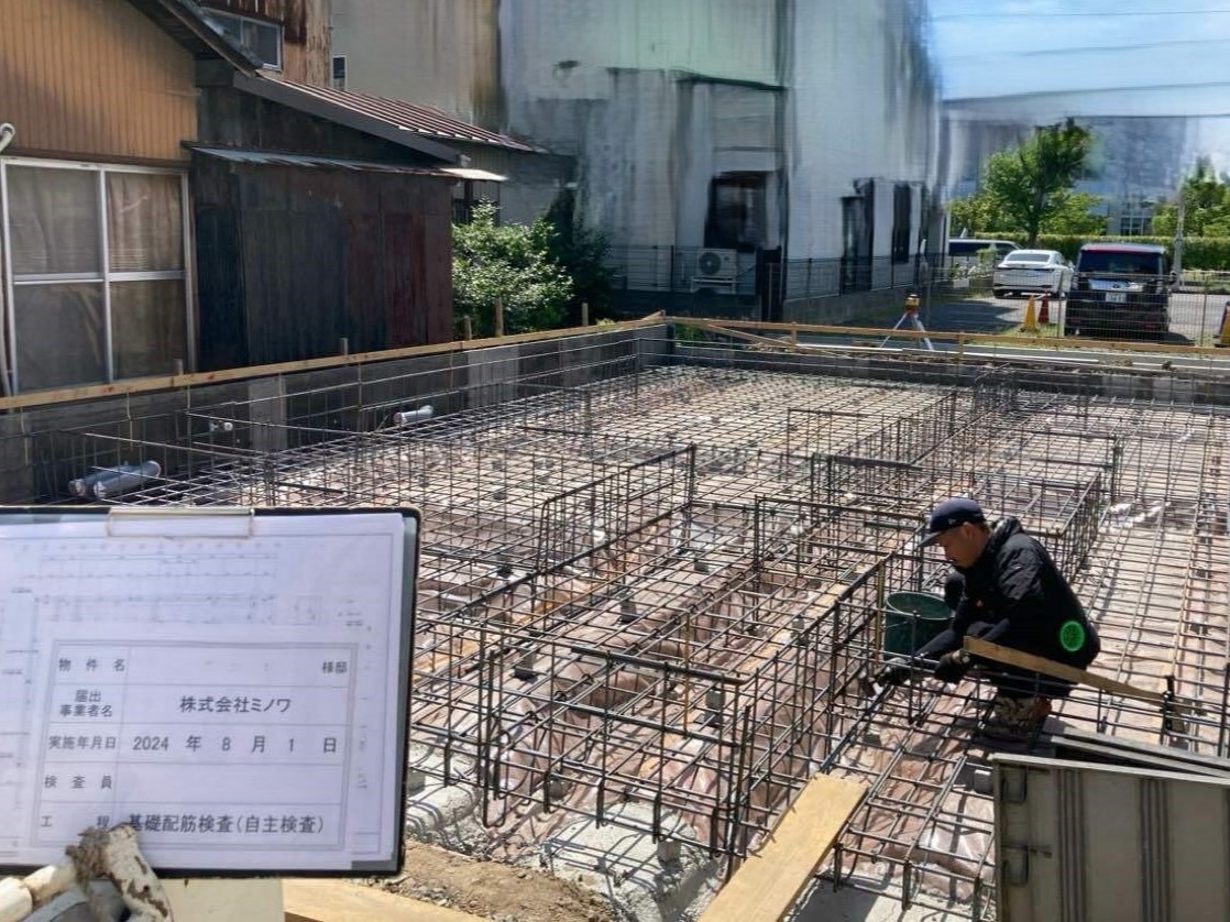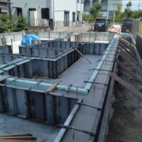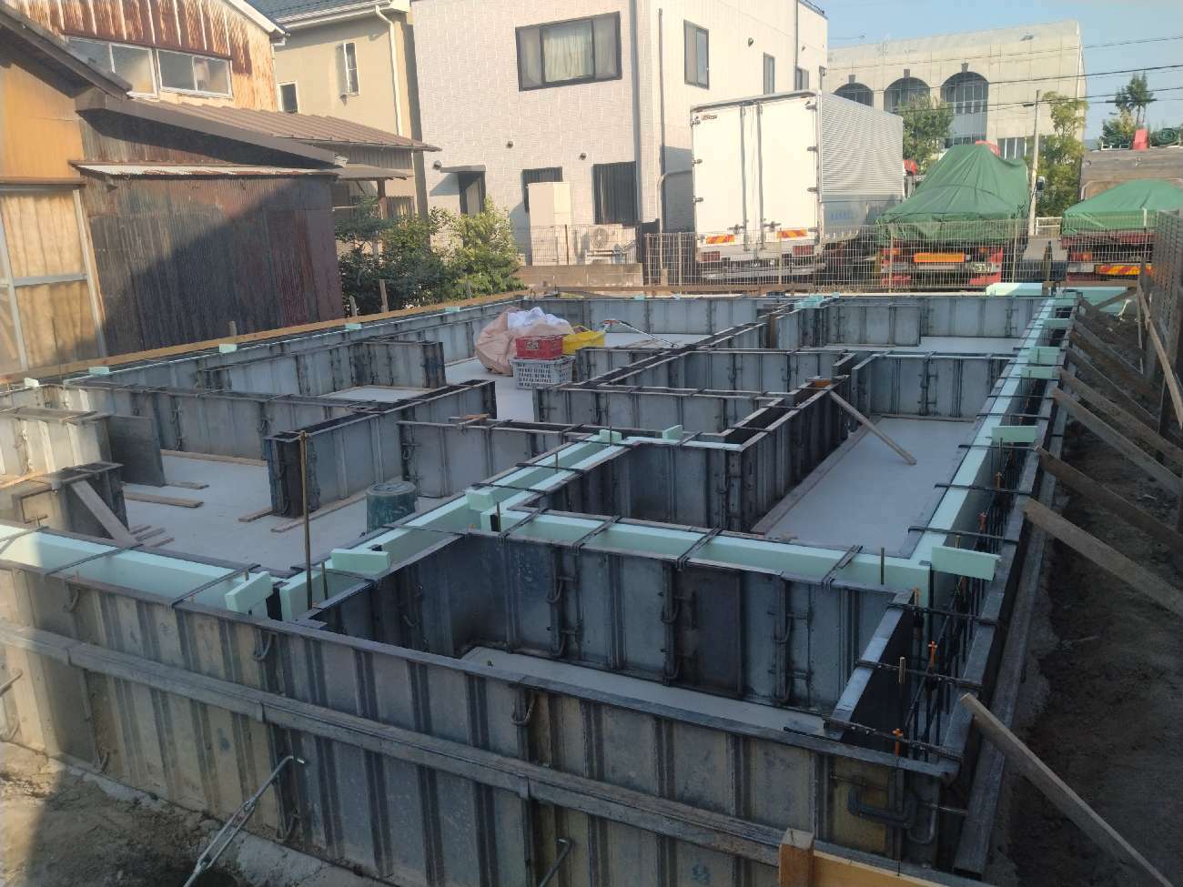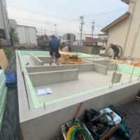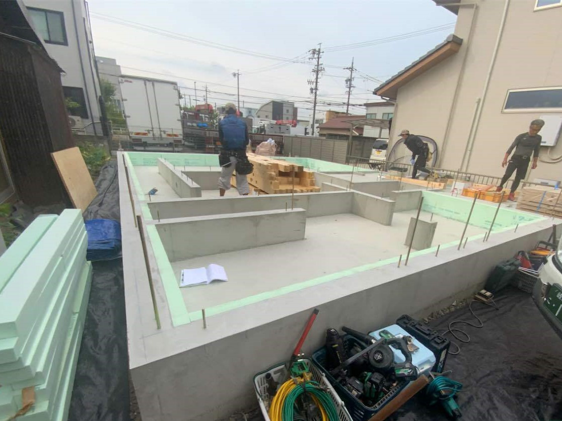 立ち上がりのコンクリートも打設しました。k様邸もこのところのミノワ標準仕様のスカート断熱です。立ち上がり部分の断熱材は、基礎施工時に設置しています。また最近は外壁も付加断熱55㎜をされる方が多く、基礎と外壁の面が揃わないので格好が悪いという問題をクリアーするため、基礎形状もアップデートしました👍今月24日の上棟に向けて、基礎工事が炎天下の中粛々と行われています。