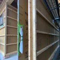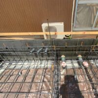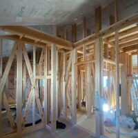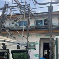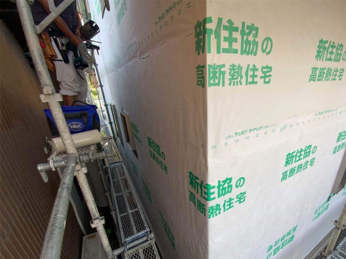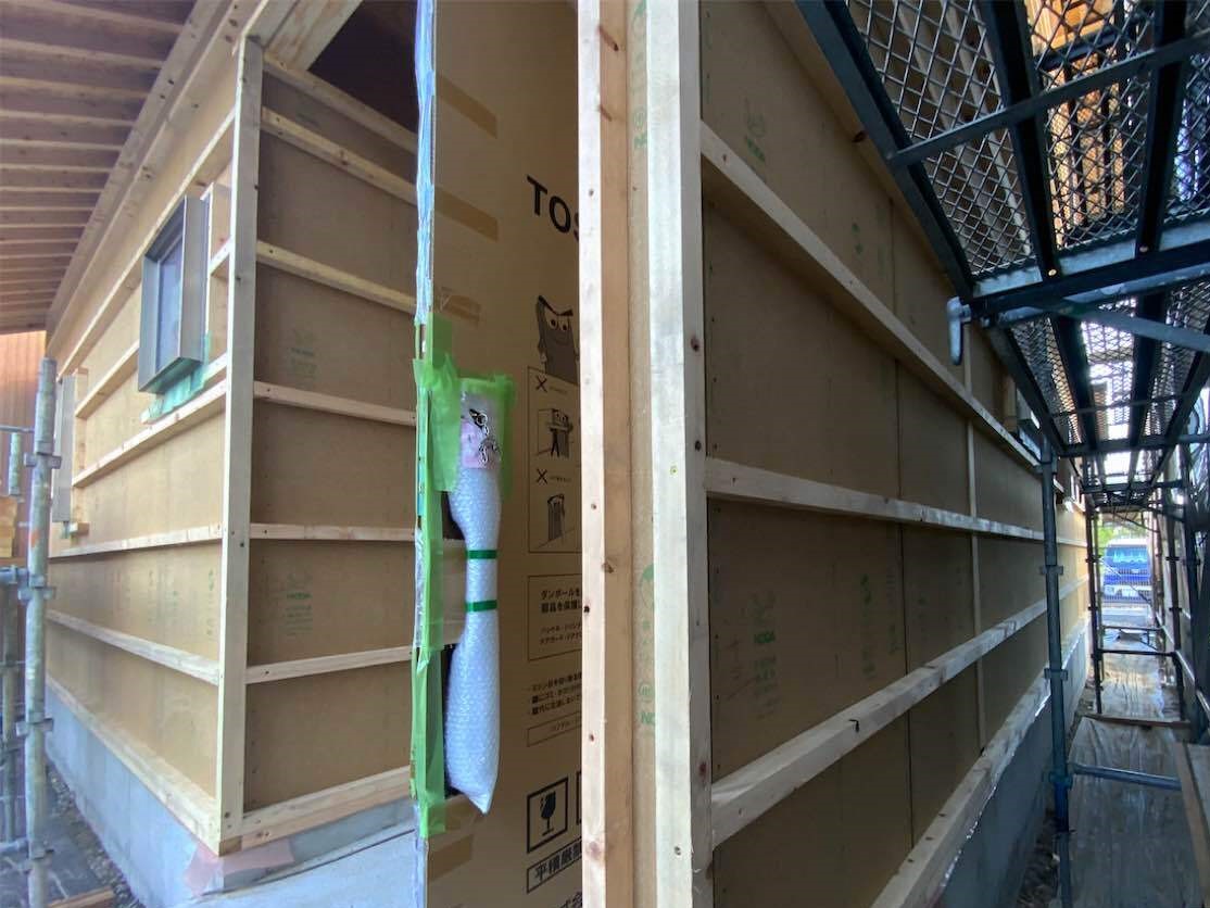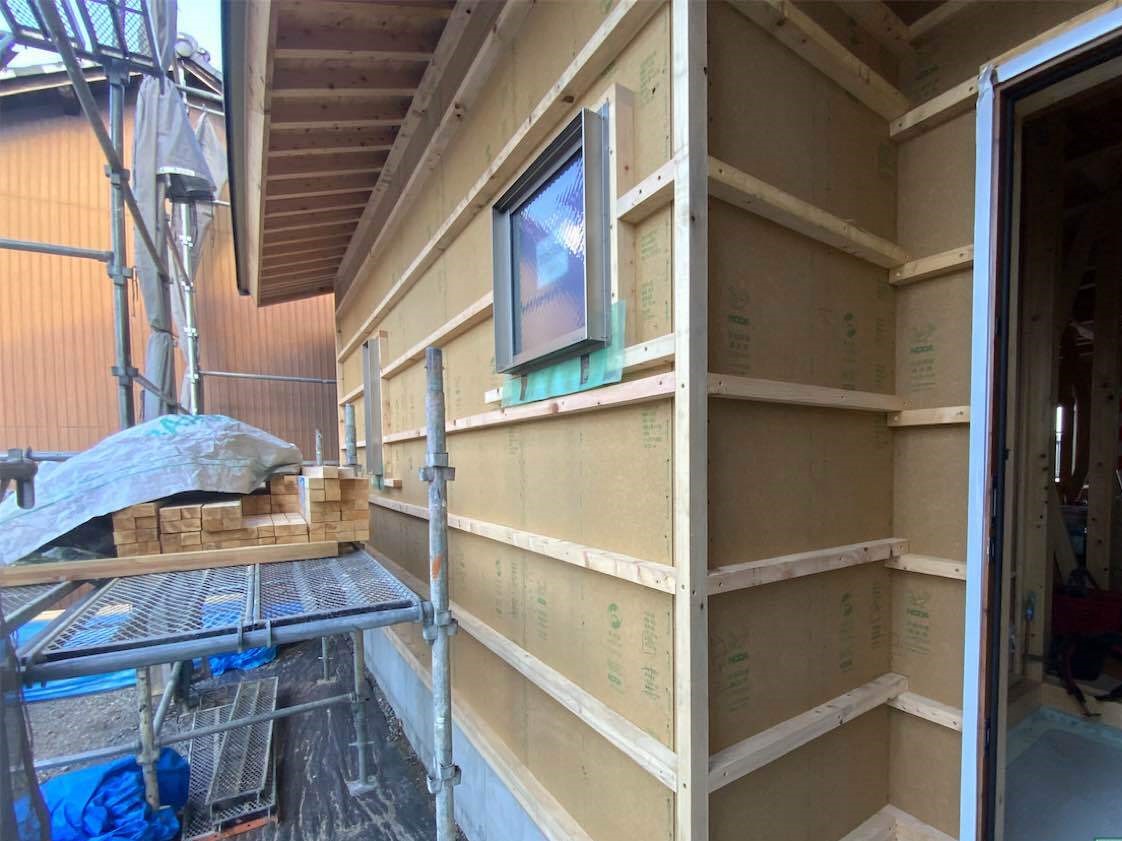 外部は、壁の付加断熱工事中です。付加断熱を横張りしていくための下地材を入れ終えた様子です。