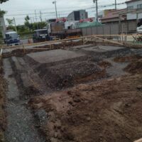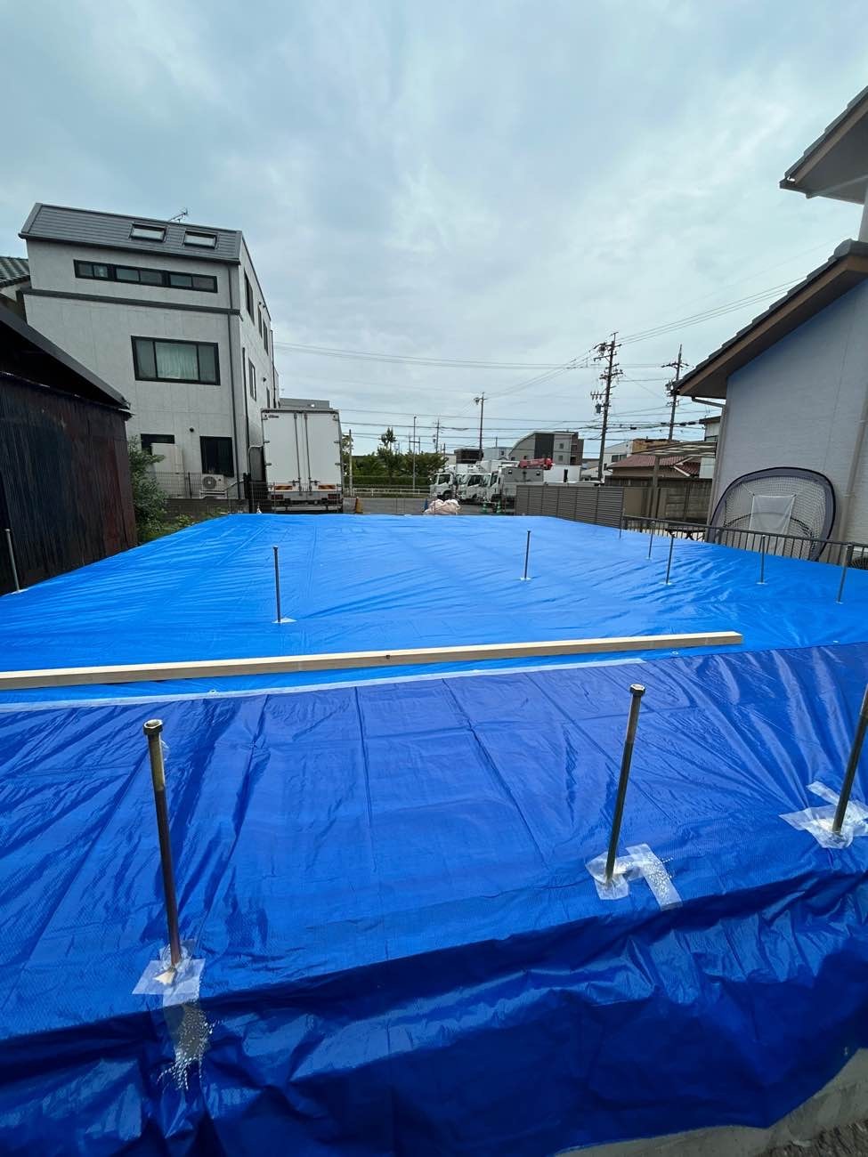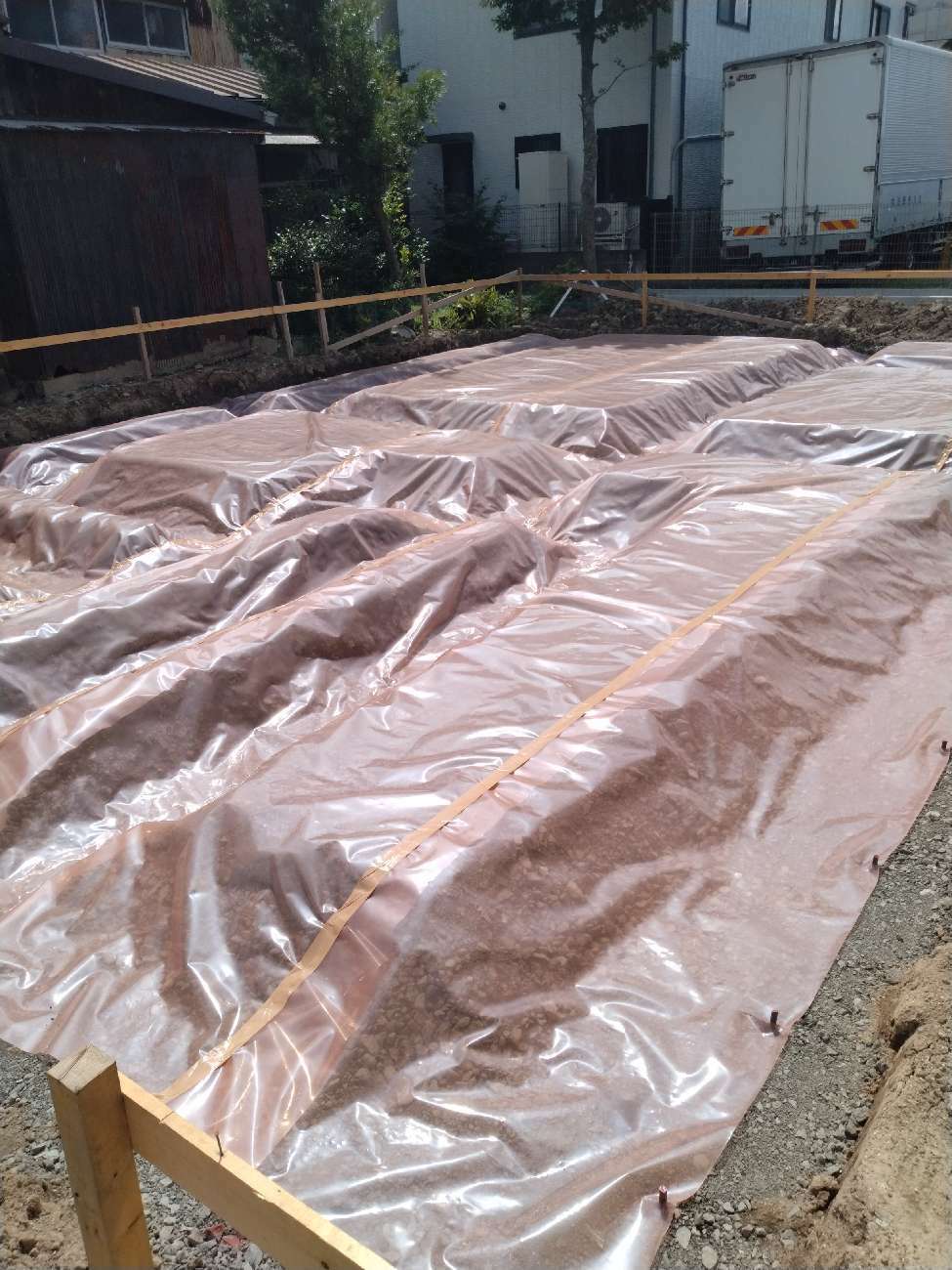 梅雨が明けたというのに、なんだか変なお天気が続きます💦35度超えの猛暑日にも関わらず、夕方には雷雨が降ったり・・・雨が降ると地面が固まってくれるので、良いと言えばよいですが、程よい雨でお願いしたものです。そんな中、tさんが地道に基礎工事を行っています。オレンジ色かかった透明のシートは、防湿シートです。