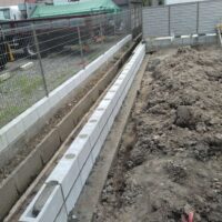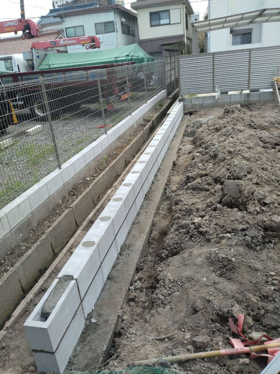 敷地奥の隣地境界は、建物が建ってしまうとコンクリートブロックを運んだり、重機が入れない事もあり、建物に先駆けてコンクリートブロックを積んでいます。見積の文字通り『先行ブロック』です。