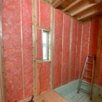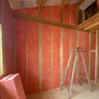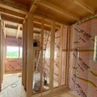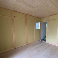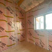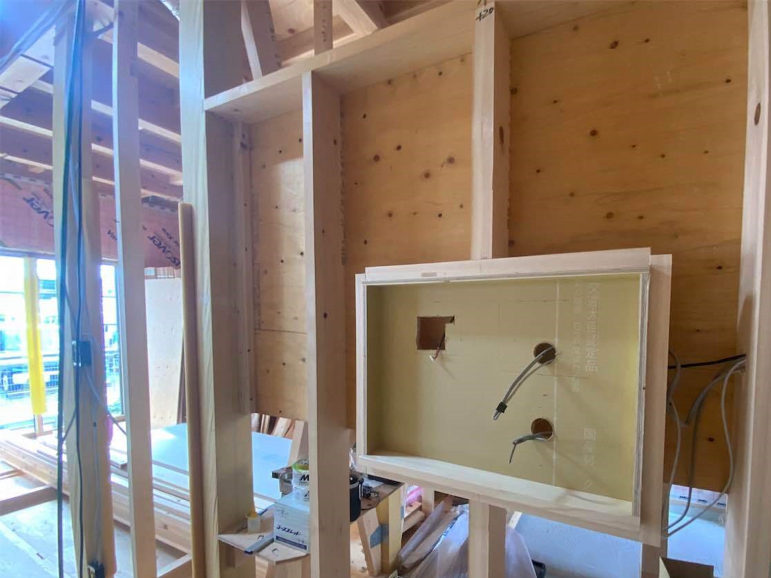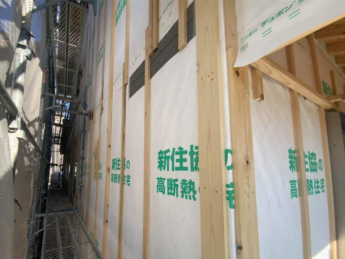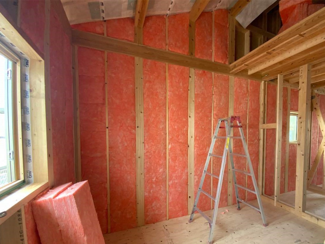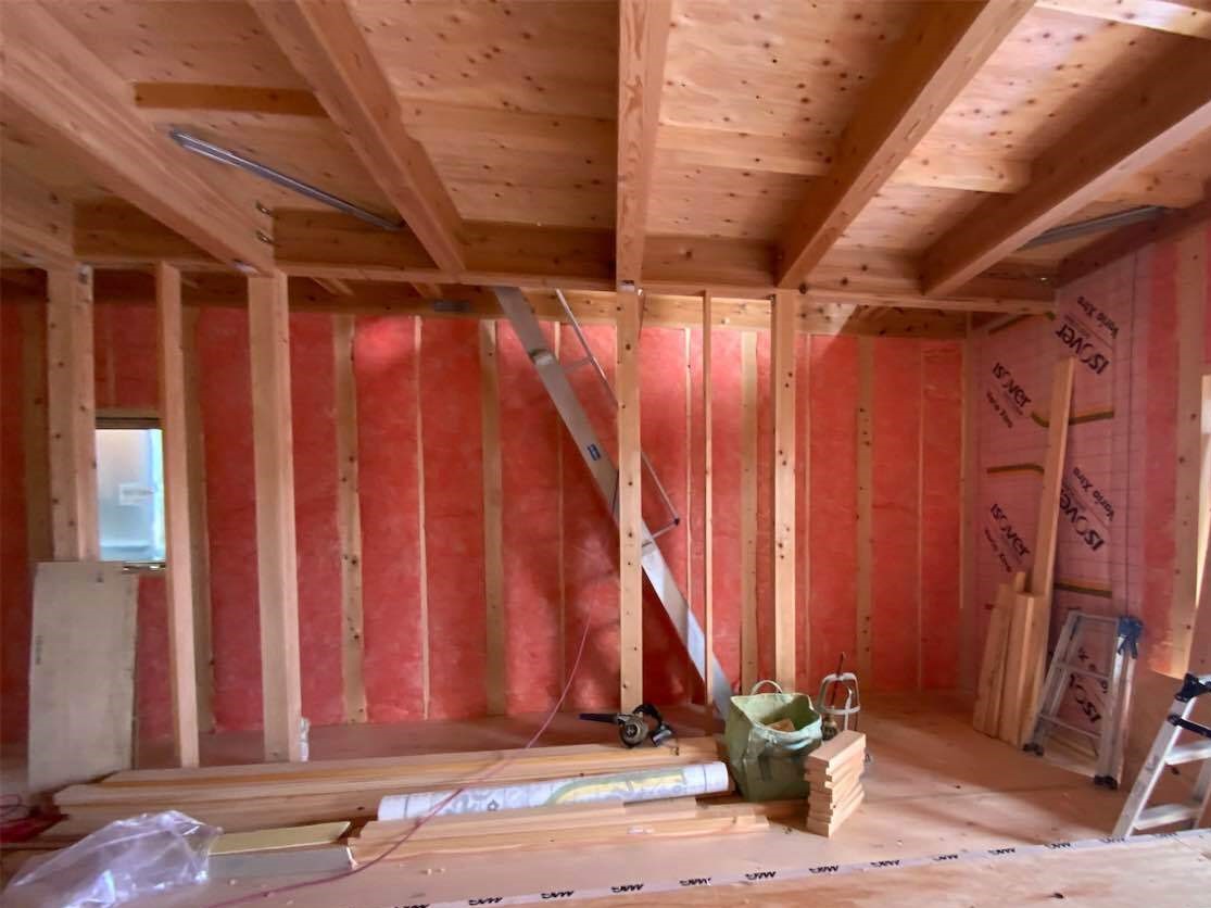 内部は、充填断熱の高性能グラスウールを入れています。高性能グラスウールは、繊維が細く細かい空気室が多くなり、断熱性能がUPしたグラスウールです。ガラス繊維なので、燃えにくい断熱材でもあります👍