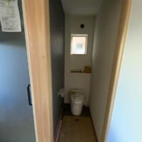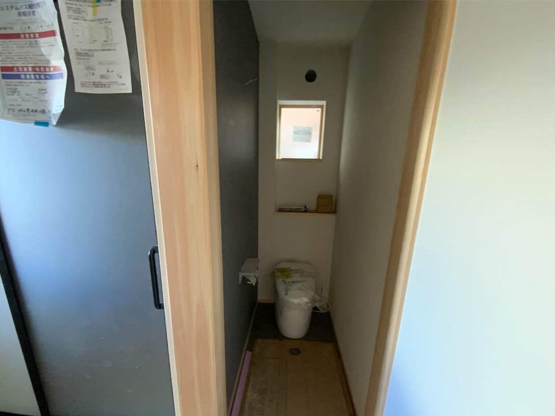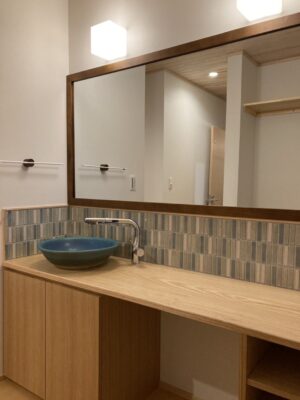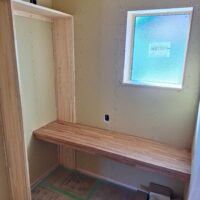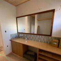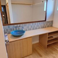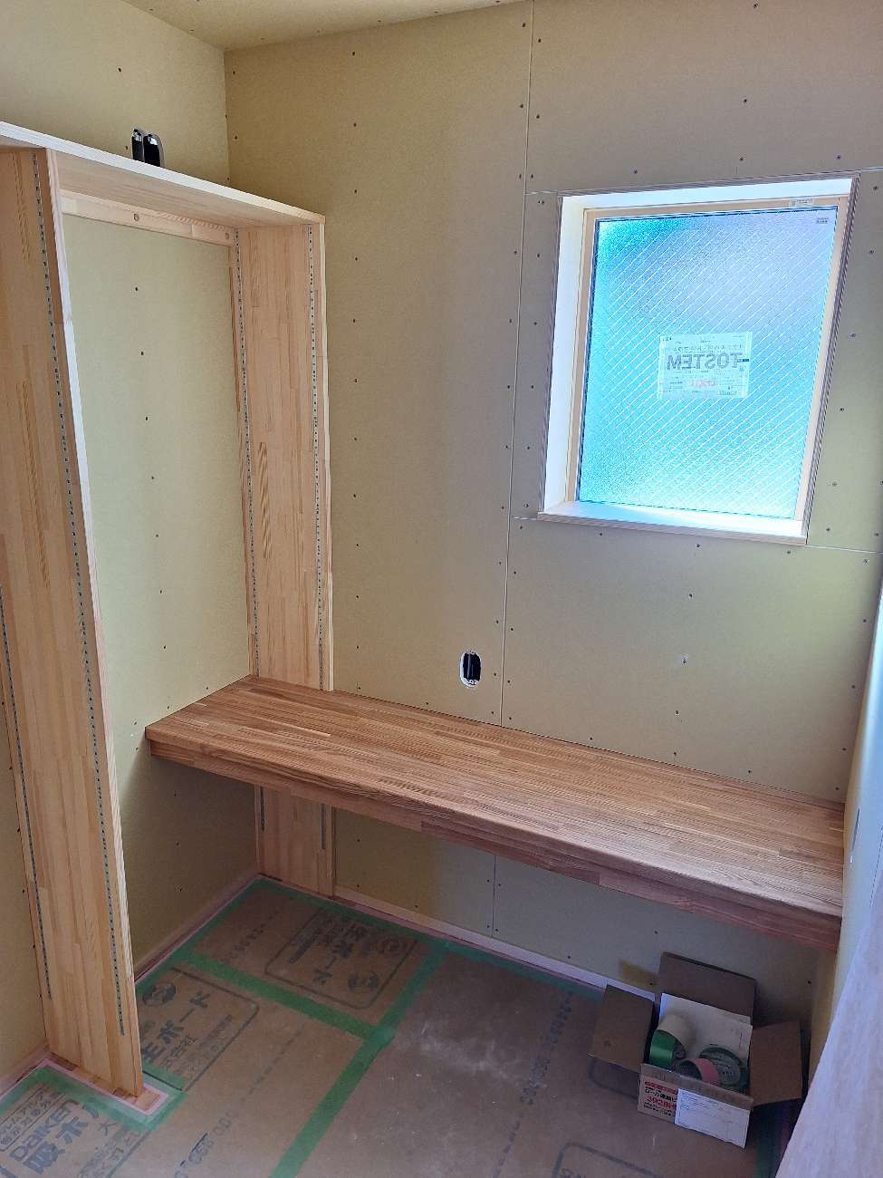 トイレも取り付けられました。洗面化粧台は、ホワイトアッシュの一枚板をs戸棟梁に取り付けていただき、下はf木工さんがタモ材で棚を製作しています。洗面器は、k様がご夫婦で陶器市で購入された物を取り付けます。顔や手を洗えて、化粧もでき、洗濯物も畳むことができるスペースです。