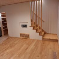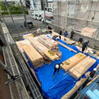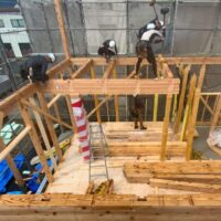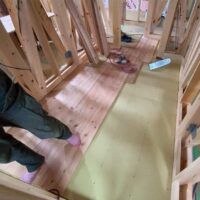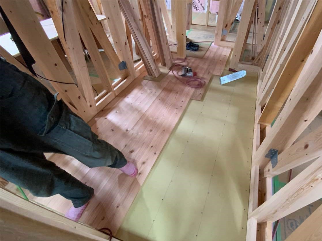 s戸棟梁が、2階の床材を張っている様子です。2階の床には少しでも遮音性を高める為に構造用合板の上にプラスターボードを張っています。床が柔らかい杉材なので、s戸棟梁は内履きを脱いで靴下で施工する派。大工さん達の気遣いが感じられる場面です👍
