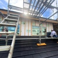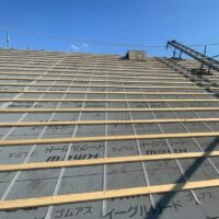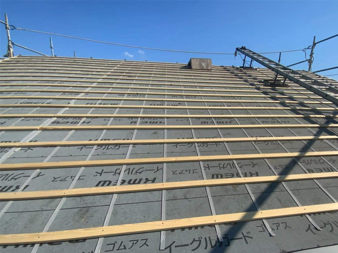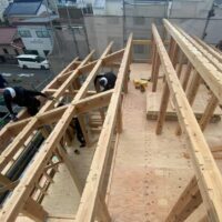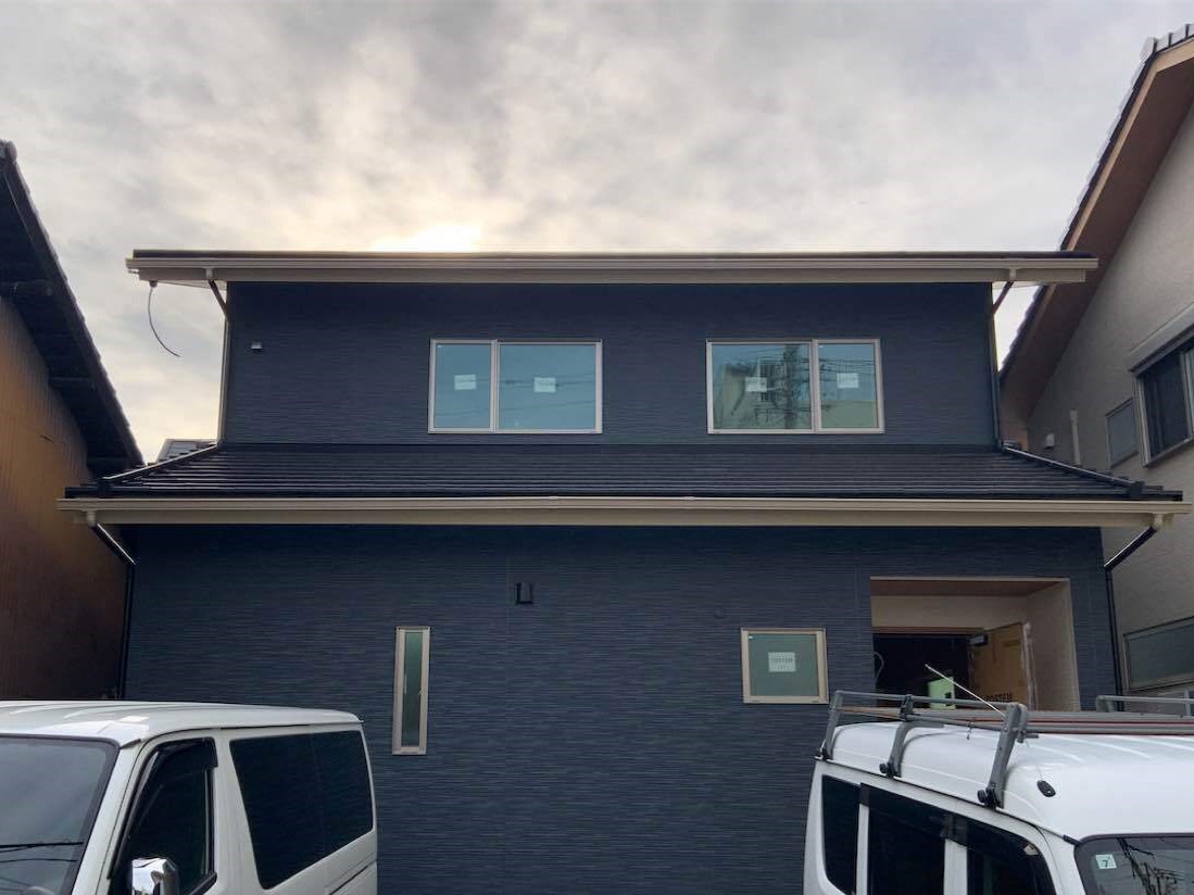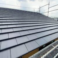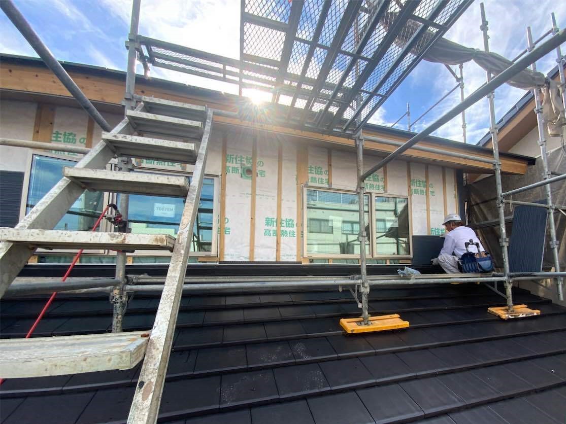 まだまだ、瓦屋さんには厳しい猛暑が続いています💦すっきりとした印象のフラットタイプの平板瓦です。瓦は重たいですが、許容応力度計算によって構造部材断面や耐力壁を検討し、等級3を確保しています。昔は瓦は土葺きされていましたが、現代は全ての瓦を釘・ビス等で留め付けていますので、地震や台風時にも安心です。業界団体では、阪神淡路大震災を受けて、ガイドラインを平成13年に作成されていたそうですが、建築基準法ではやっと令和4年(2年前)にすべての瓦を緊結する事が義務化されました。びっくりするくらい遅い義務化だったんですね・・・。