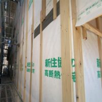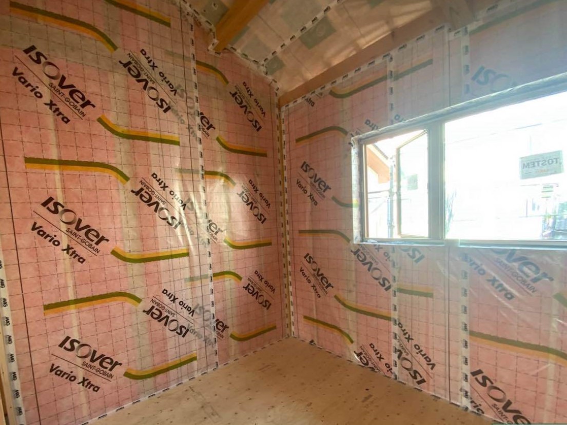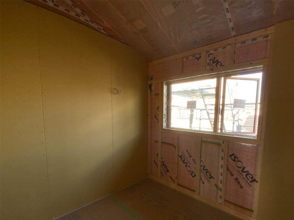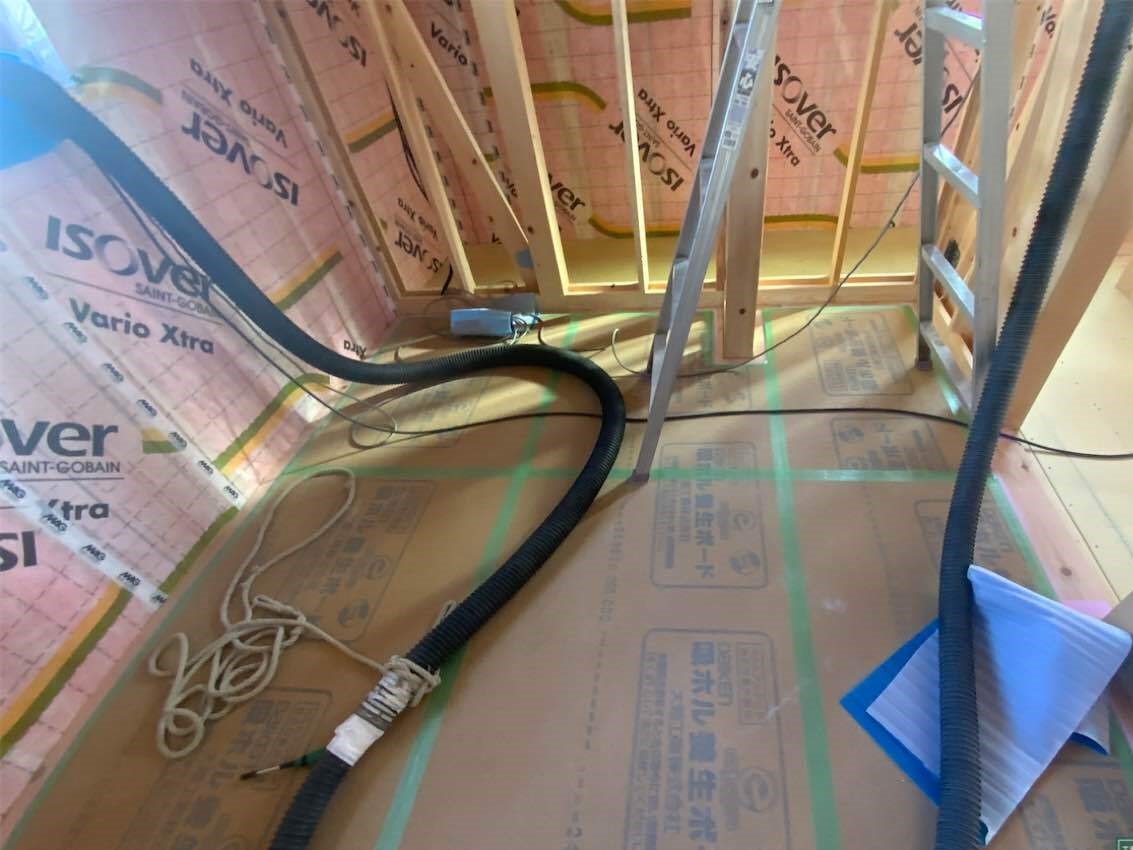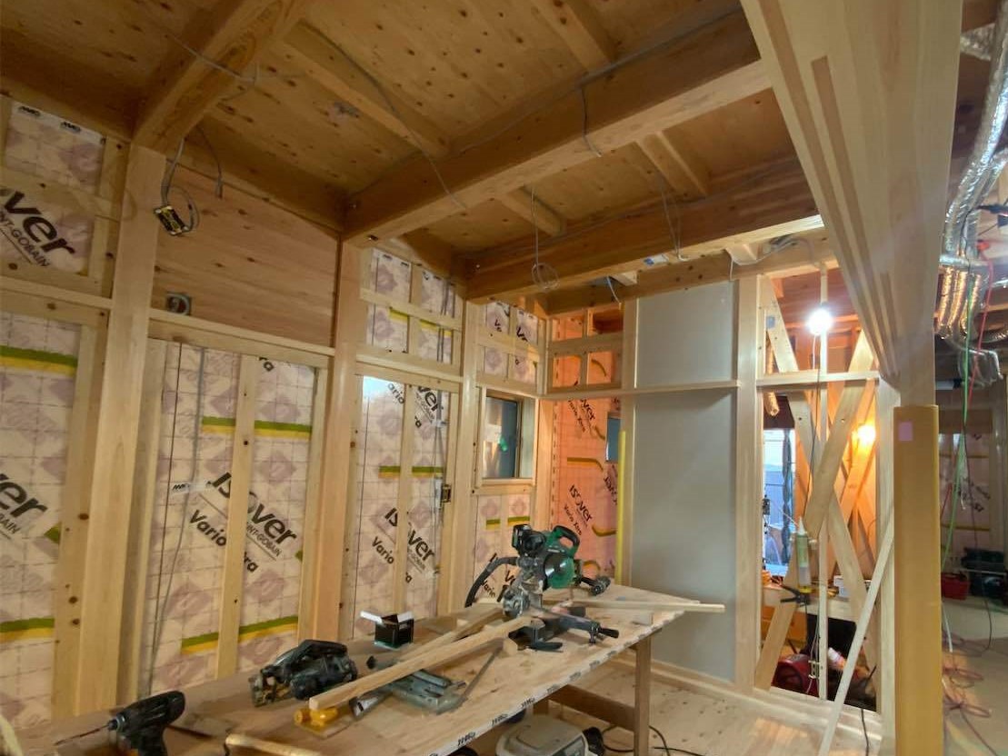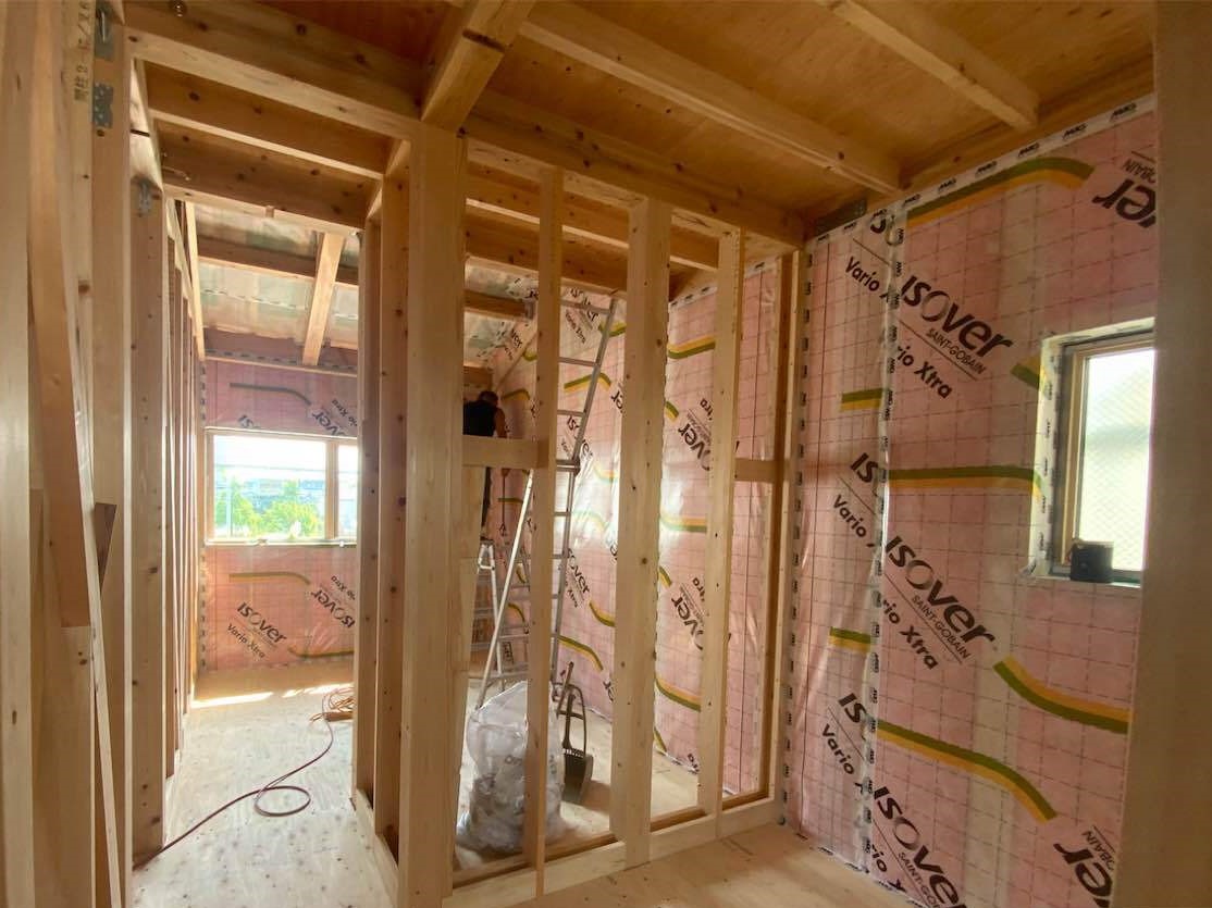 内部は、可変性調湿気密シートを張り終えています。可変性調湿気密シートは、冬期と夏期における異なる湿気対策に有効な気密シートです。気密をとりつつ、建物の構造躯体を湿気から守ってくれる役割も担ってくれます。