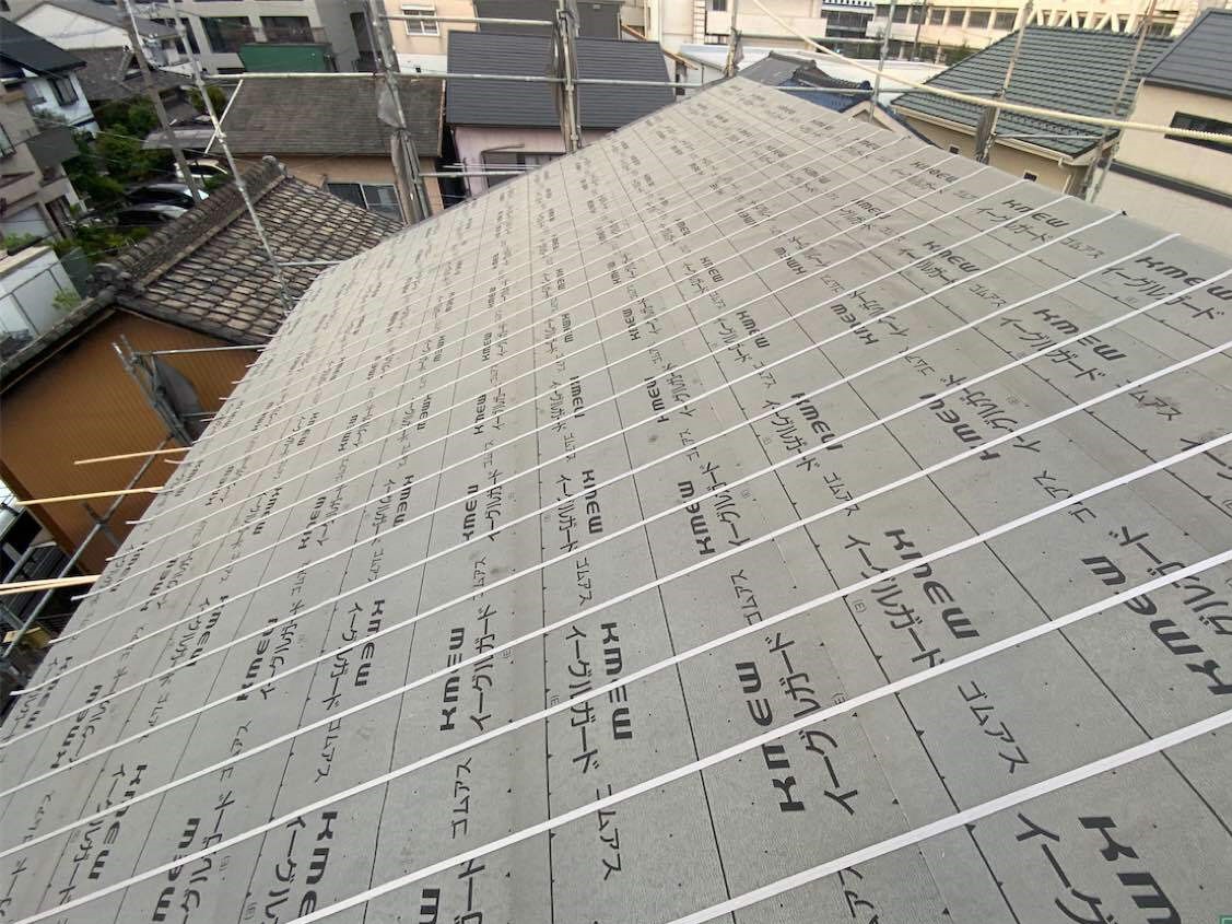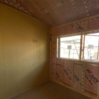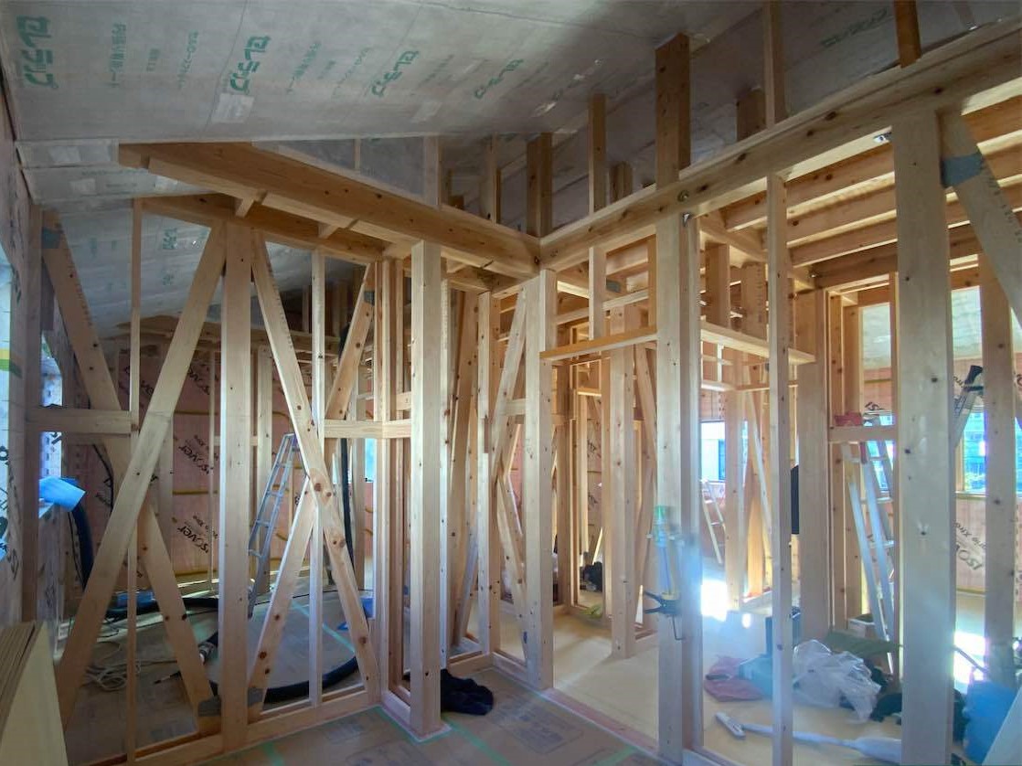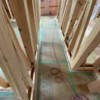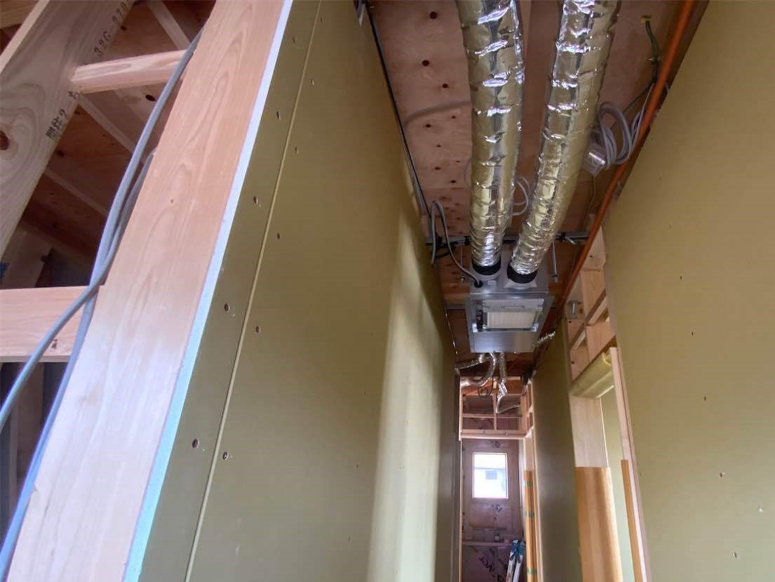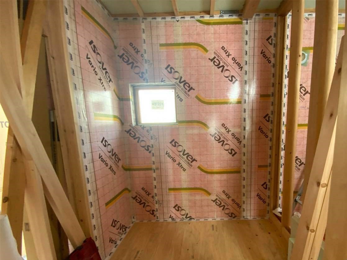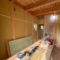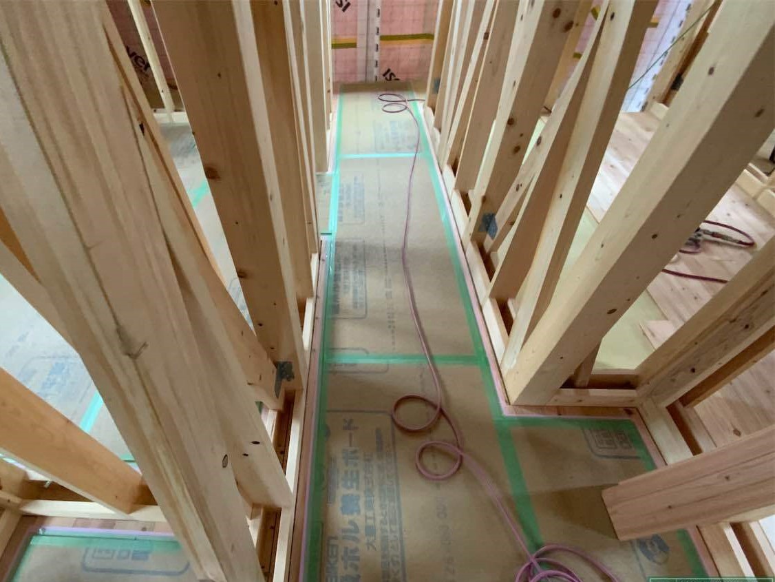 内部は、可変性調湿気密シートを張り終えています。可変性調湿気密シートは、冬期と夏期における異なる湿気対策に有効な気密シートです。気密をとりつつ、建物の構造躯体を湿気から守ってくれる役割も担ってくれます。