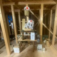 内部は、今回勾配天井が多いので屋根断熱とし、セルロースファイバーを施しました。施工直後は現場内がモクモクしています。