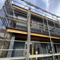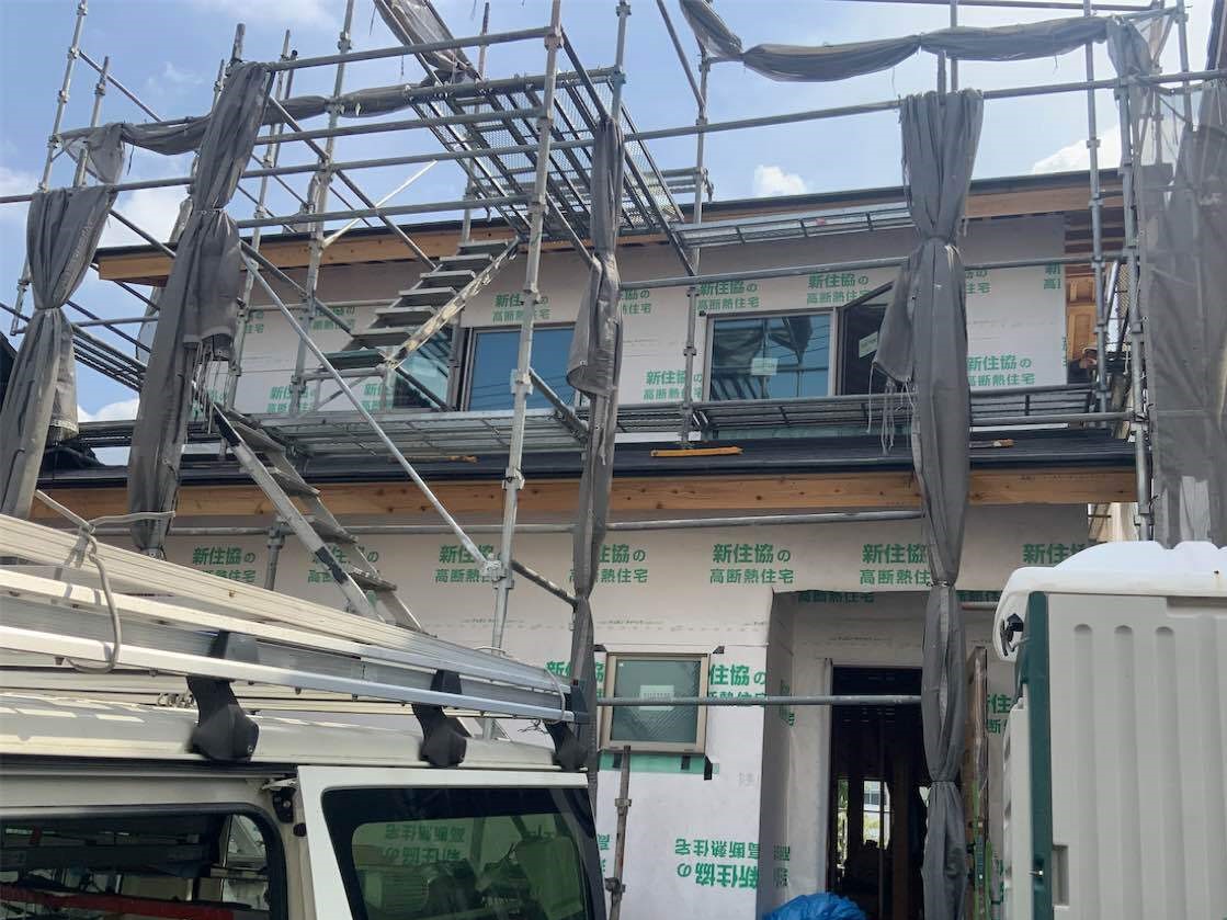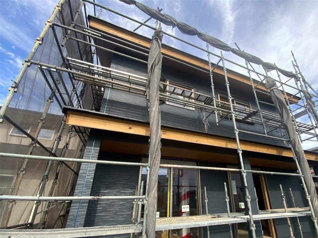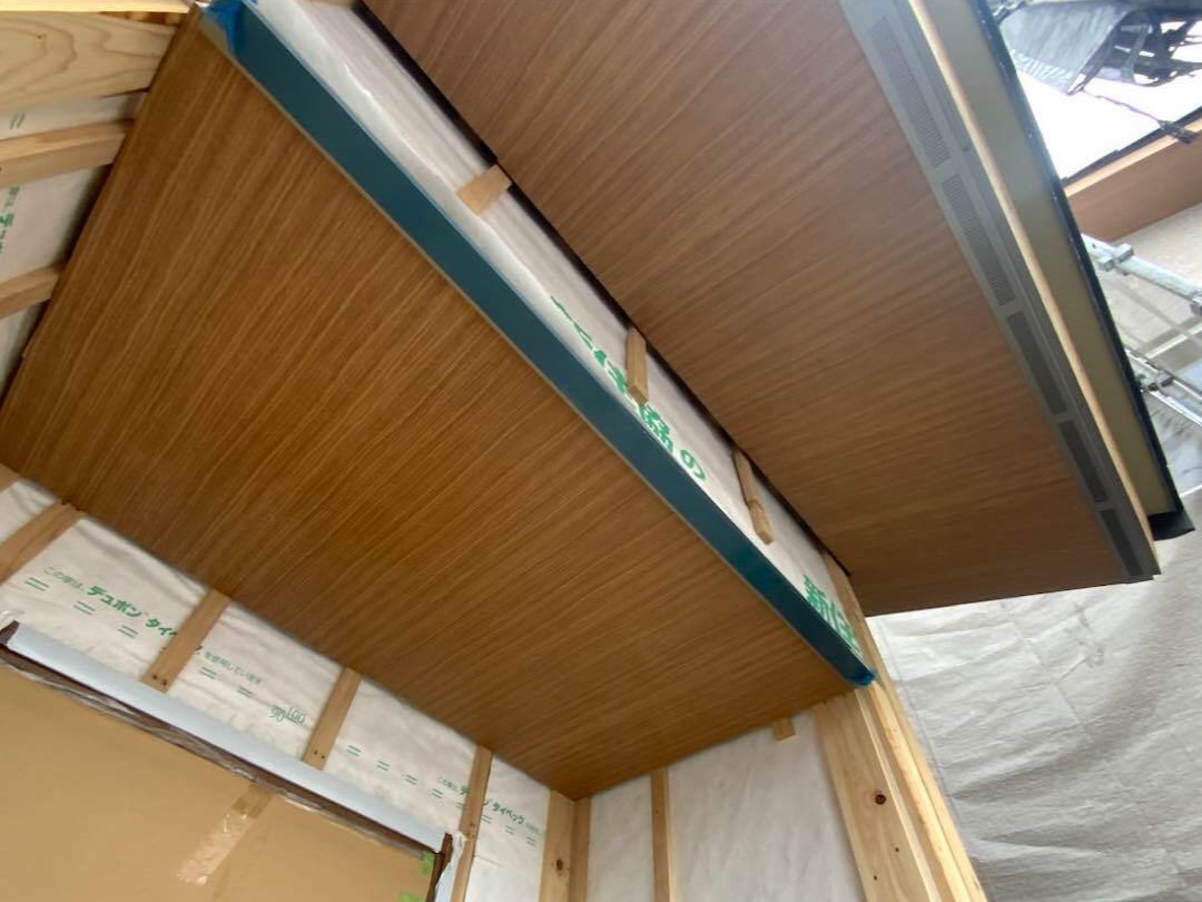 外部は、軒裏のサイディングを張り終えました。準防火地域の為、軒裏に防火の定めがあります。木の雰囲気を出すために木目調のサイディングを選ばれました。