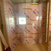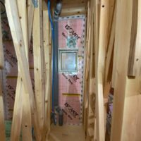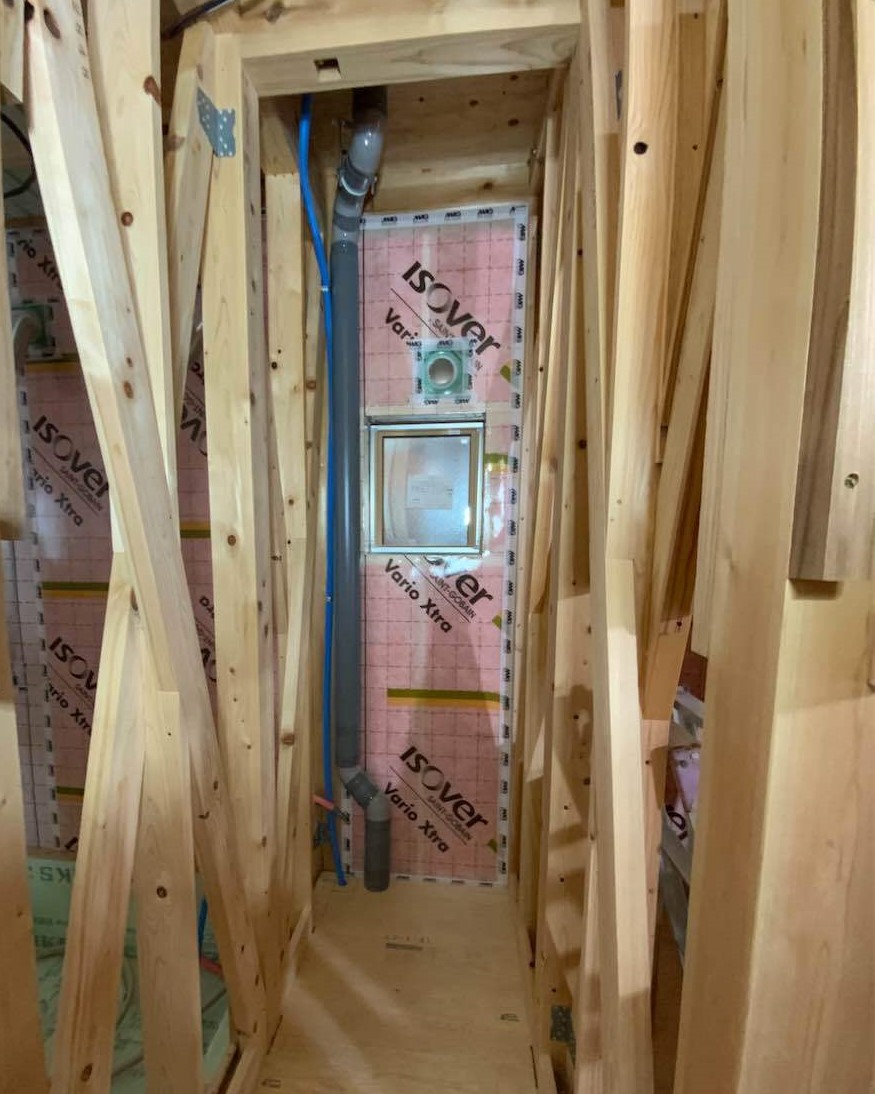 外壁も、s戸棟梁により付加断熱と防湿気密シートを綺麗に張り終わり、f井電気のh場さんがダクトや配線のスリーブを開けに来ています。