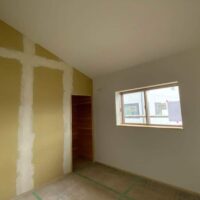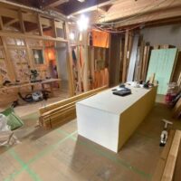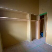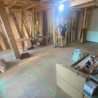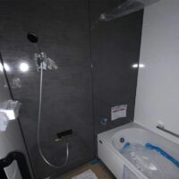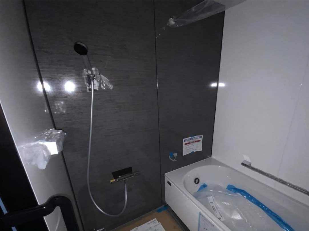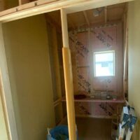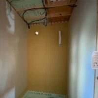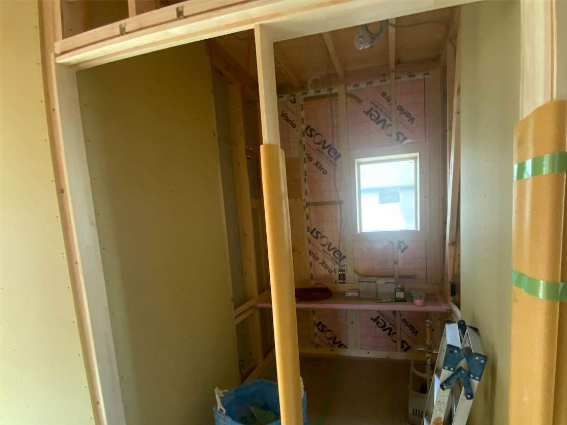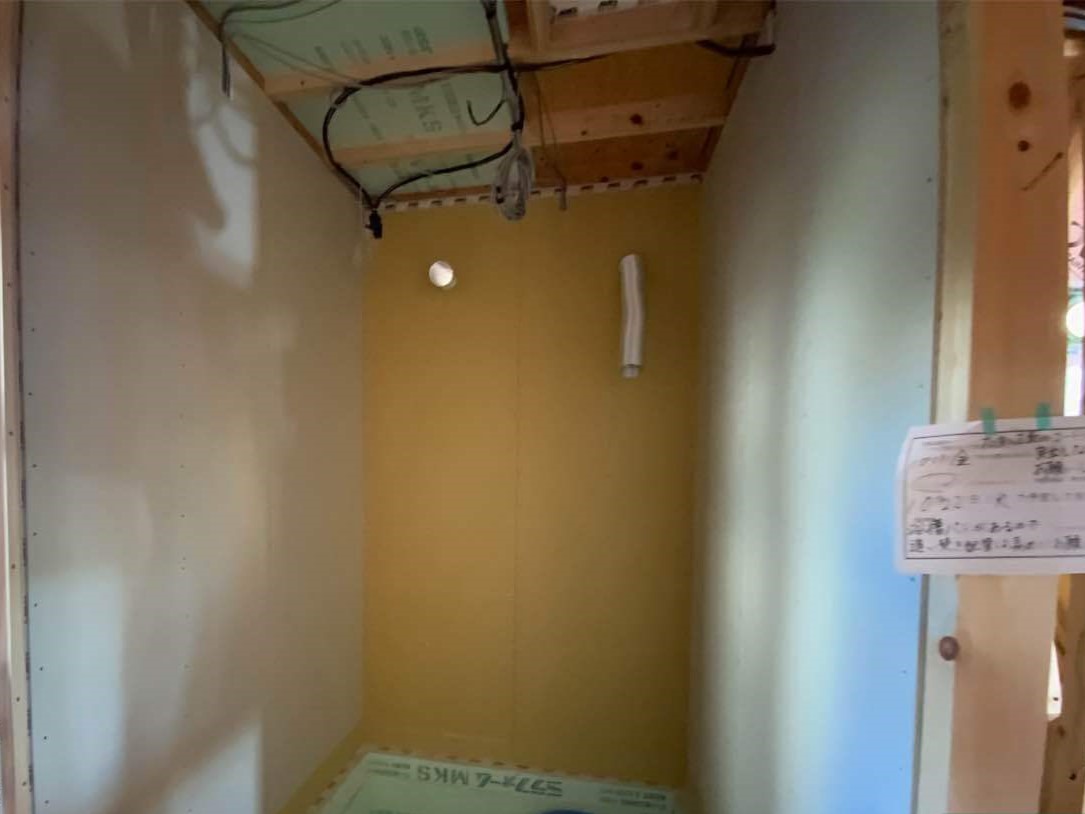 ユニットバスの施工に向けて、据え付けられる部分は、ダクトや配線工事、プラスターボード張りを終えています。