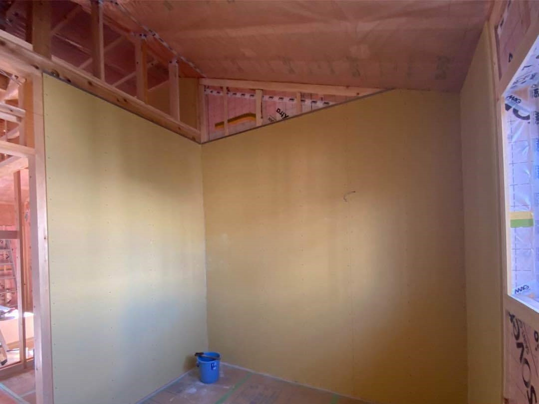 s戸棟梁、2階の床を張り終えて、壁のプラスターボードを張っています。