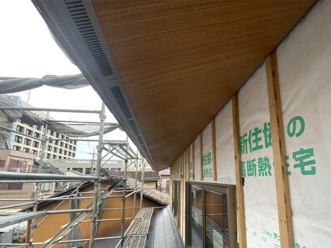 外部は、通気胴縁と軒裏の下地を施工しています。
