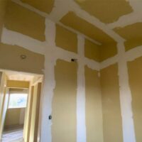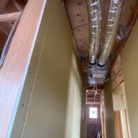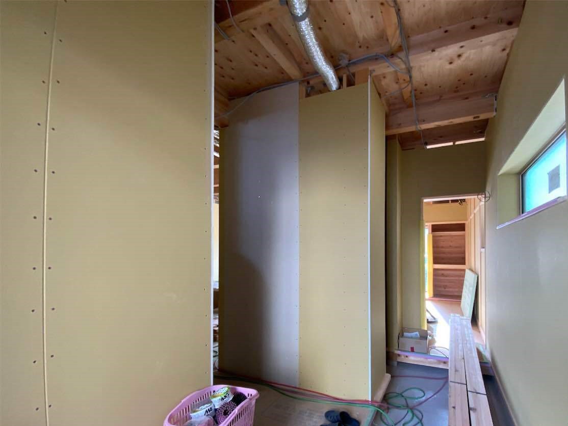 ひっぱりダコのf井電気h場さんの配線やダクト工事が何とか進み、プラスターボードを張っています。