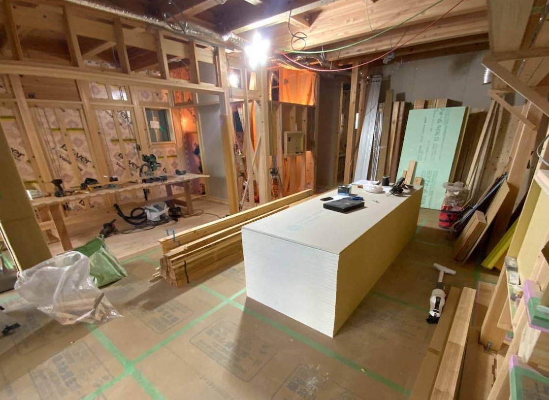 昨日のキッチン施工中の様子です。今回はフラット対面のキッチンです。キッチンが据え付けられると、ぐっと雰囲気が変わります。