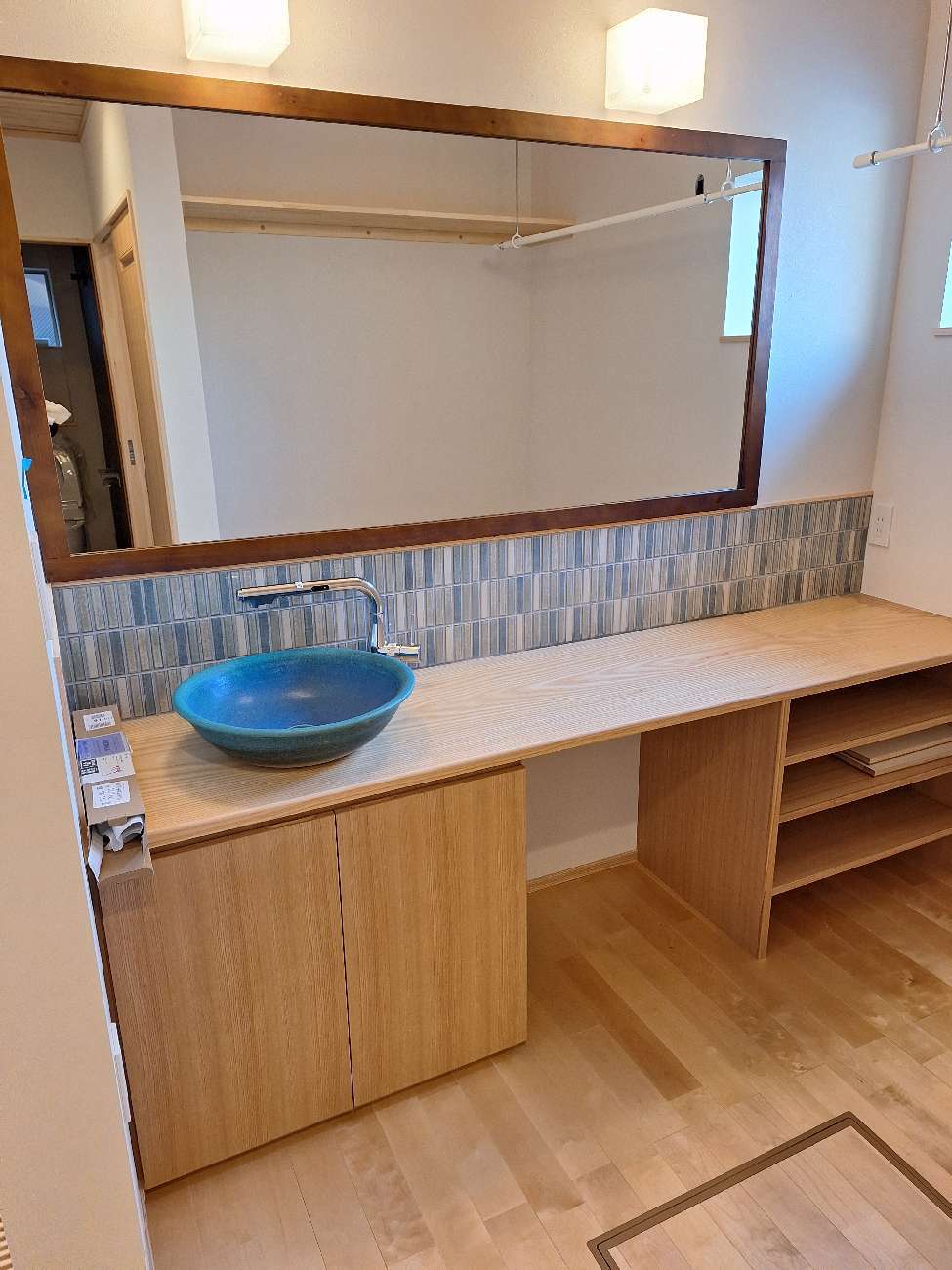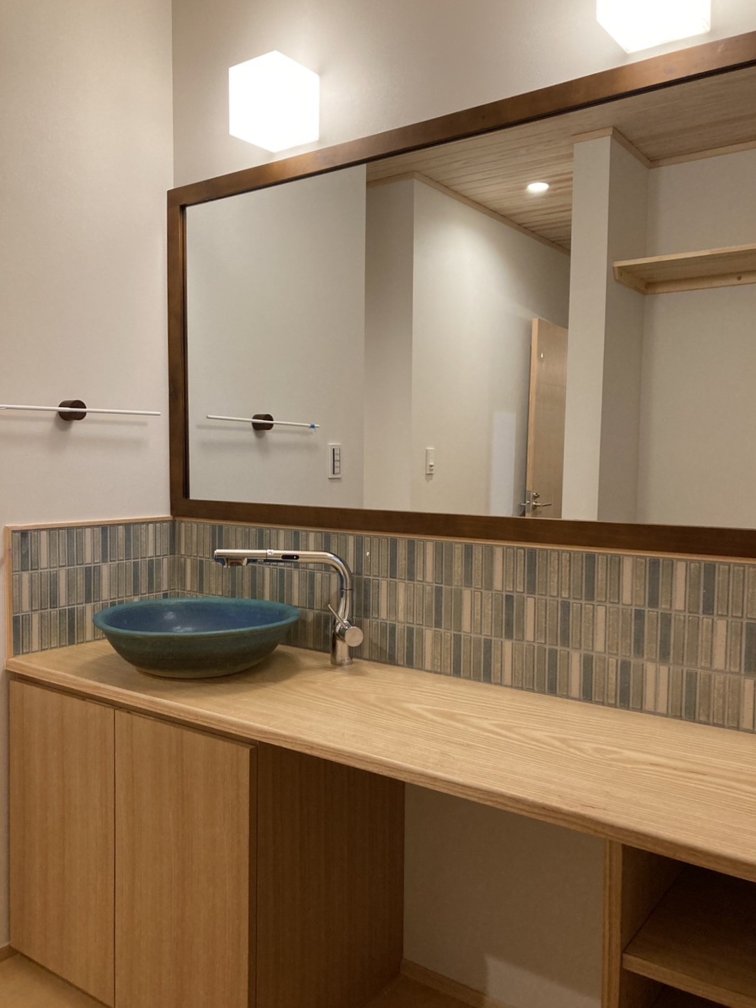 こだわられた、洗面化粧台。天板は、ホワイトアッシュの一枚板にオイル塗装を2回塗りしています。一枚ものなので、ご自身でメンテナンスがしやすいようにオイル塗装としました。水栓はなるべく天板に水が落ちない様に、自動水栓を採用。タイルは、名古屋モザイクのイリーデ。美濃焼きのタイルで、和のテイストがお好きな方に人気のタイルです。支給されたボールとても合っています👍