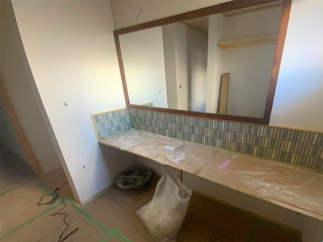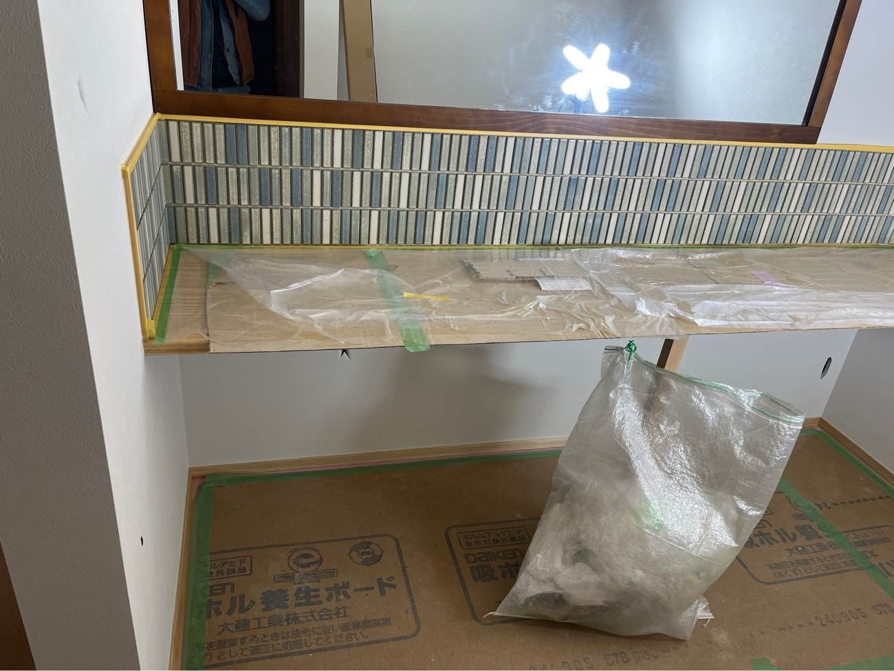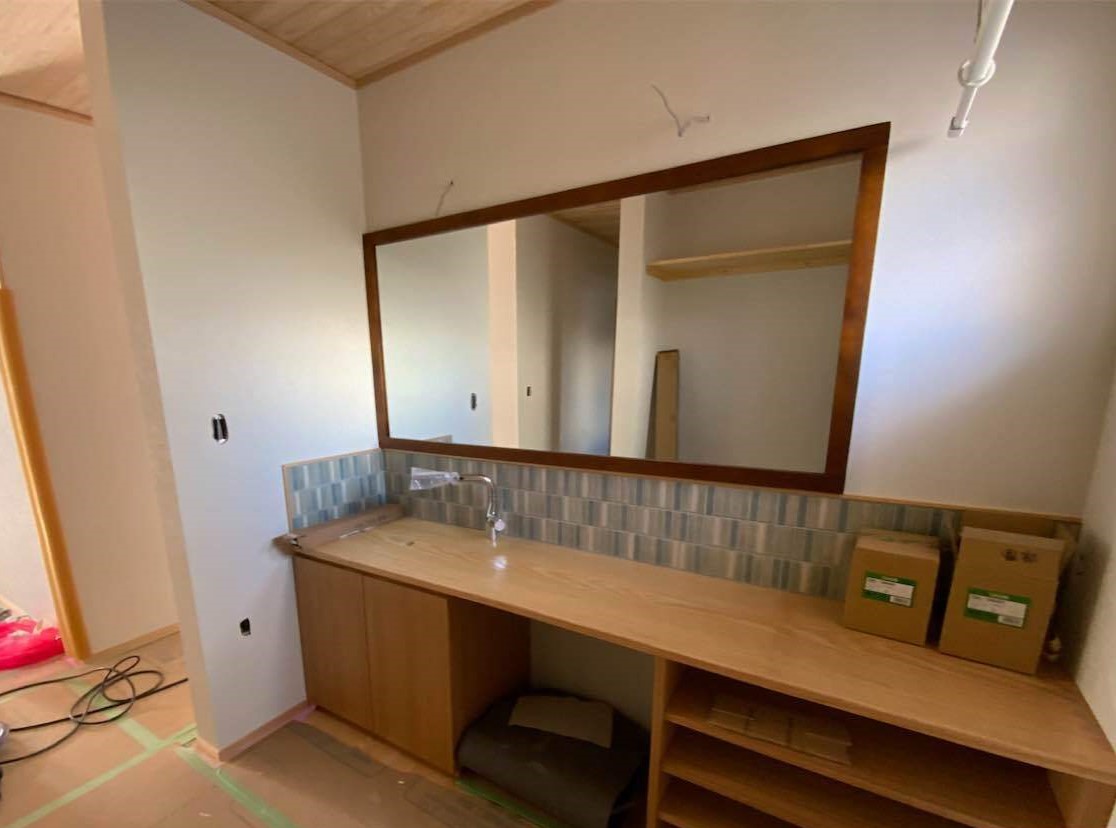 y本左官さんが、キッチン上の漆喰塗り、タイル貼り工事に来ています。鏡はk様が購入されたものを設置。色が微妙に💦ネットで買われると実際の色と違って見える事もあるので少し注意が必要ですね。