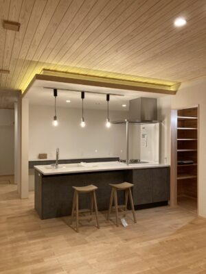 建物が完成し、外構工事が進んでいます。都心部の為、駐車の関係で見学会が開催できなかったので、社内検査の際に少し写真を撮らせていただきました。どこかに間接照明を入れたい!との事で、キッチン部分を一段下げて間接照明を入れました。ガスコンロを採用され天井の仕上げを変えなければいけなかったので、ちょうど良い感じになりました👍