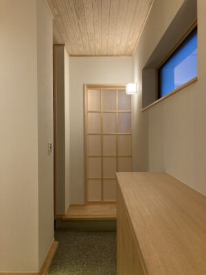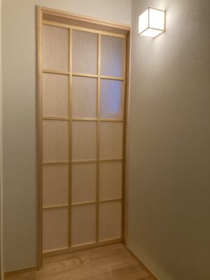玄関のドアを開けると、細長い土間空間。突き当りの障子は和室へと繋がっています。ちょっとした旅館のような雰囲気になりました。