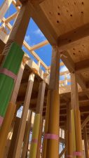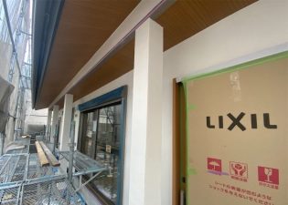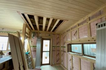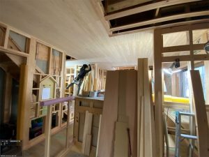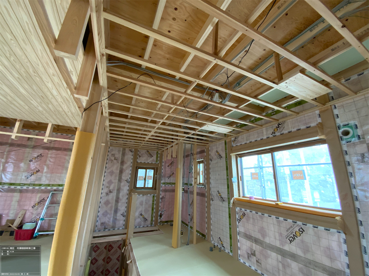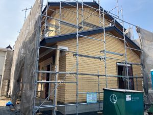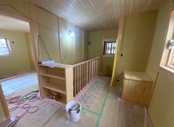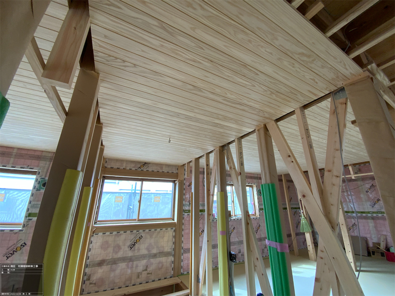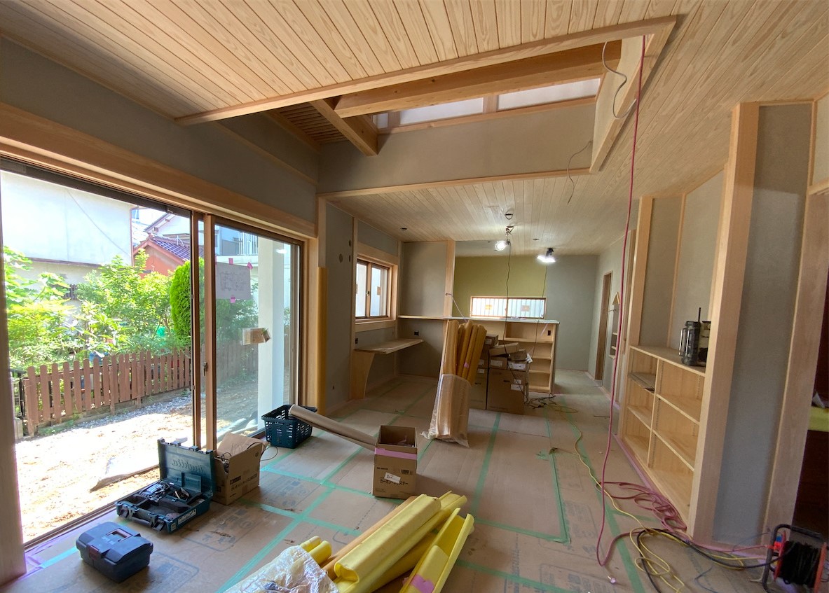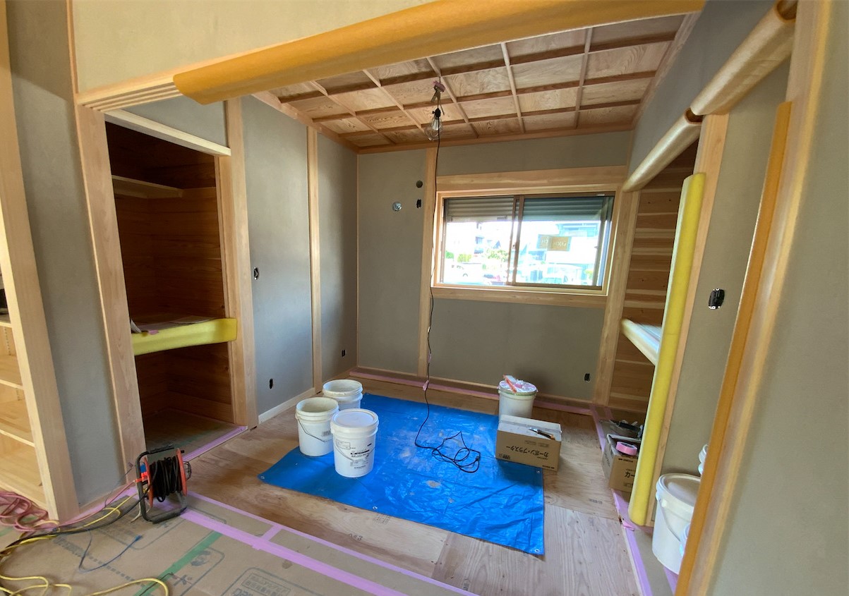 漆喰仕上げの外部にはラス下地が取り付けられました。室内は天井下地が施され、白っぽい無地の杉羽目板張りが進んでいます。