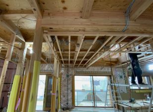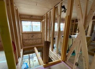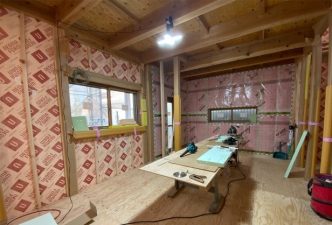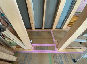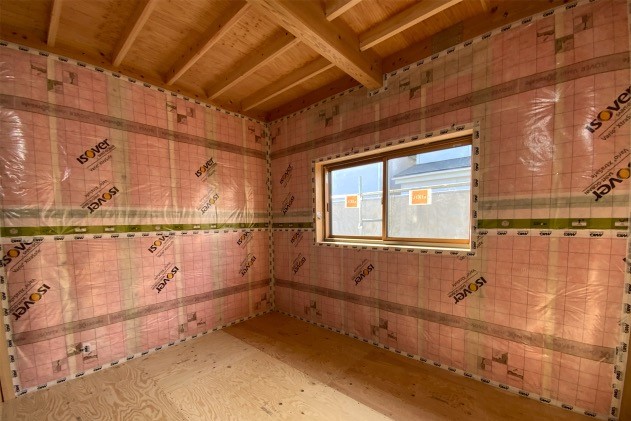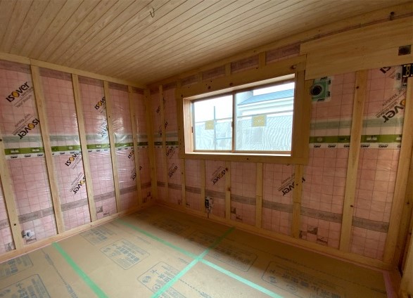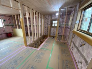 室内の断熱施工も進んでいます。真壁の部分は壁が薄くなるため、厚みが少ない断熱性の良いネオマフォーム66㎜、大壁には高性能グラスウール120㎜を充填します。