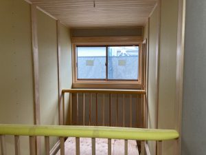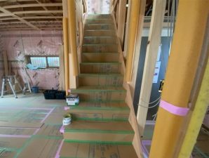 柱があらわしになる真壁部分が多く、行き来の多い階段の化粧柱にもしっかり養生をします。